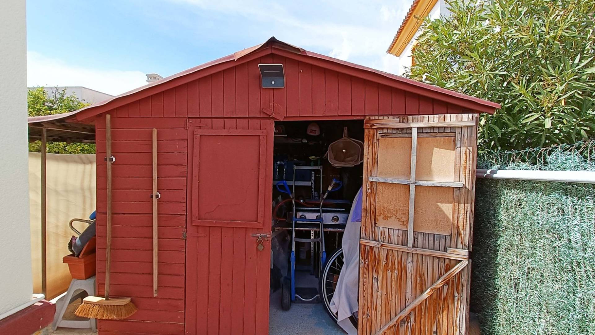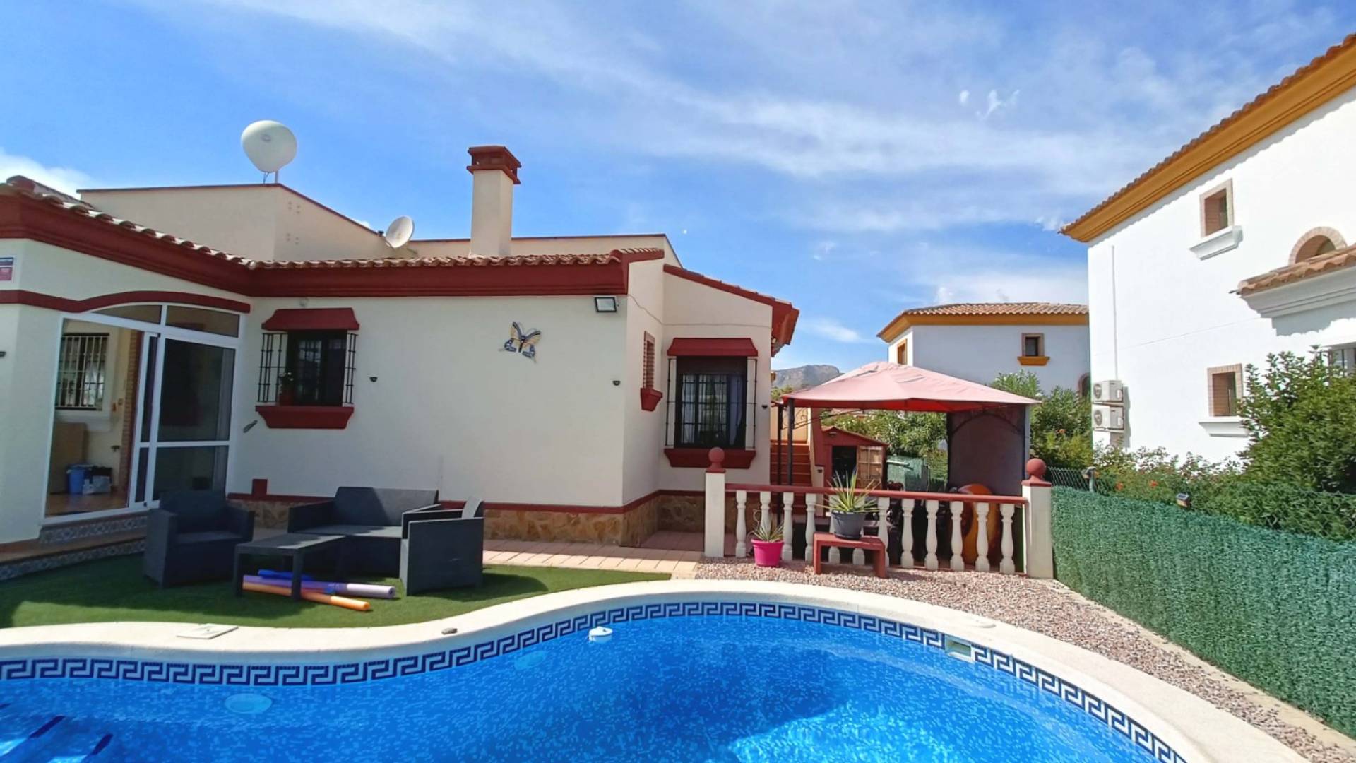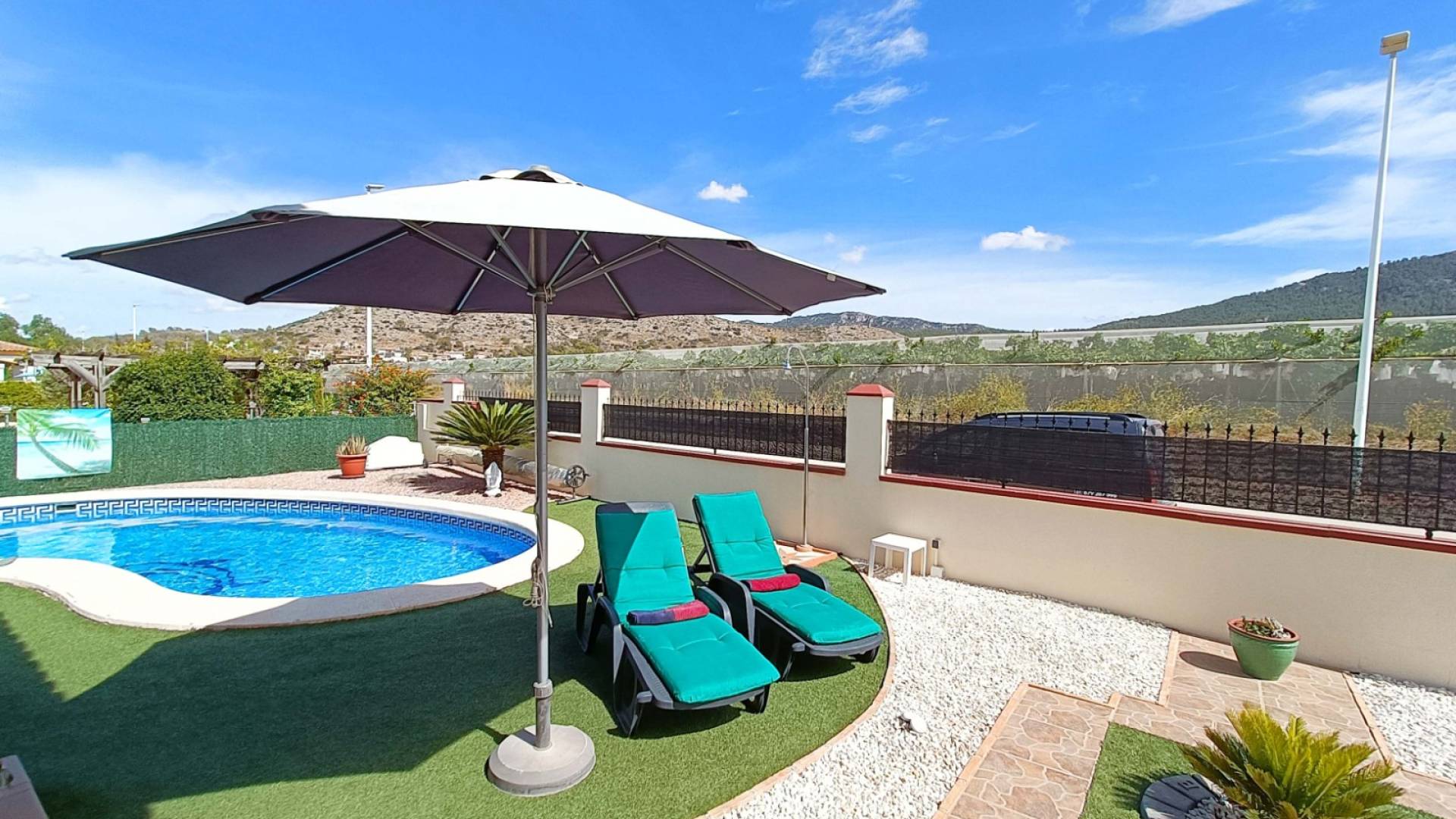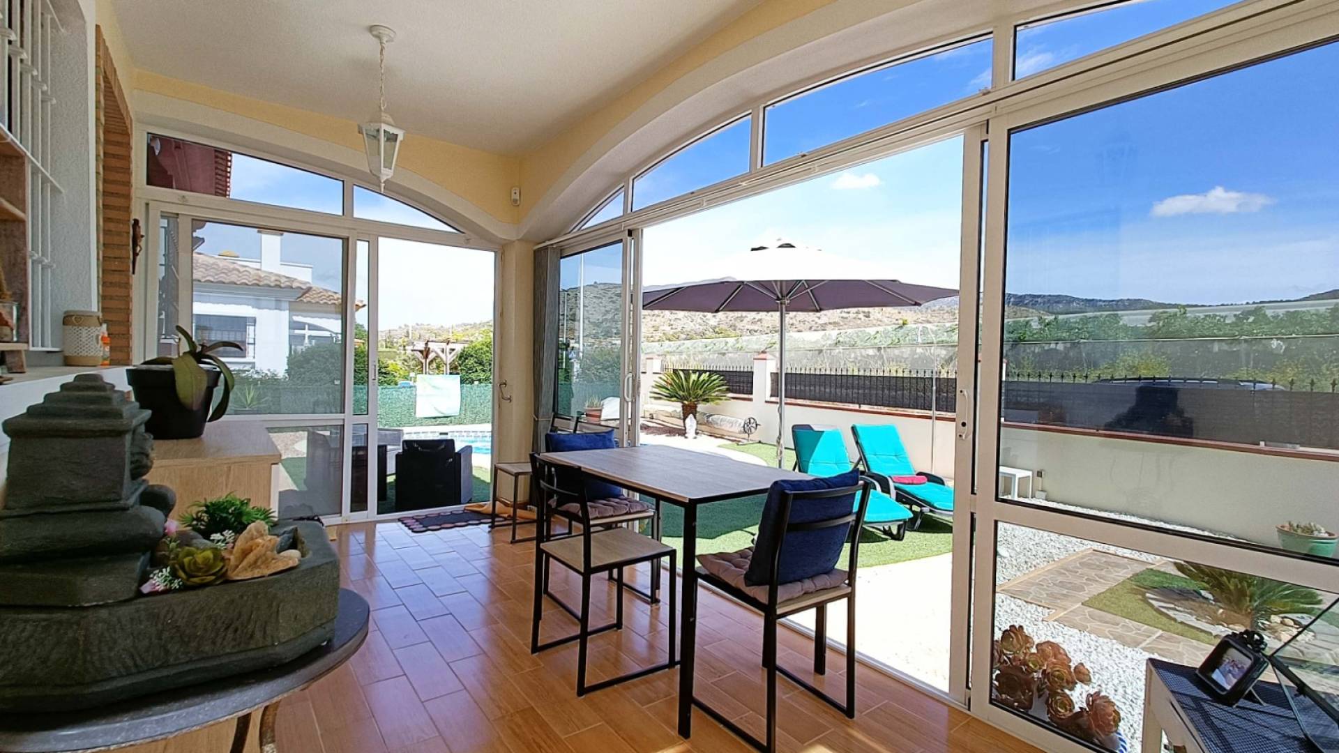 El verdadero corazón de esta casa se encuentra en el exterior. Disfruta de tu piscina privada rodeada de jardines, relájate en el porche acristalado contemplando las montañas o toma el sol en el solárium con vistas panorámicas. La terraza que rodea la villa, el carport y la casita de madera para herramientas completan un espacio pensado para vivir plenamente al aire libre. La propiedad está totalmente vallada para tu privacidad y las luces exteriores crean un ambiente mágico por la noche.