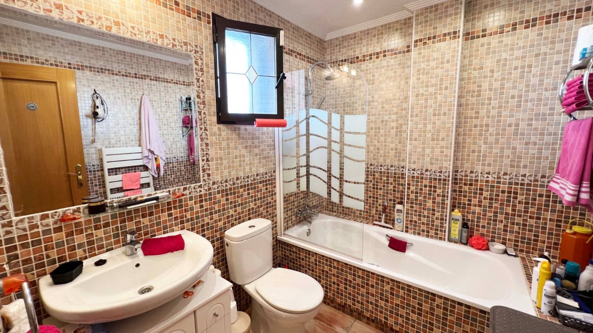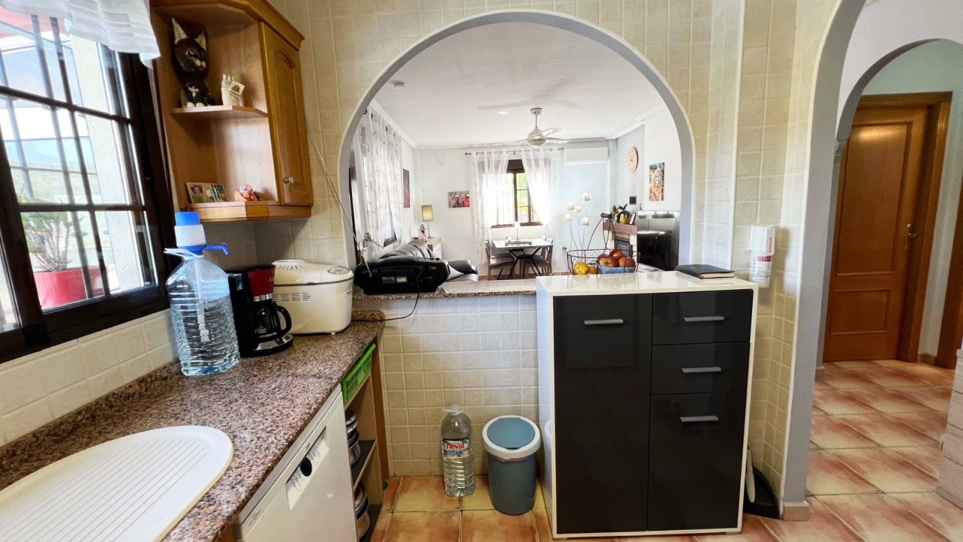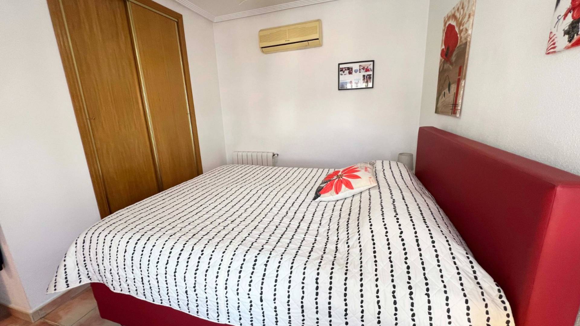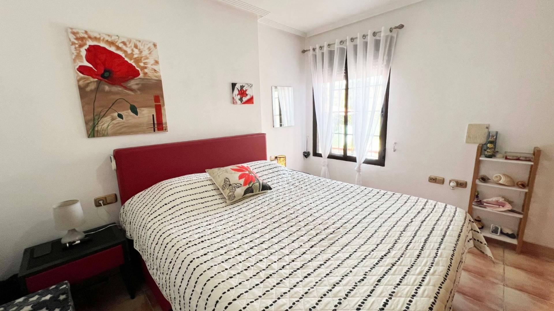 La villa cuenta con tres dormitorios espaciosos y luminosos, todos con armarios empotrados, mientras que el dormitorio principal dispone de baño en suite y aire acondicionado, ofreciendo un refugio privado y confortable. Un segundo baño completo da servicio a los otros dormitorios, y la vivienda está equipada con calefacción central de gas, asegurando confort durante todo el año.