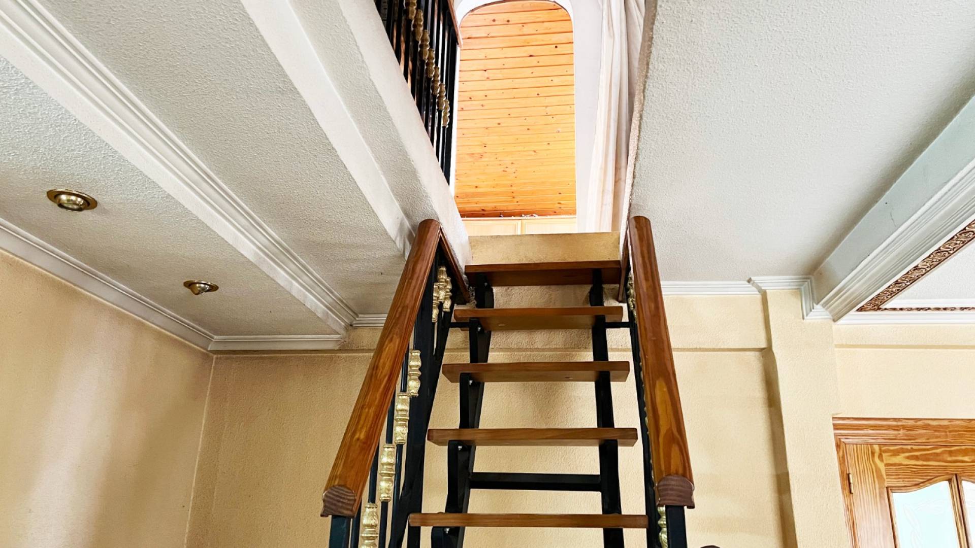 La casa se distribuye en dos plantas, cada una con su propio carácter. Accedemos a la primera planta a través de una elegante escalinata que nos conduce a un balcón panorámico con vistas de 360º. Al entrar, nos recibe un amplio y luminoso salón comedor con cocina abierta completamente equipada. Tres generosos dormitorios con armarios empotrados y un baño familiar completan este nivel. Desde el comedor, una escalera metálica nos lleva a una buhardilla, actualmente utilizada como trastero.