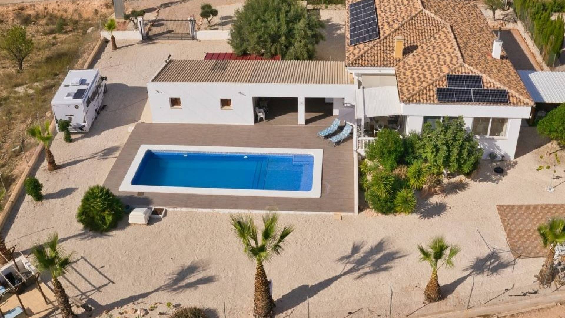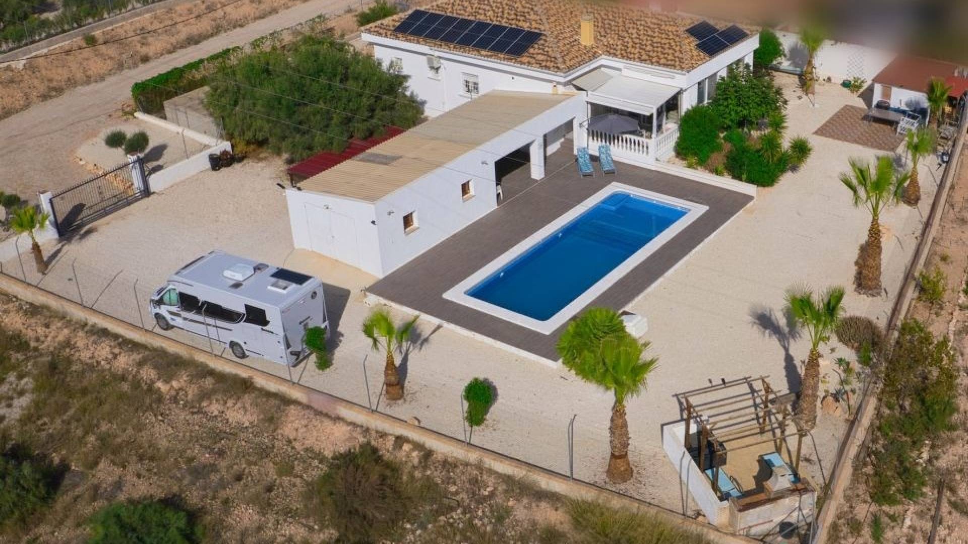 Los exteriores incluyen también un gran garaje embaldosado, una segunda pérgola con jacuzzi, una pista de petanca de 12 x 4 m, dos casetas de almacenamiento, una zona de barbacoa y un carport adicional.