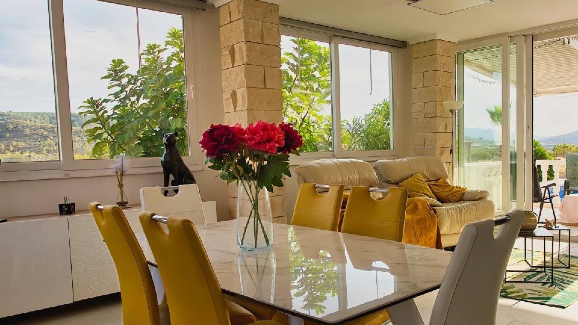 En cuanto a confort y seguridad, la villa está equipada con alarma Verisure con cámaras interiores y exteriores, fibra óptica hasta 1 Gb, conexión 5G, y un sistema fotovoltaico de 5.800 W que reduce el consumo eléctrico hasta en 70%.