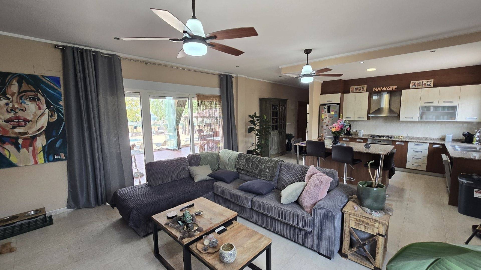 Desde la veranda, se accede a la vivienda a través de la puerta principal de madera o mediante grandes puertas correderas que dan al salón. El salón está decorado con gusto, es luminoso y espacioso, con una acogedora estufa de leña y una amplia zona de estar para familiares e invitados. Se conecta a la perfección con la moderna cocina equipada, que incluye una gran isla que funciona como barra americana y ofrece mucho espacio de almacenamiento. Un potente sistema de aire acondicionado en el salón garantiza el confort durante todo el año. Las puertas corredizas permiten disfrutar de las impresionantes vistas a la montaña desde el interior.