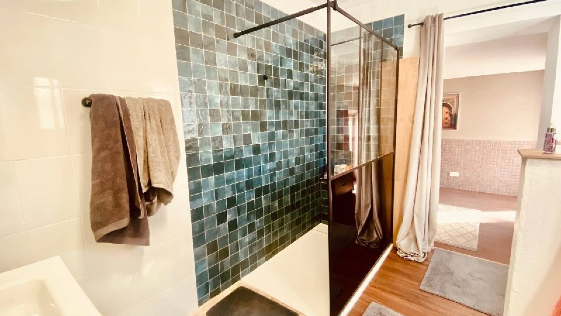Desde aquí, se accede a un lavadero (11 m²), un bonito dormitorio y un cuarto de ducha con WC que ofrece todas las comodidades necesarias.