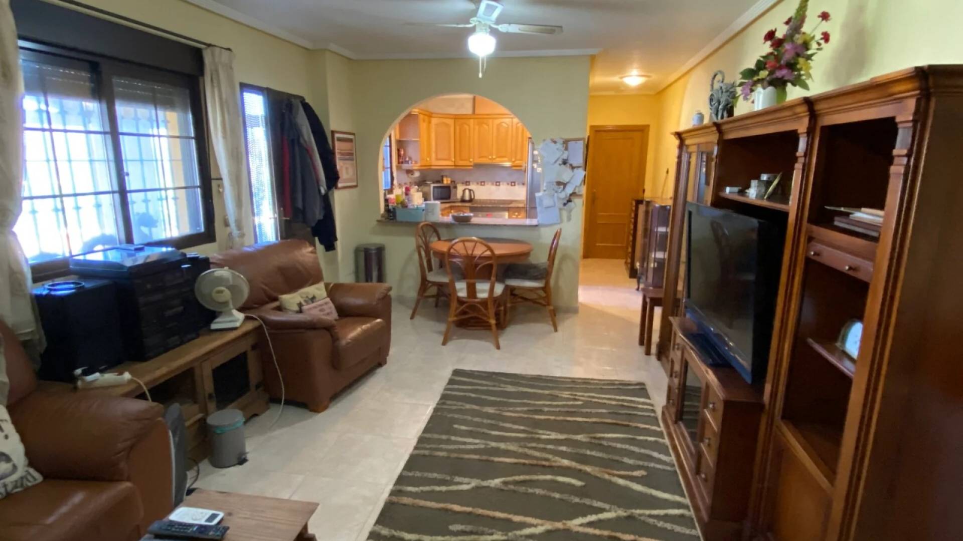 Acceda a la villa a través de la naya acristalada y disfrute de impresionantes vistas del Valle de Hondón. El amplio salón cuenta con aire acondicionado, chimenea y calefacción central, mientras que las puertas francesas se abren a una terraza elevada ideal para comer al aire libre o tomar el sol. La cocina totalmente equipada es luminosa y funcional, con una buena gama de muebles y vistas a las colinas circundantes.