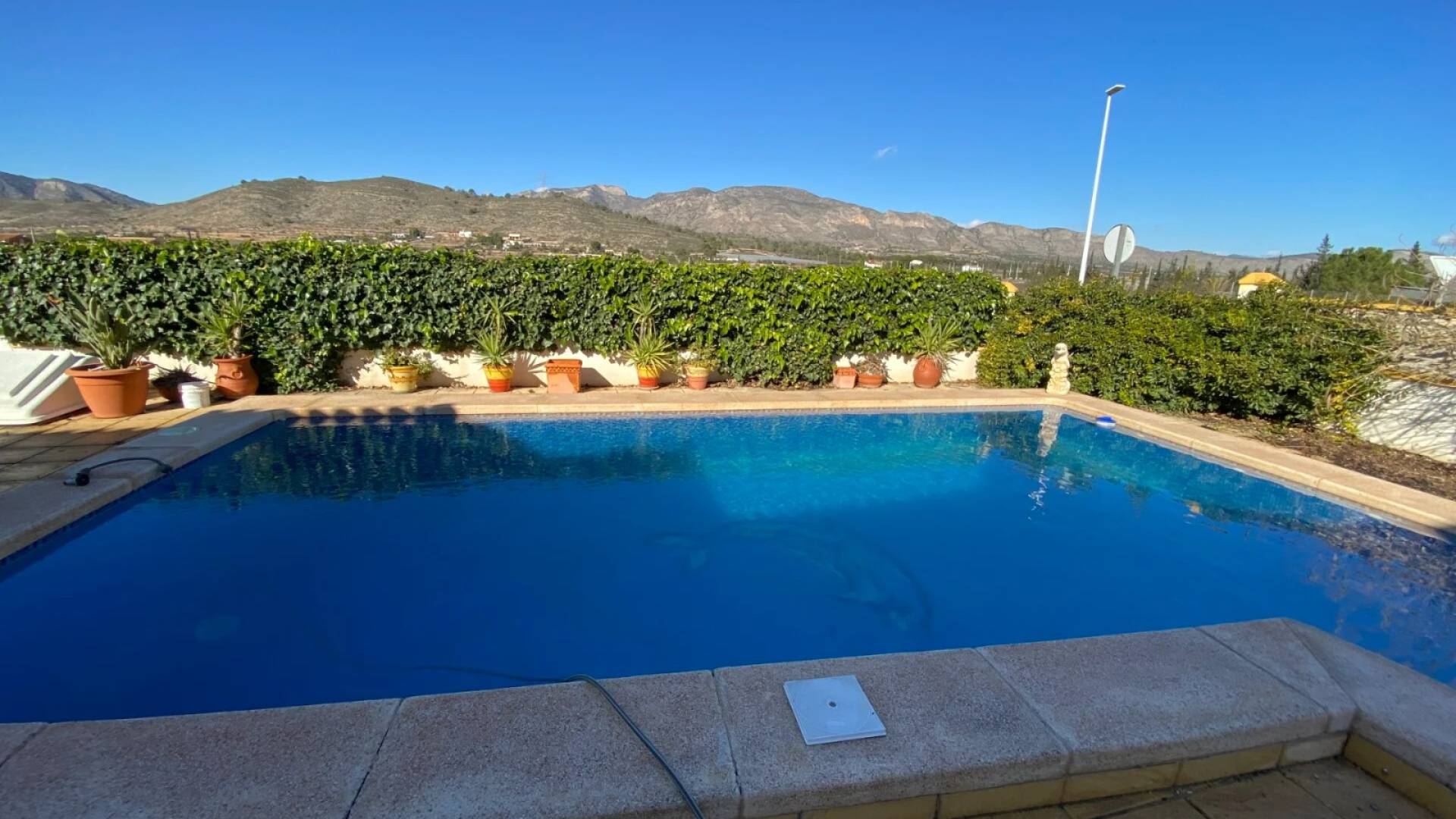 La villa se accede mediante puerta peatonal o doble puerta para vehículos, ofreciendo aparcamiento fuera de la carretera. La piscina privada se encuentra en la parte delantera, rodeada de espacio para tomar el sol y jardines bien cuidados con plantas establecidas. En la parte trasera, hay un pequeño cuarto de lavandería y un gran cobertizo de madera con electricidad. Una terraza elevada en el lateral proporciona el lugar perfecto para disfrutar del aire libre, accesible desde el salón y la parte trasera de la vivienda. El solárium en la azotea completa la propiedad con vistas panorámicas espectaculares del Valle de Hondón.