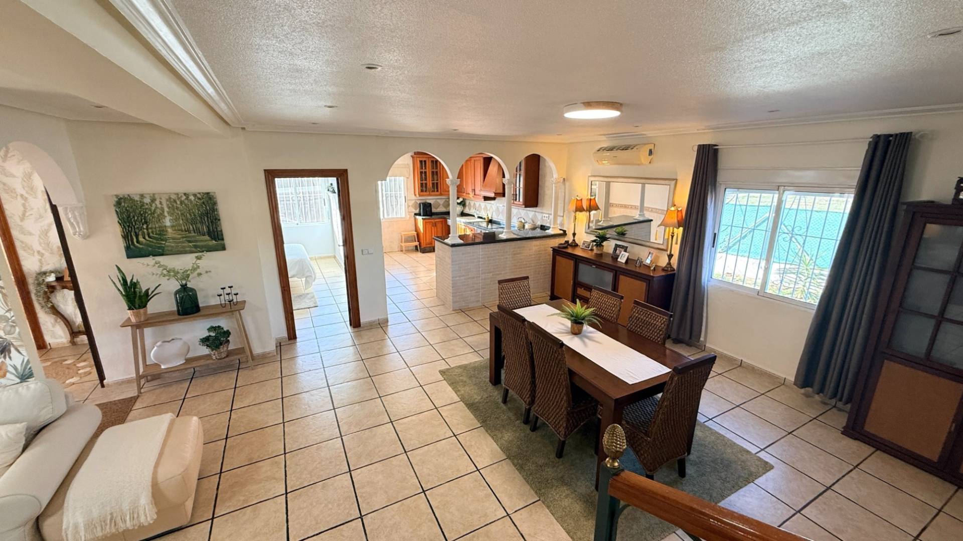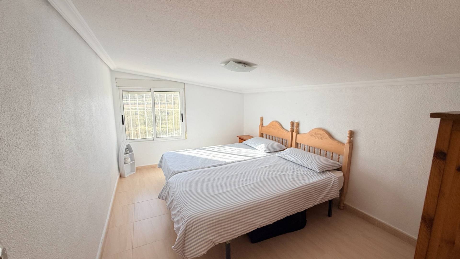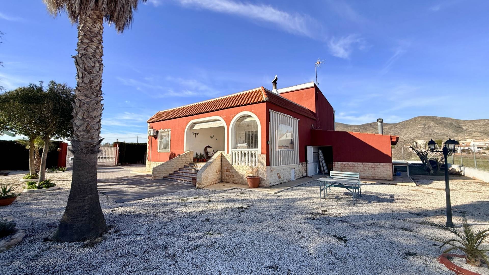 Muchos clientes nos piden una propiedad que ofrezca tranquilidad absoluta y, al mismo tiempo, la posibilidad de ir andando a bares, restaurantes y tiendas. Encontrar algo así no es fácil en el Valle de Hondón… pero esta villa cumple todos los requisitos. Situada a solo un par de minutos a pie del encantador pueblo de Hondón de los Frailes, esta villa orientada al sur ofrece lo mejor de ambos mundos. Rodeada de campo, con un olivar como vecino más cercano, y a la vez a un paseo llano del centro del pueblo con todos los servicios: tiendas, bares, restaurantes, cafeterías y centro médico. La propiedad se asienta sobre una parcela llana y vallada de 1.151 m², con acceso mediante una puerta corredera eléctrica de hierro con mando a distancia. Dispone de agua potable, electricidad y conexión a internet rápida. El jardín cuenta con árboles maduros que proporcionan sombra, además de higueras y olivos en la parte trasera, y múltiples zonas de plantación ideales para huerto o flores. La parcela es muy privada y las parcelas colindantes no cumplen los requisitos actuales para edificar. El acceso a la vivienda se realiza por unos pocos escalones que conducen a un porche cubierto, el espacio perfecto para vivir y disfrutar durante gran parte del año, ideal para comer, relajarse o ver la televisión al aire libre. En el interior, un luminoso recibidor distribuye las distintas estancias. El salón-comedor de concepto abierto con cocina americana es amplio, luminoso y acogedor, con estufa de leña y aire acondicionado frío/calor. La cocina ofrece abundante espacio de trabajo y almacenamiento. En la planta baja encontramos: Dos dormitorios dobles con aire acondicionado frío/calorUn baño familiar con bañera de esquina, lavabo, WC y bidé La planta superior ofrece un gran rellano, dos dormitorios adicionales (uno doble y uno individual) y un aseo. Con poca inversión, podría añadirse una ducha y crear un apartamento de invitados. El broche final es el solárium de 42 m², con vistas casi de 360° al Valle de Hondón, la Sierra de Crevillente, Murcia y el propio pueblo. Desde debajo de la escalera principal se accede a una cocina de verano con barbacoa, un espacio muy versátil que también puede usarse como trastero, taller o sala de hobbies. Además, hay dos accesos a zonas de almacenamiento de altura completa bajo la vivienda. ¿Busca una casa que combine vida de pueblo y entorno rural, con todo a mano y sin necesidad de coche?