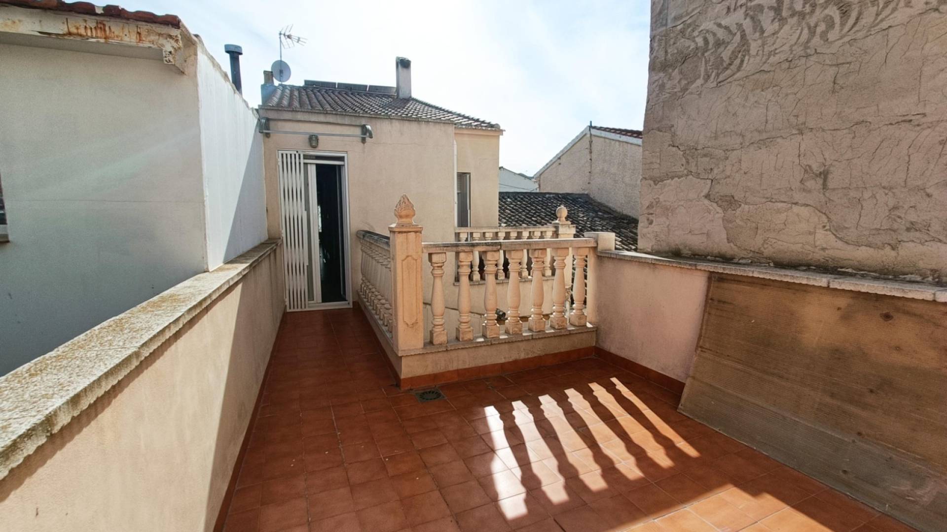En la tercera planta encontramos una habitación diáfana, actualmente utilizada como trastero, con múltiples posibilidades. Desde aquí se accede a la terraza solárium, situada en la parte más alta de la casa, con vistas a la calle principal del pueblo y donde se encuentran instaladas las placas solares: un espacio ideal para relajarse, tomar el sol o simplemente disfrutar del ambiente del pueblo desde las alturas.
