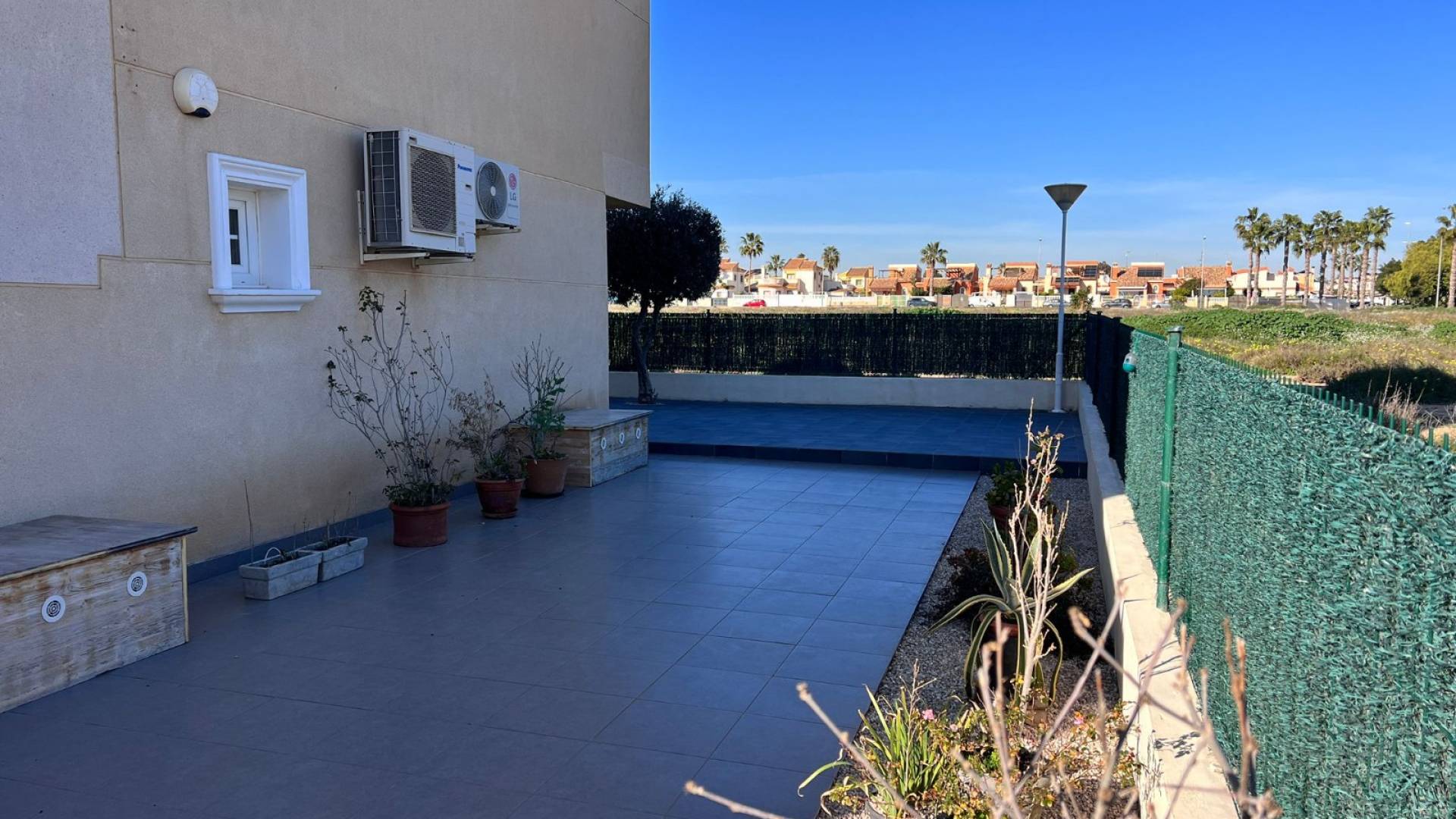 Nos complace presentar este espacioso apartamento esquinero de dos dormitorios, situado en una amplia parcela privada dentro del seguro y pequeño complejo El Raso. Con solo 12 apartamentos, este complejo cerrado ofrece una agradable combinación de tranquilidad, privacidad y comodidad. El apartamento esquinero, con orientación sur, cuenta con una excepcional cantidad de espacio exterior, lo que lo distingue de otros apartamentos similares en la zona. El complejo tiene acceso a través de un portón eléctrico e incluye un garaje seguro con una plaza de aparcamiento privada justo al lado del apartamento. En la parte delantera del edificio hay una piscina comunitaria bien cuidada rodeada de jardines maduros, así como un práctico trastero comunitario. El apartamento destaca especialmente por sus amplios espacios exteriores. En la parte delantera hay una terraza cubierta con dos trasteros, que se extiende a un amplio jardín lateral y trasero. Este espacio exterior ofrece amplias oportunidades para relajarse, entretenerse o disfrutar del agradable clima durante todo el año. En el interior, el apartamento cuenta con una luminosa sala de estar, comedor y cocina de planta abierta con puertas francesas, persianas eléctricas y aire acondicionado. Desde el pasillo se accede a dos amplios dormitorios, ambos con armarios empotrados. El dormitorio principal tiene acceso directo a la terraza trasera. También hay un espacioso baño con ducha y un práctico lavadero. Este apartamento combina la comodidad de una vivienda de bajo mantenimiento con el espacio y la privacidad que se esperan de una villa. Situado en una zona tranquila y popular, a poca distancia de la costa, de diversos servicios y de un campo de golf, presenta una atractiva y única oportunidad de vivienda.