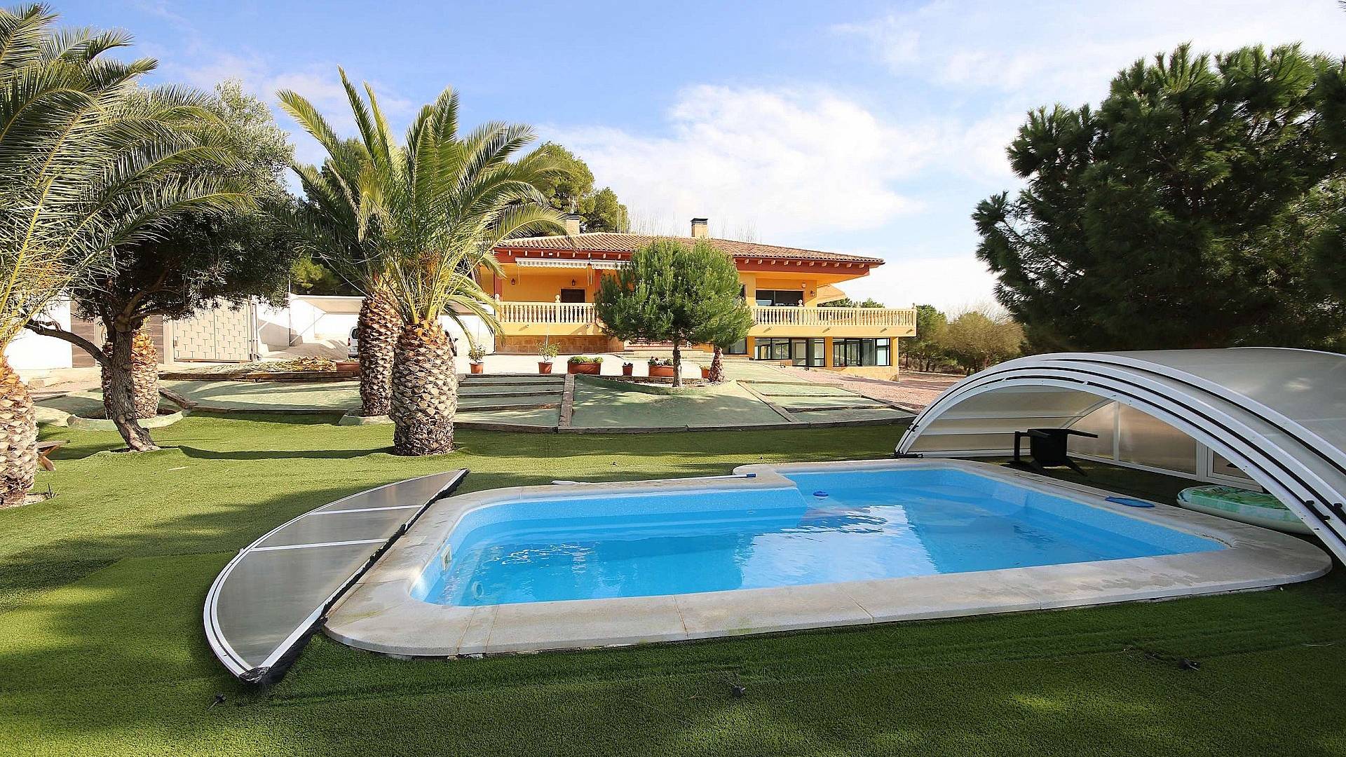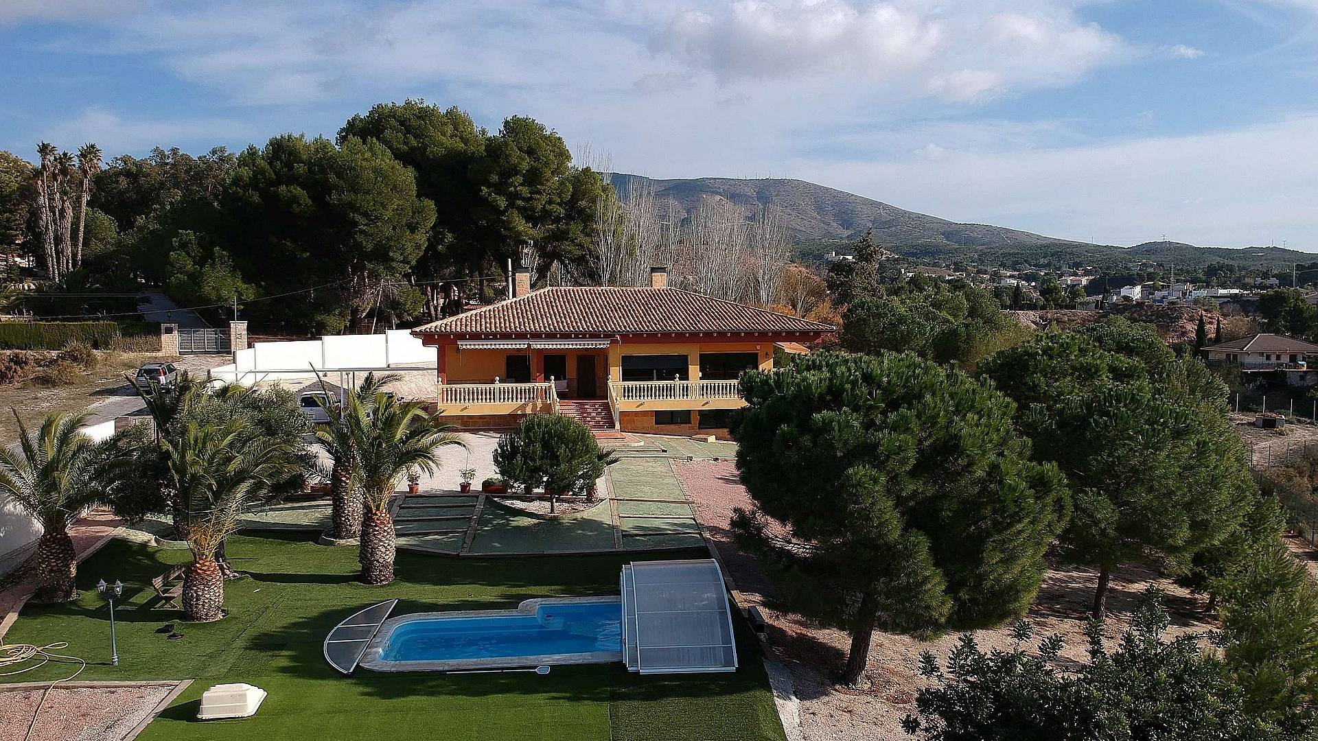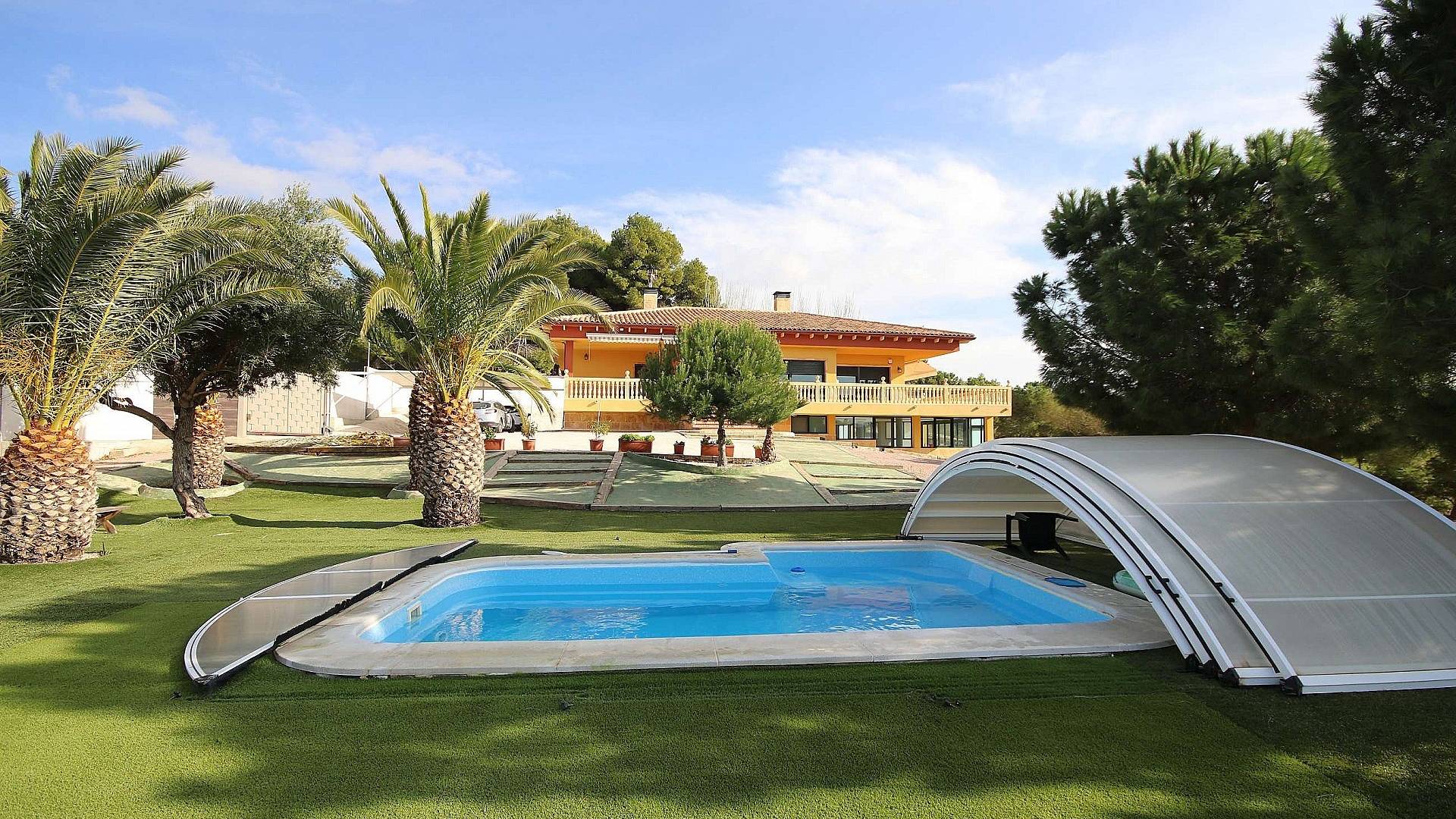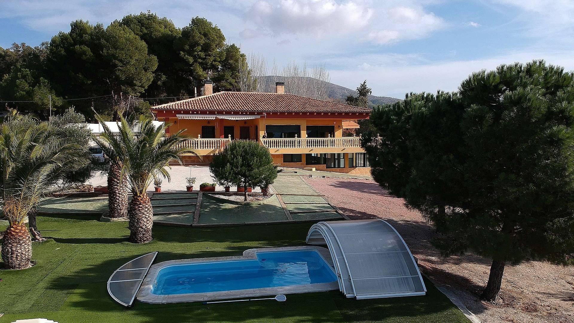 Gran chalet independiente con piscina cerca del pueblo en Elda / Petrer. Tiene 4 dormitorios, 2 baños, salón-comedor, cocina y lavadero en la planta principal, y un gran sótano con baño y cocina pequeña, y potencial para más dormitorios, como apartamento independiente. Afuera hay una bonita piscina con una cubierta deslizante y con césped artificial circundante y excelentes vistas. Construido en 2003. El tamaño de la casa es de 550m² y el tamaño de la parcela 4200m², totalmente vallada.