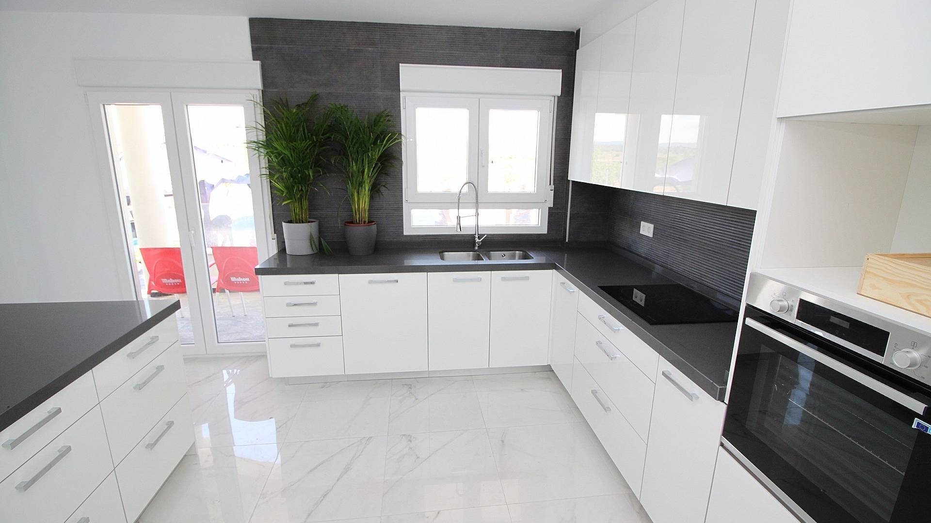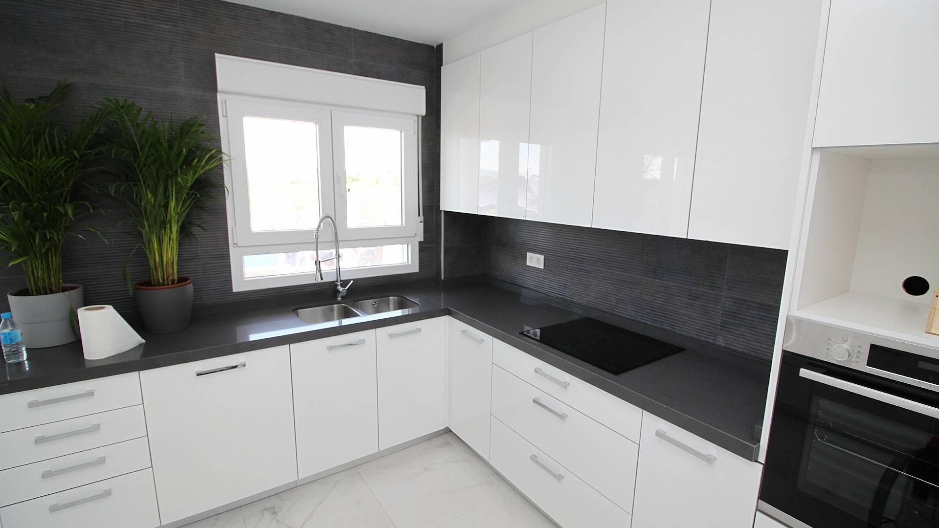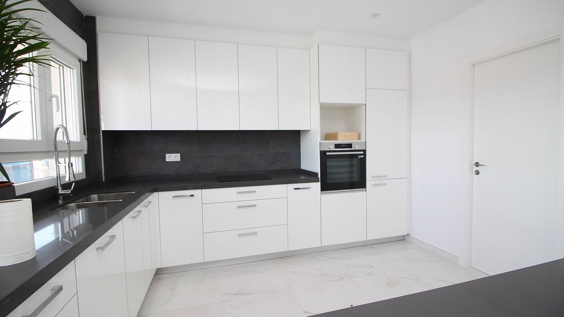 Las cocinas incluyen armarios con puertas y tiradores estándar, según planos, fregadero y grifería de acero inoxidable, preinstalación de horno, lavavajillas, extractor y varias encimeras de granito a elegir, incluidas en el presupuesto (otras encimeras de piedra disponibles con coste adicional). Electrodomésticos no incluidos.