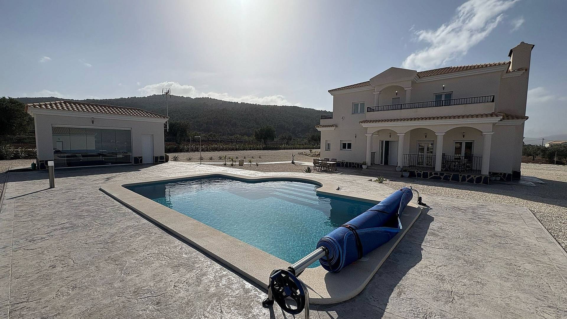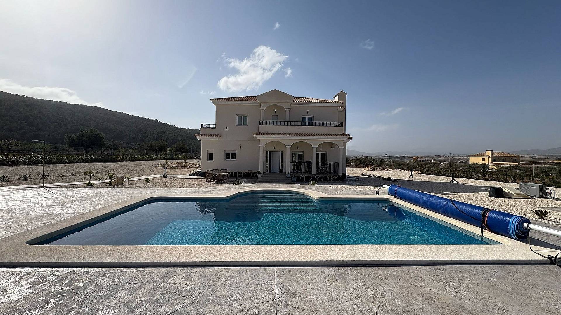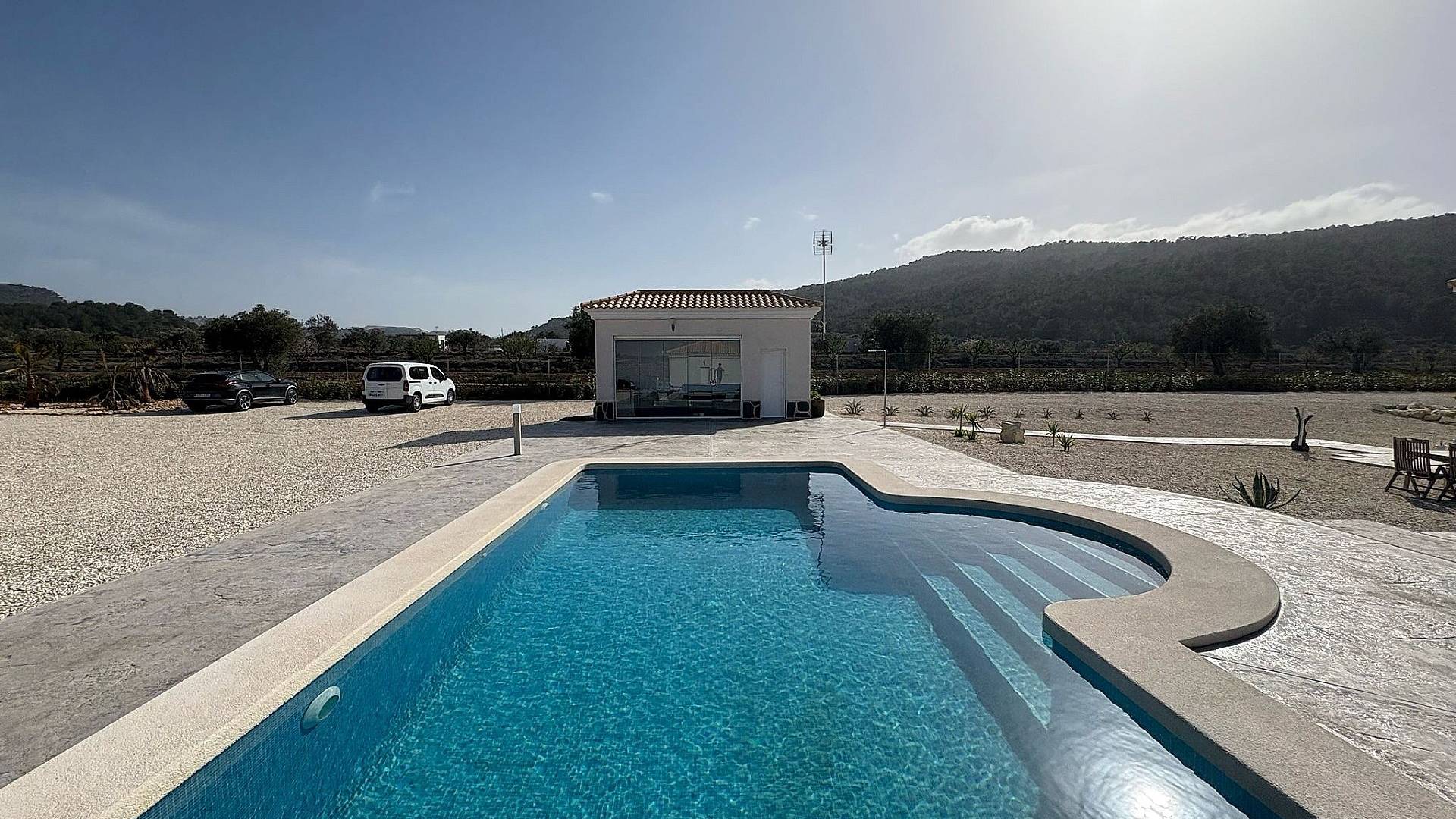 Todas nuestras casas incluyen una terraza de hormigón impreso de 2 m alrededor de la piscina (color y diseño a elegir), 1 m alrededor de la casa, puerta de entrada, vallado de 3000 m², preinstalación de aire acondicionado por conductos, cocina estándar, puerta de seguridad, ventanas oscilobatientes alemanas (o correderas si lo prefieren), chimenea empotrada, preinstalación de TV e internet, entrada de grava y varios metros alrededor de la casa, y fosa séptica.