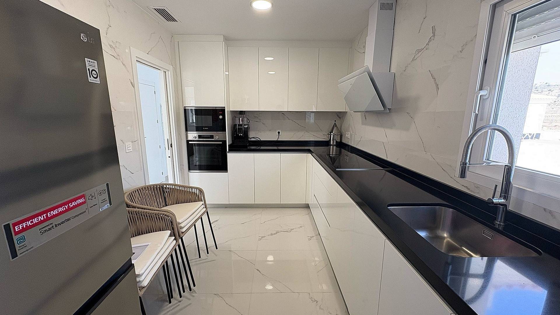 Las cocinas incluyen armarios con puertas y tiradores estándar, según planos, fregadero y grifería de acero inoxidable, preinstalación de horno, lavavajillas, extractor y varias encimeras de granito a elegir, incluidas en el presupuesto (otras encimeras de piedra disponibles con coste adicional). Electrodomésticos no incluidos.