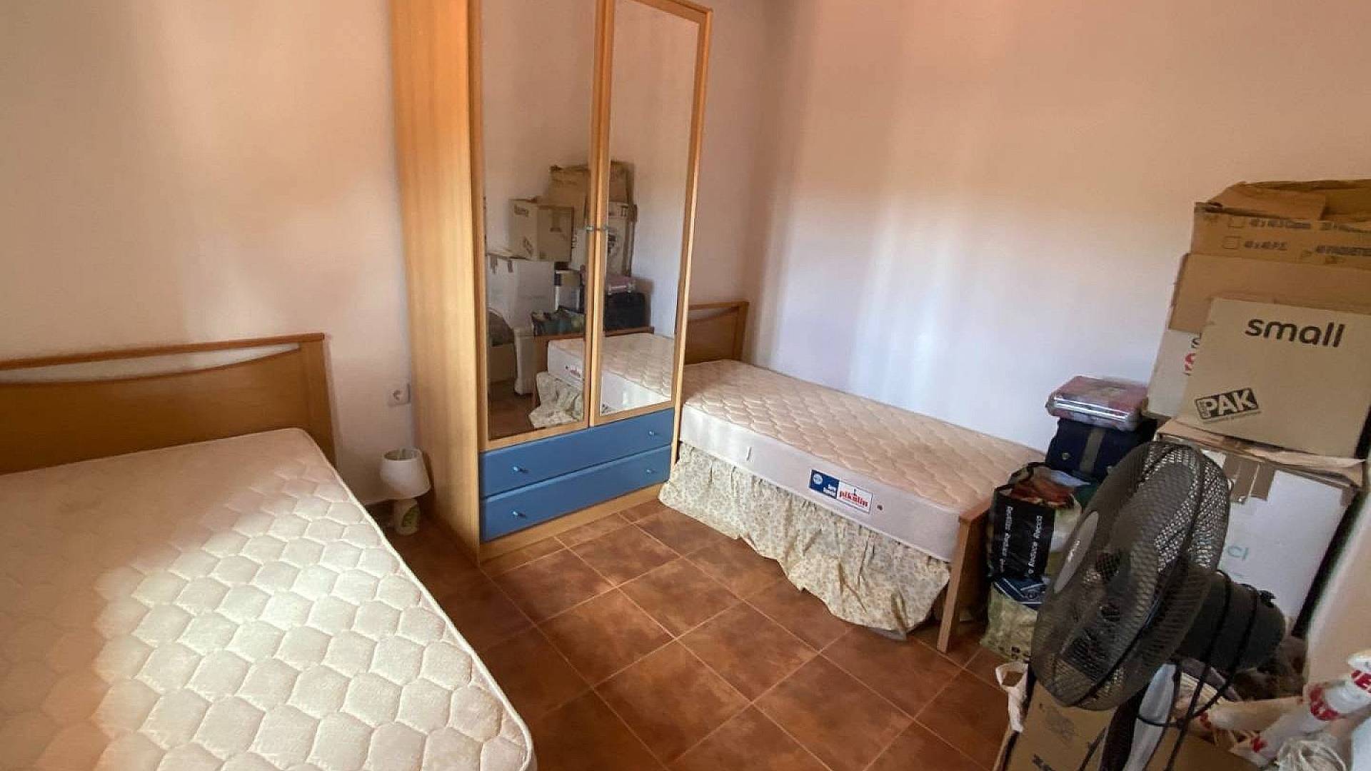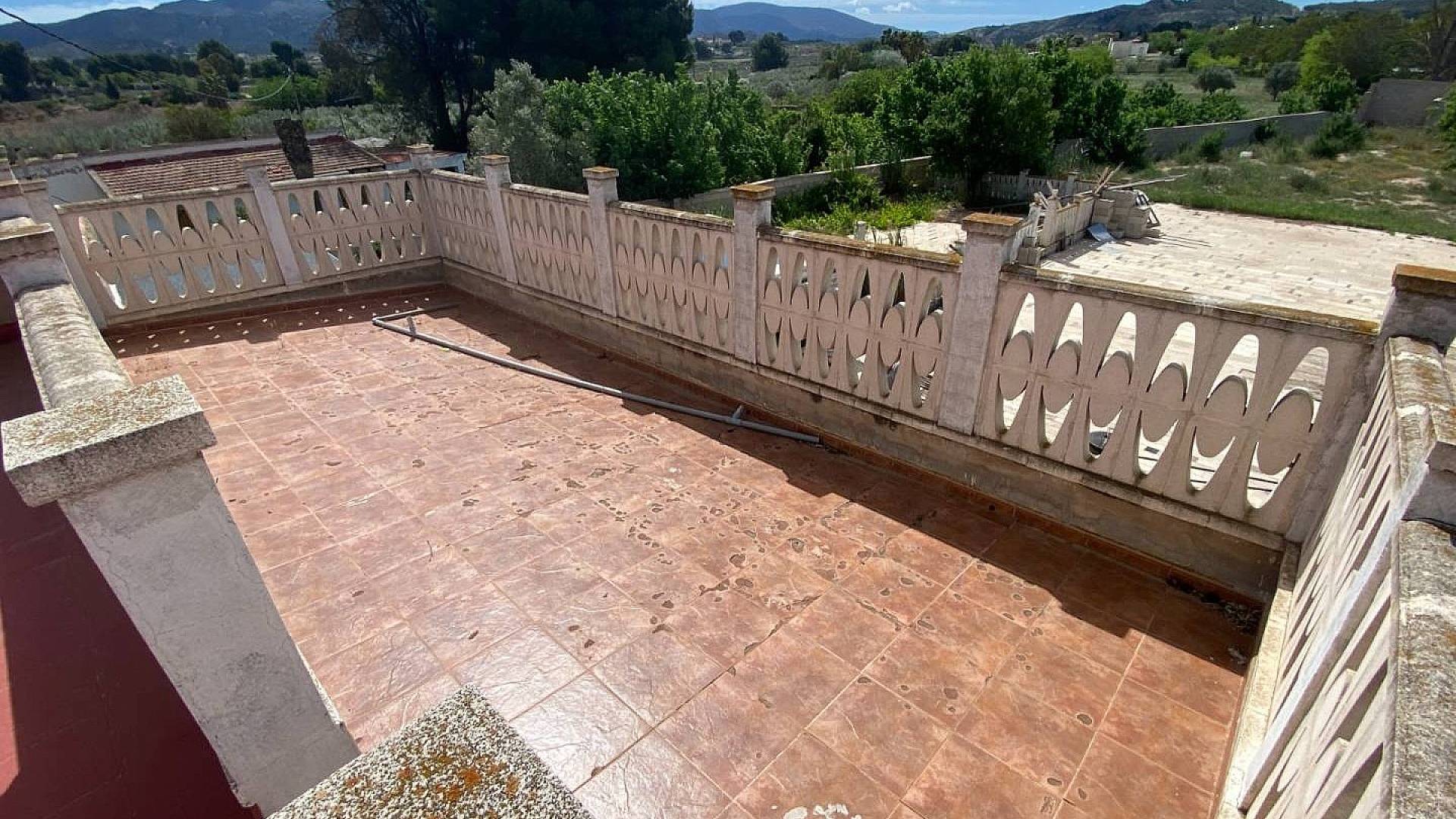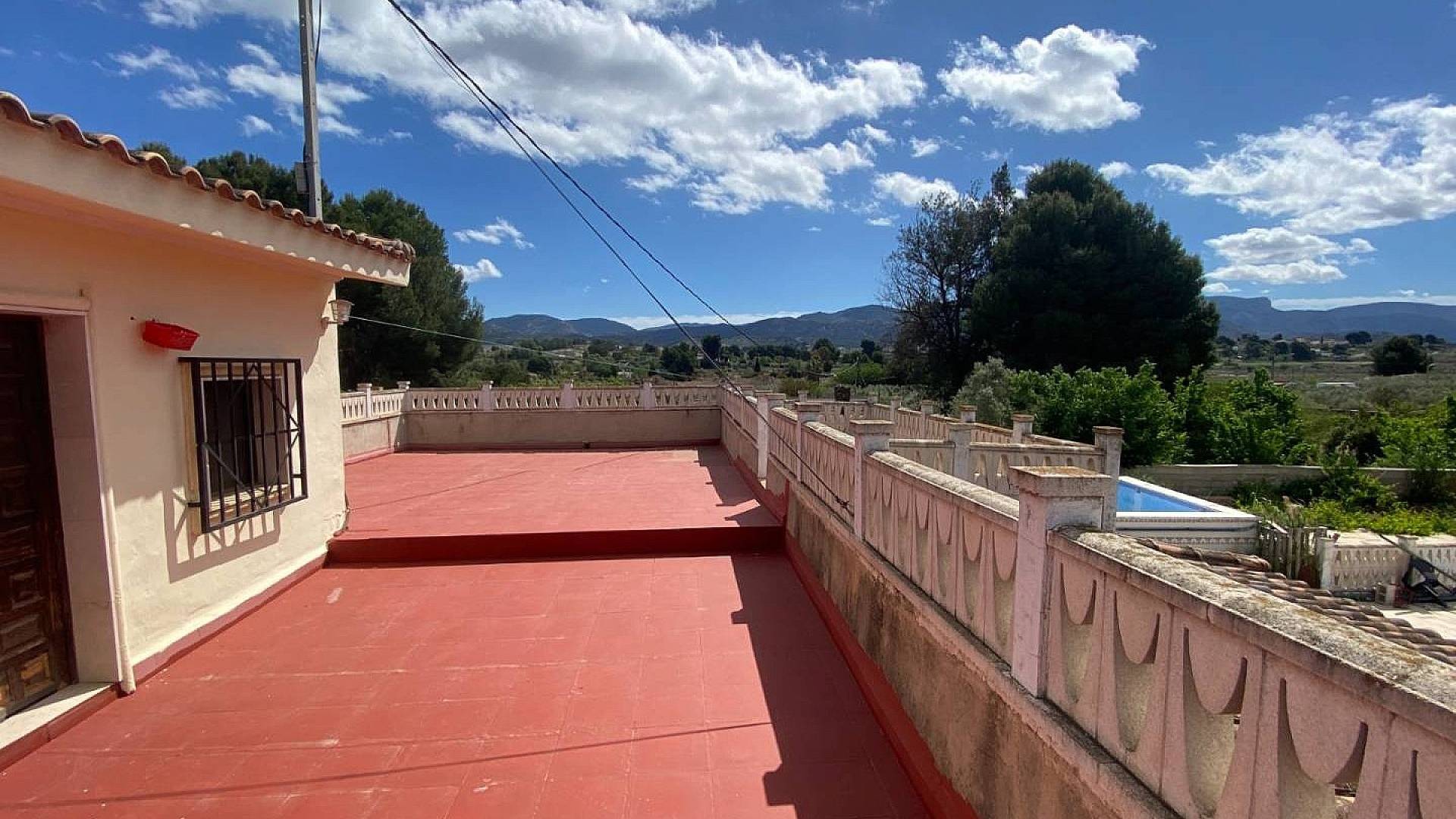 Subiendo las escaleras a la planta superior, se llega a un pequeño rellano con una puerta que da acceso al tercer dormitorio, muy privado, y otra que da acceso a la increíble terraza que rodea dos tercios de la propiedad. Es impresionante, al igual que las vistas desde aquí, desde el terreno hasta las montañas, y se puede contemplar la piscina recién embaldosada, de aproximadamente 2,4 x 1,2 m, con bomba y filtro nuevos ocultos en el cuarto de la piscina.