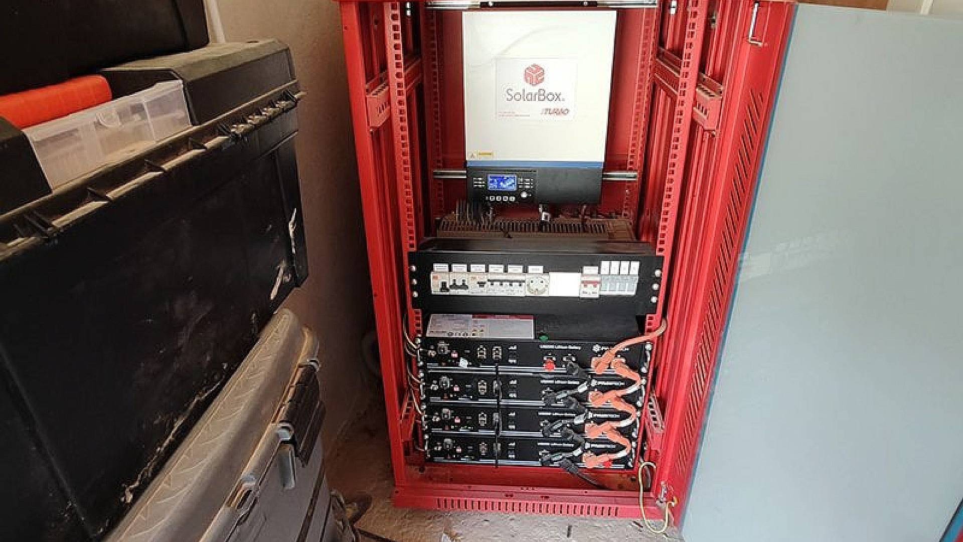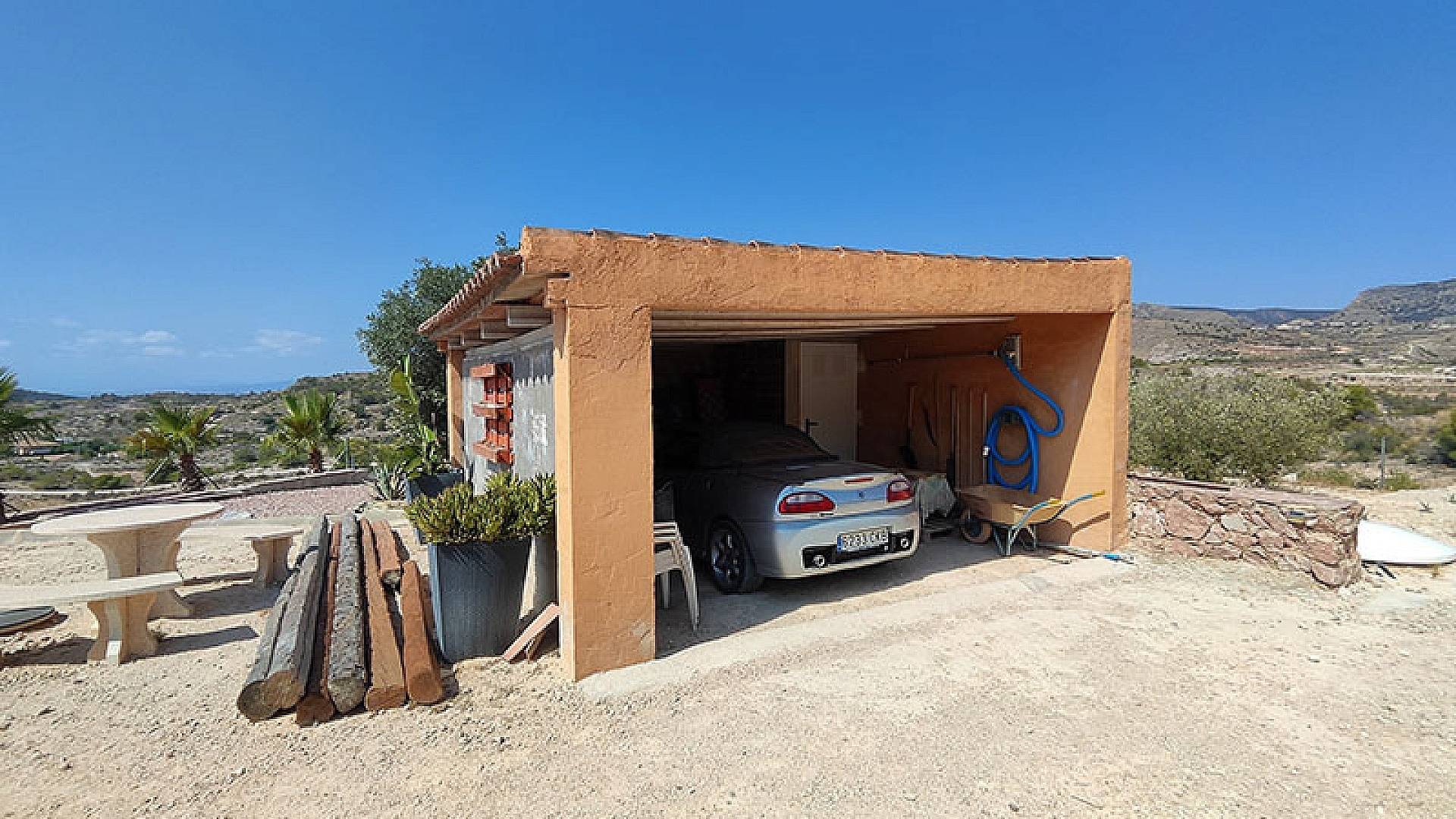 Garaje para un coche, dentro del cual se encuentran las baterías del sistema de paneles solares. La casa es completamente autosuficiente en electricidad y está conectada a la red de agua.