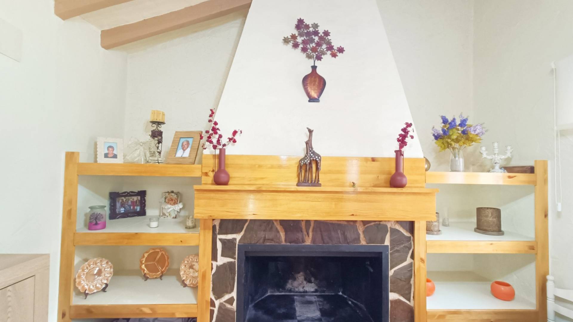 Al entrar, nos sorprende un amplio y luminoso salón comedor con cocina integrada, un espacio acogedor que invita a compartir. Cuenta con aire acondicionado y chimenea de leña, creando un ambiente cálido tanto en invierno como en verano. Las vigas de madera en el techo aportan carácter y autenticidad, reforzando el encanto tradicional de la casa.