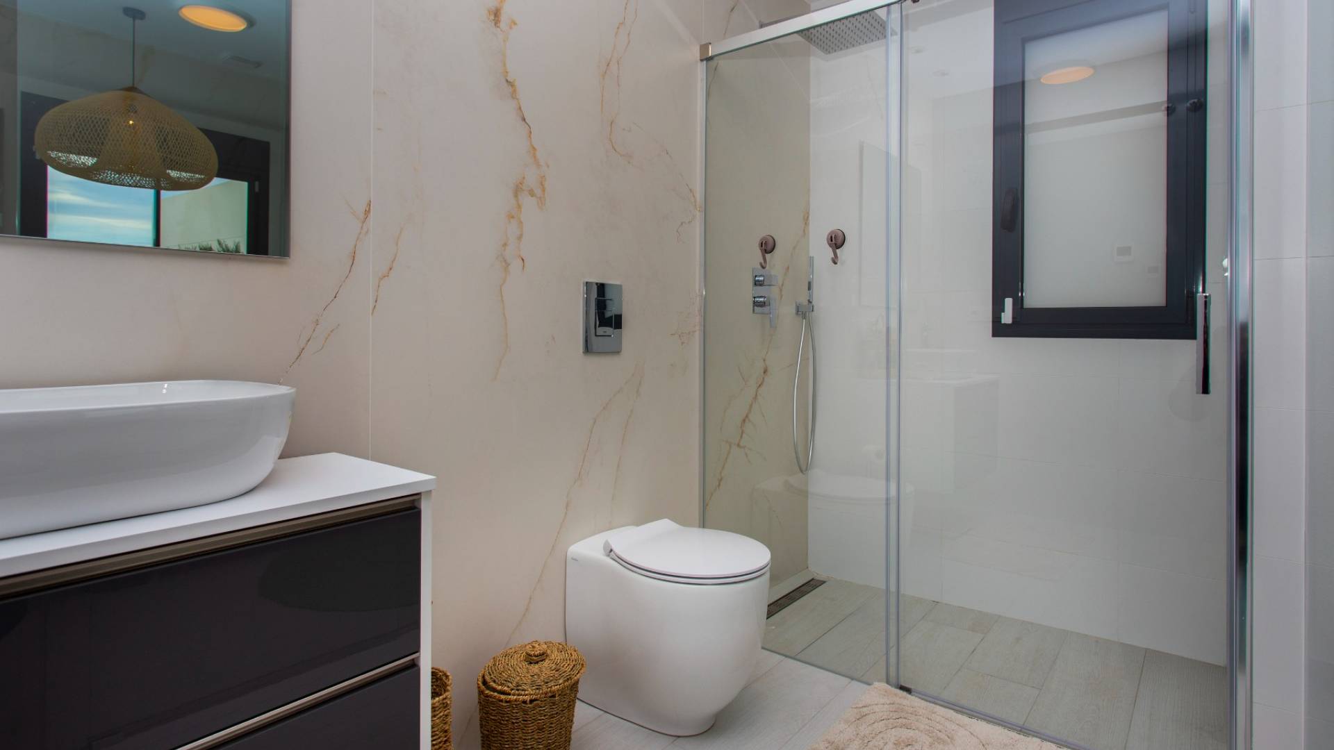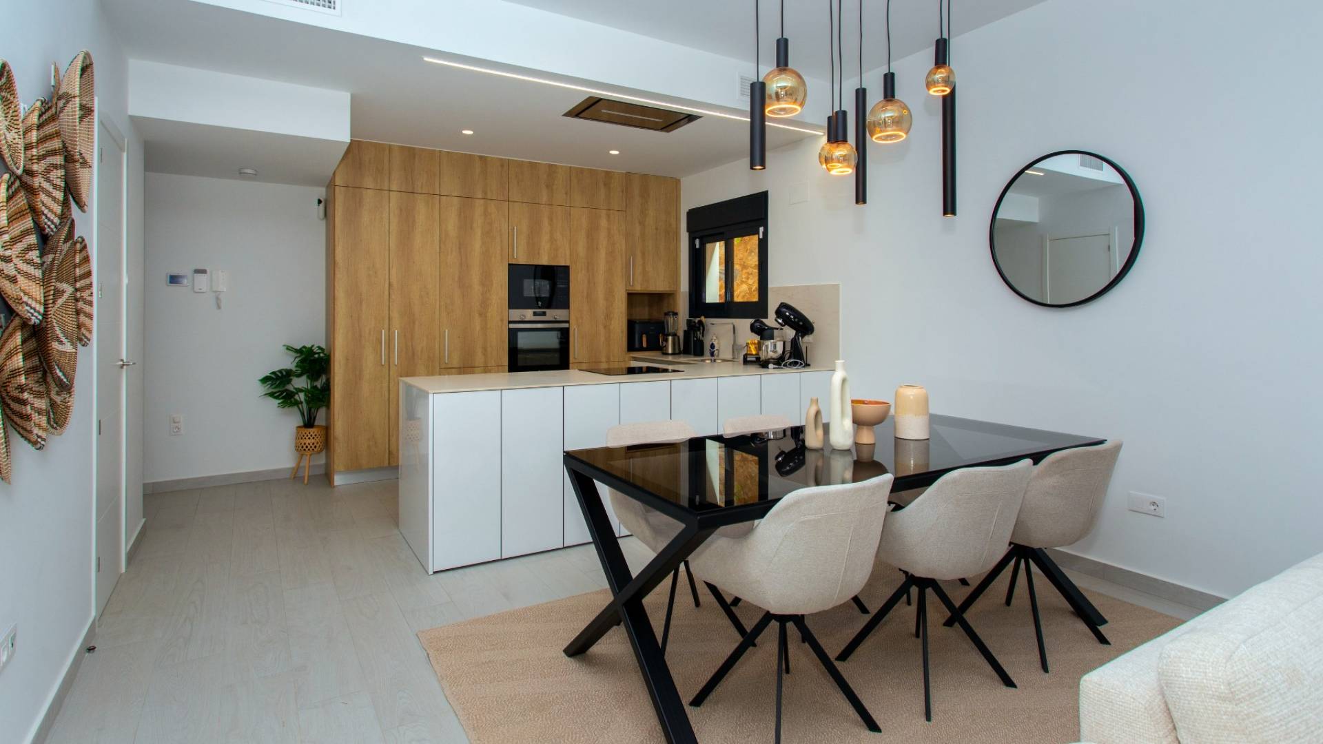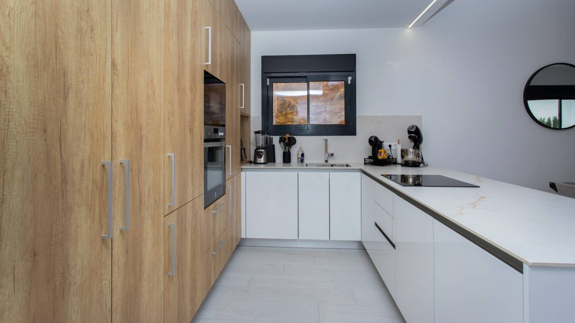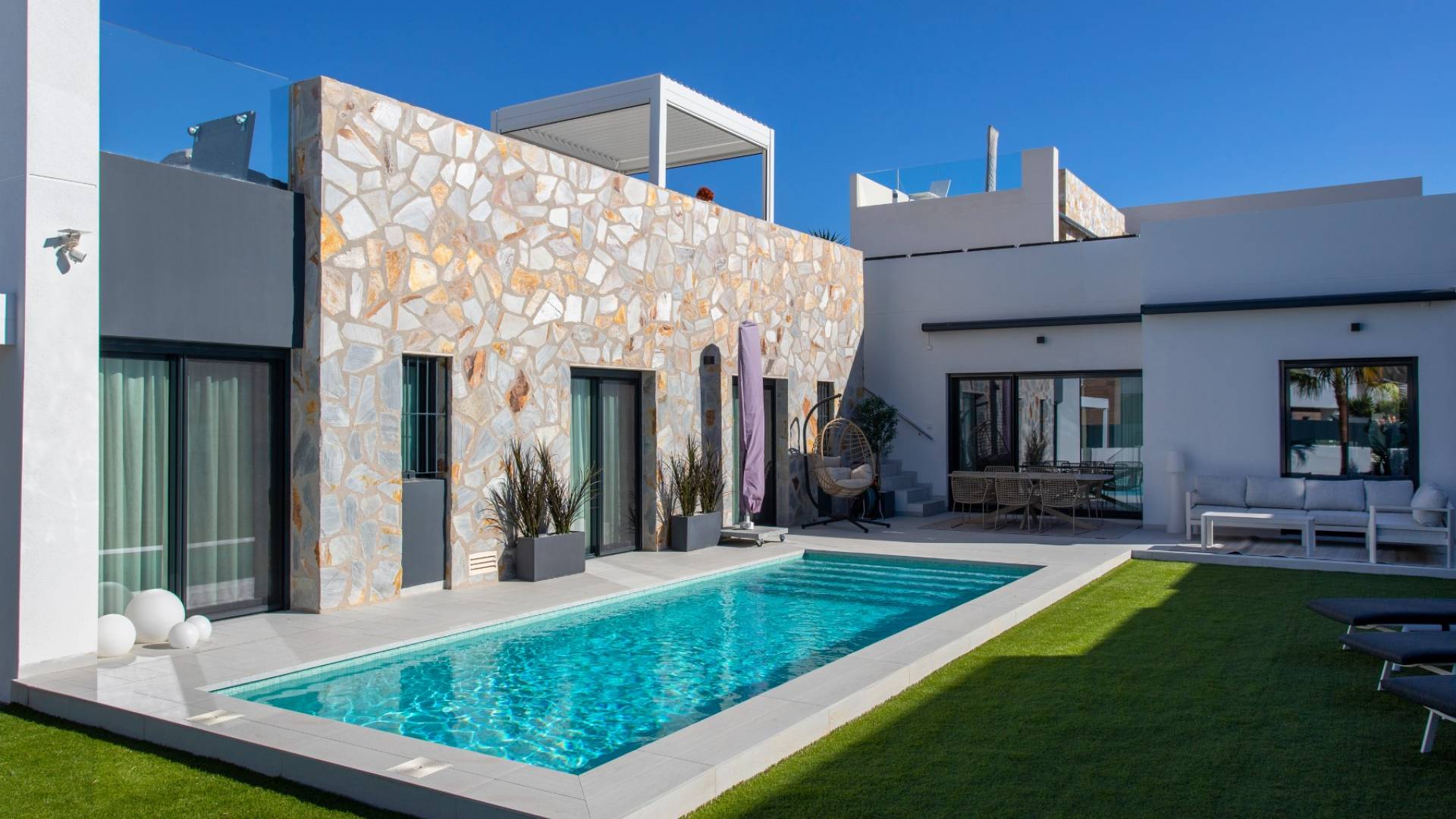 Viva el estilo de vida español definitivo en esta moderna villa lista para entrar con 4 dormitorios y 3 baños, ubicada en el prestigioso La Finca Golf Resort. Esta propiedad combina lujo contemporáneo con encanto mediterráneo, ofreciendo todo lo que necesita para vivir relajadamente o disfrutar de unas vacaciones sin preocupaciones bajo el sol español. Al entrar, se sentirá inmediatamente acogido por el luminoso y amplio espacio de estar. Grandes ventanas permiten que la luz natural inunde el interior y ofrecen impresionantes vistas del jardín y la piscina. La sala de estar cuenta con una acogedora zona de televisión y una iluminación ambiental, perfecta para relajantes noches en familia o con amigos. El dormitorio principal brinda tranquilidad absoluta, con un elegante baño en suite que incluye ducha a ras de suelo, inodoro y un estiloso mueble de lavabo, separado de la habitación por una moderna pared de vidrio. Desde el dormitorio principal, se accede directamente al jardín y a la piscina climatizada, un lujo que hace que cada día se sienta como vacaciones. También hay un segundo dormitorio con baño en suite, mientras que los dos dormitorios restantes comparten un elegante baño de invitados. Actualmente, uno de estos dormitorios está acondicionado como sala de juegos, pero la versatilidad de la vivienda mantiene abiertas todas las posibilidades. Puede convertirse en oficina, sala de hobbies, gimnasio o cine privado, permitiendo que la villa se adapte sin esfuerzo a su estilo de vida. Si le gusta cocinar y compartir momentos agradables, la moderna cocina abierta le encantará. Sus líneas elegantes, amplio espacio de almacenamiento, larga encimera y campana extractora integrada crean un entorno de trabajo elegante y práctico. Contigua a la cocina hay un cuarto de servicio con caldera y un espacio de almacenamiento adicional con conexiones para lavadora, secadora y frigorífico extra, ideal para preparar comidas que se pueden disfrutar en el jardín junto a la piscina. El verdadero disfrute comienza en el exterior. La gran piscina privada está revestida con elegantes azulejos que se integran perfectamente con la terraza, mientras que el jardín está diseñado para un bajo mantenimiento con césped artificial. La cochera, directamente conectada a la vivienda, ofrece un acceso privado y práctico e incluye punto de carga para vehículos eléctricos. Otro punto destacado es el solárium con vistas panorámicas a las montañas y el paisaje circundante. La pérgola de alta calidad proporciona sombra y ambiente, ideal para un aperitivo al atardecer o su tranquilo café matutino al sol. Gracias a extras como paneles solares, toldos, mosquiteras, calefacción de la piscina y un sistema de aire acondicionado avanzado, podrá disfrutar de máxima comodidad durante todo el año. Además, no hay gastos comunitarios, lo que permite vivir con total independencia. Opcionalmente, la propiedad ofrece dos trasteros adicionales y plazas de aparcamiento en el resort, lo que brinda mayor flexibilidad. Aquí, se vive la auténtica vida española. Pueblos encantadores y ciudades vibrantes están a solo minutos, mientras que las hermosas playas de la Costa Blanca son de fácil acceso. Dentro del complejo de golf encontrará restaurantes de renombre, instalaciones deportivas y servicios exclusivos que contribuyen a un estilo de vida relajado y de calidad, complementando perfectamente el confort y lujo de la villa. Esta villa es ideal para quienes buscan una vivienda lujosa, espaciosa y funcional para residir permanentemente o disfrutar de vacaciones sin preocupaciones en España, un lugar donde confort, privacidad y estilo de vida se combinan de forma natural. Aproveche esta oportunidad excepcional y programe su visita hoy mismo. La villa está lista para entrar y totalmente preparada para que comience a disfrutar de la vida de lujo bajo el sol español en La Finca Golf.