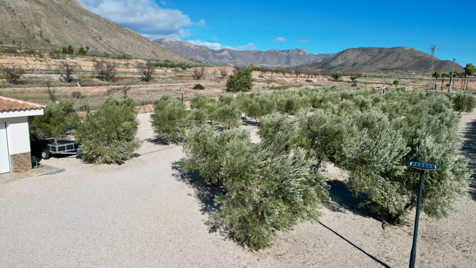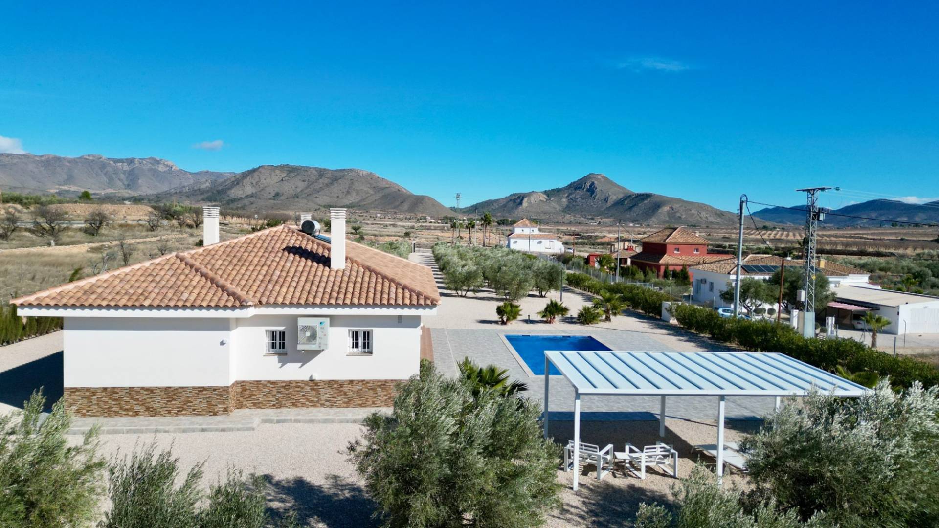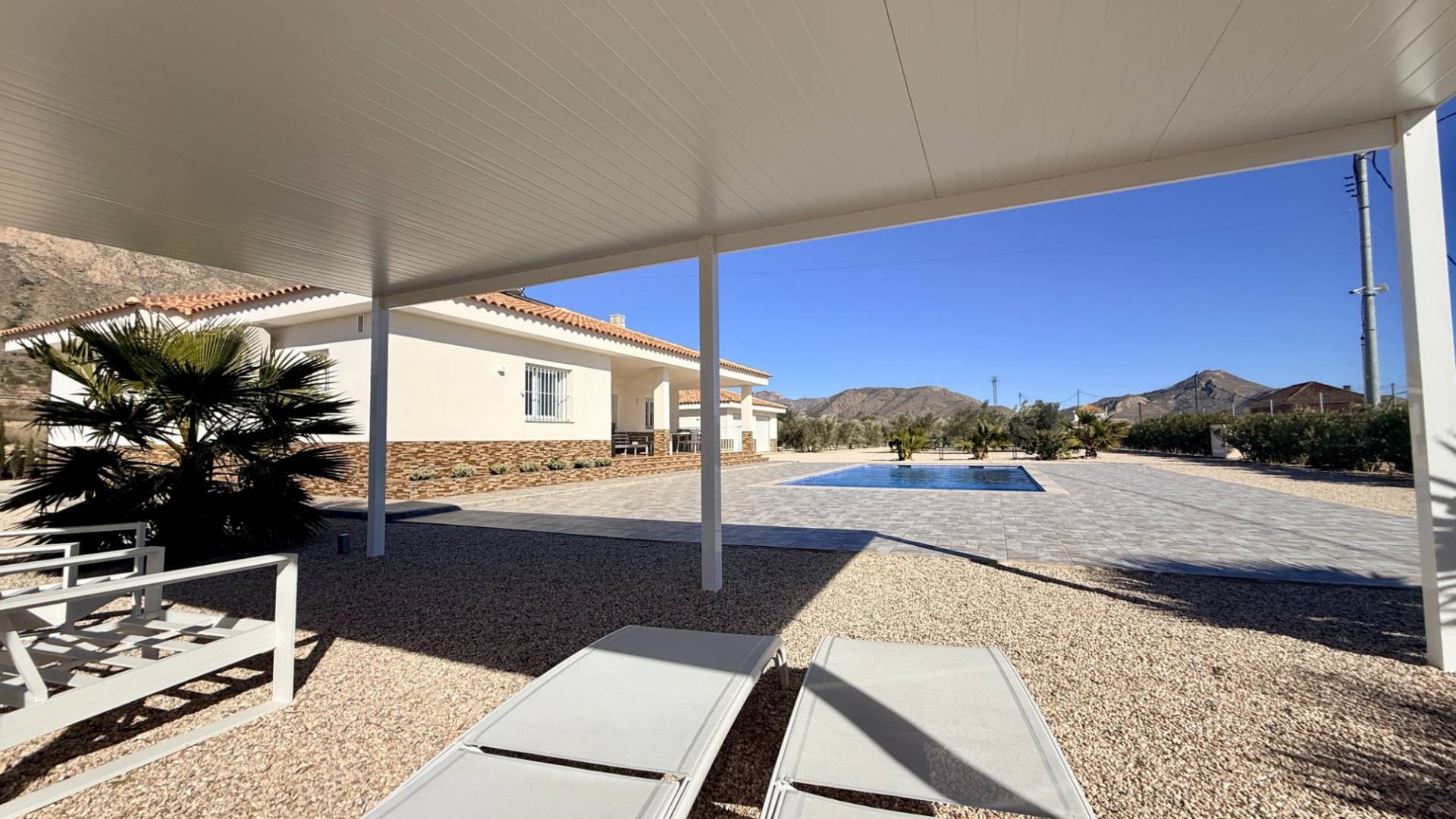 ¿Cómo utilizaría una villa como esta? ¿Largos días de verano junto a la piscina, trabajar desde casa con internet ultrarrápido o simplemente disfrutar de paz, espacio y vistas desde su propia terraza orientada al sur? Construida en 2022 y presentada en estado impecable, esta villa moderna se encuentra en una parcela totalmente vallada de 5.500 m², con vistas a almendros en terrazas y a las colinas boscosas de Murcia. Privacidad, luz y comodidad definen esta propiedad. En el interior, la vivienda ofrece un luminoso salón-comedor de concepto abierto con acceso directo a un amplio porche cubierto orientado al sur con vistas a la piscina. La cocina moderna está totalmente equipada con electrodomésticos integrados, amplias superficies de trabajo y mucho espacio de almacenaje. Un lavadero independiente aporta funcionalidad adicional y acceso exterior hacia la zona del garaje. La distribución es práctica y flexible: Tres dormitorios dobles con armarios empotradosDormitorio principal con baño en suiteBaño de invitados con ducha tipo walk-inIdeal para invitados, despacho o vida familiar En el exterior, la villa destaca especialmente. Se accede mediante una puerta corredera motorizada que da paso a un largo camino de grava flanqueado por olivos, con un total aproximado de 120 olivos en la parcela. El punto central es la piscina privada de agua salada de 10 x 5 m, rodeada por una amplia terraza y una pérgola que ofrece sombra en los días más calurosos. ¿Se imagina tardes relajadas junto a la piscina, baños al atardecer o reuniones con amigos bajo la pérgola con las colinas como telón de fondo? Características exteriores principales: Parcela totalmente vallada de 5.500 m²Piscina de agua salada (más suave para piel y ojos)Amplia terraza y pérgolaGaraje doble con dos puertas eléctricasEspacio con potencial para taller, almacenamiento o conversión La vivienda está preparada para vivir todo el año, con electricidad de red mejorada (7 kW), agua de riego, depósito de agua potable de 12.000 litros, aire acondicionado por conductos frío/calor, sistema solar para agua caliente e internet por fibra óptica de 1.000 Mbps. La parcela cuenta con sistema de riego completo.