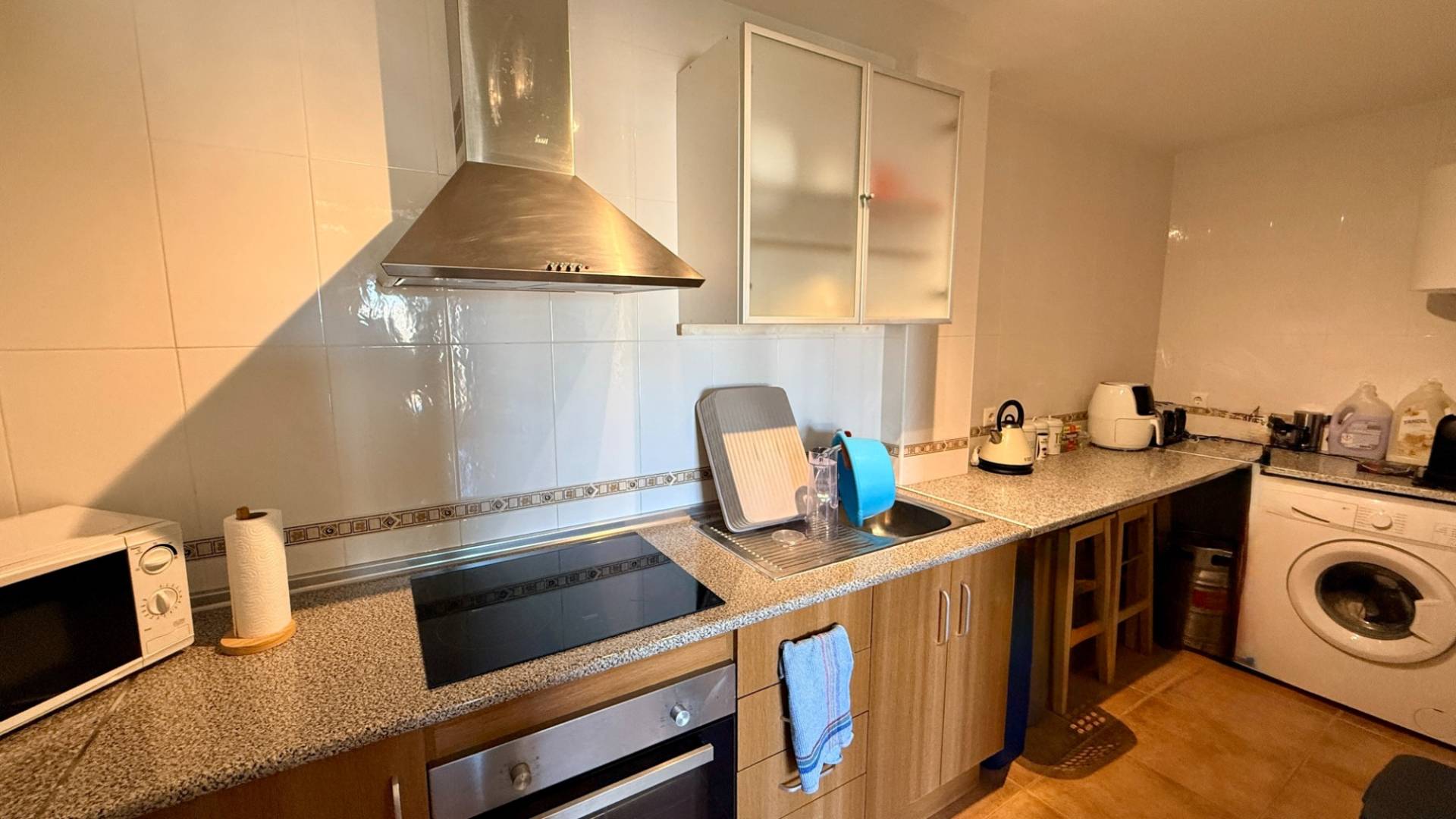 No es habitual que tengamos apartamentos en venta en el Valle de Hondón, pero siempre es una buena oportunidad para quienes no buscan una gran villa de campo con piscina y prefieren una propiedad sencilla, ideal para vivir todo el año o como apartamento vacacional de bajo mantenimiento, a solo un minuto a pie del centro del pueblo. Este apartamento en segunda planta se vende totalmente amueblado y dispone de un salón abierto con grandes ventanales orientados al este, con vistas al Valle de Hondón. El salón cuenta con internet de alta velocidad y aire acondicionado frío/calor moderno. La cocina es tipo galera e incluye todos los electrodomésticos. Hay dos dormitorios dobles. El dormitorio principal está orientado al este (más fresco en verano) y el dormitorio de invitados da al pueblo. El baño dispone de lavabo con mueble, WC, bidé y ducha (con muy buenas vistas). No hay apartamentos encima de esta vivienda. Existe una pequeña terraza comunitaria en la azotea, de la cual aproximadamente el 30% corresponde a cada propietario. El edificio se encuentra a solo un minuto a pie del centro del pueblo, donde encontrará centro médico, farmacia, tiendas y numerosos bares, restaurantes y cafeterías (aproximadamente 10 en total). Las mejores playas, ciudades y aeropuertos están a unos 35 minutos. La vivienda está conectada a agua potable, electricidad e internet. Los gastos de comunidad son de 38€ al mes.