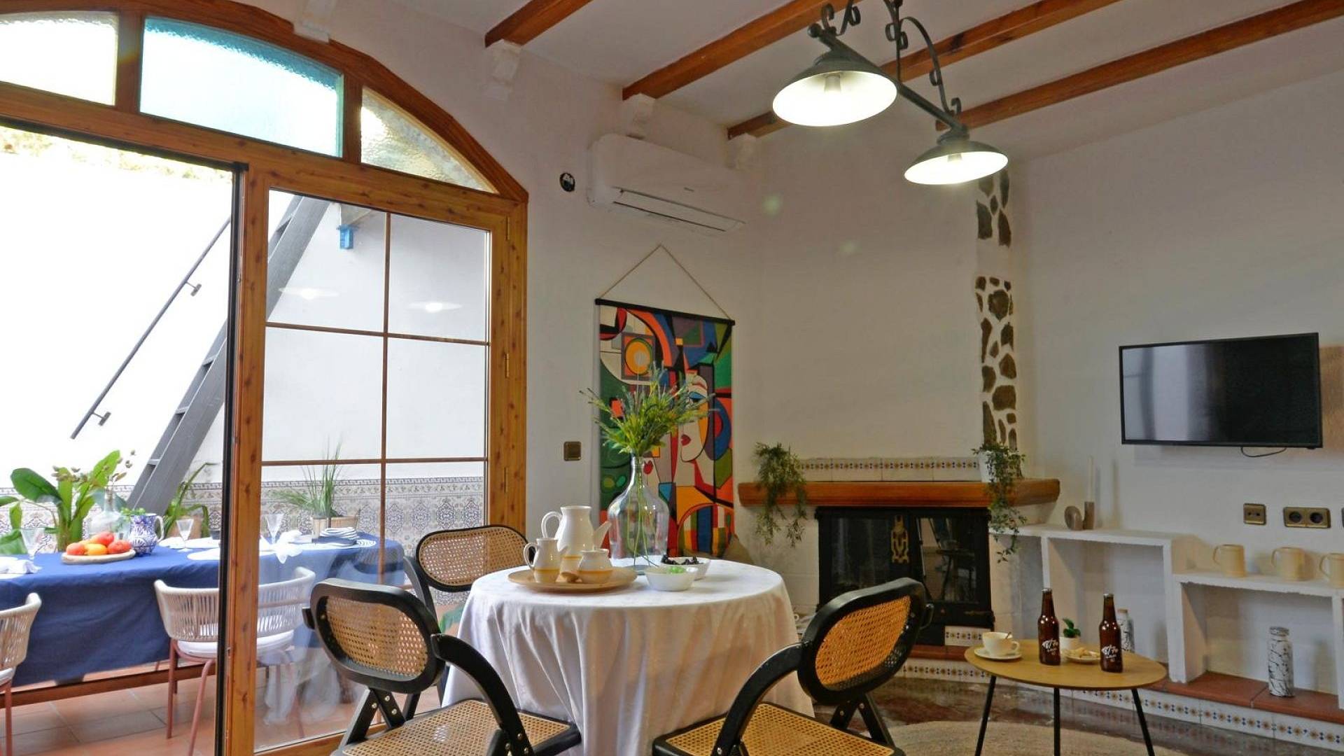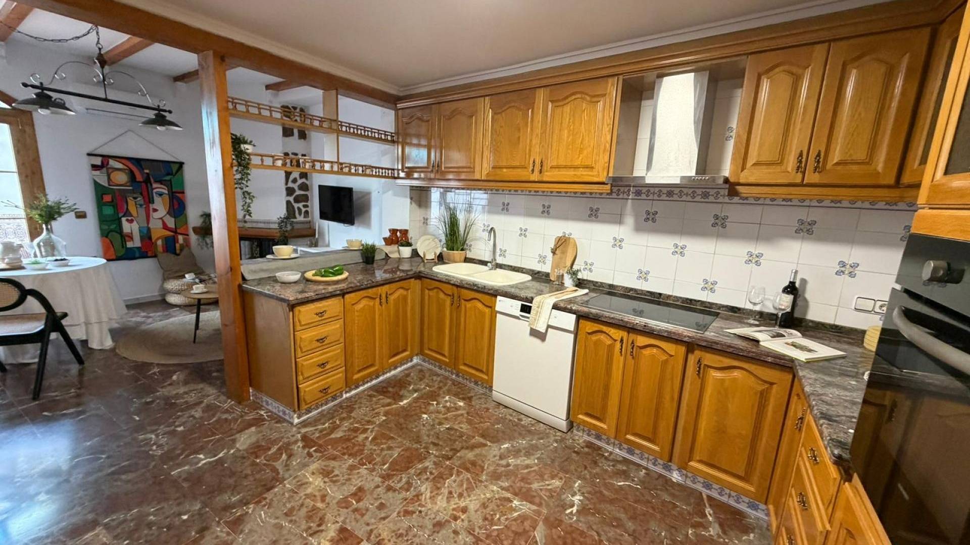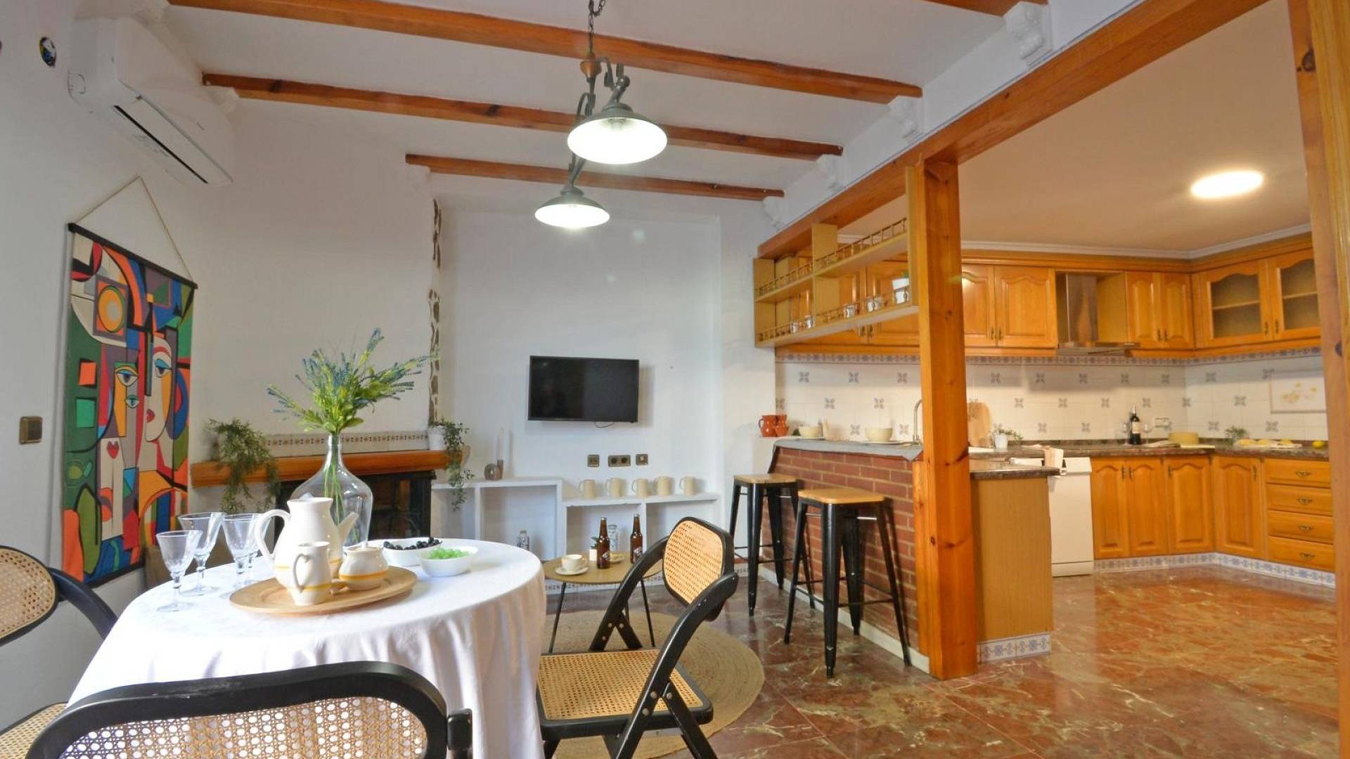 La amplia cocina se conecta con un acogedor comedor con chimenea y aire acondicionado adicional, un entorno ideal para comidas familiares o reuniones con amigos.