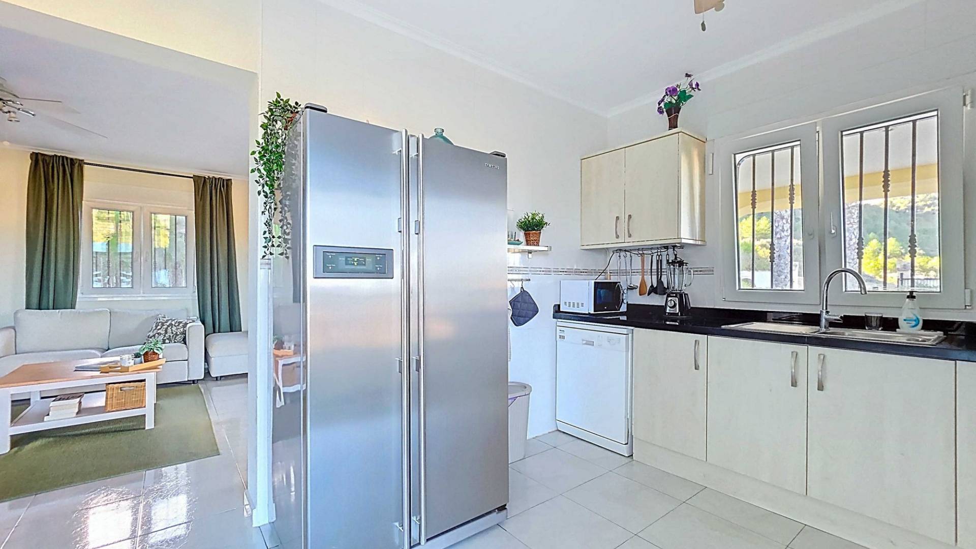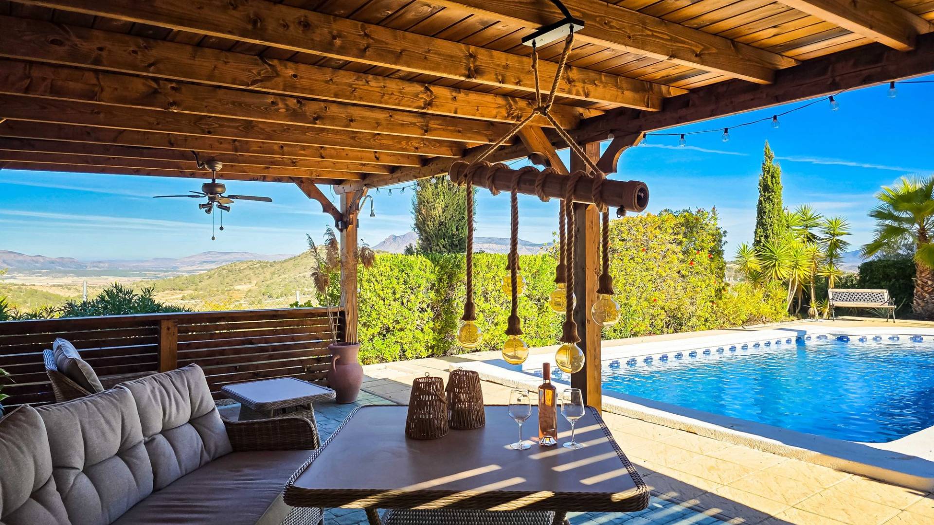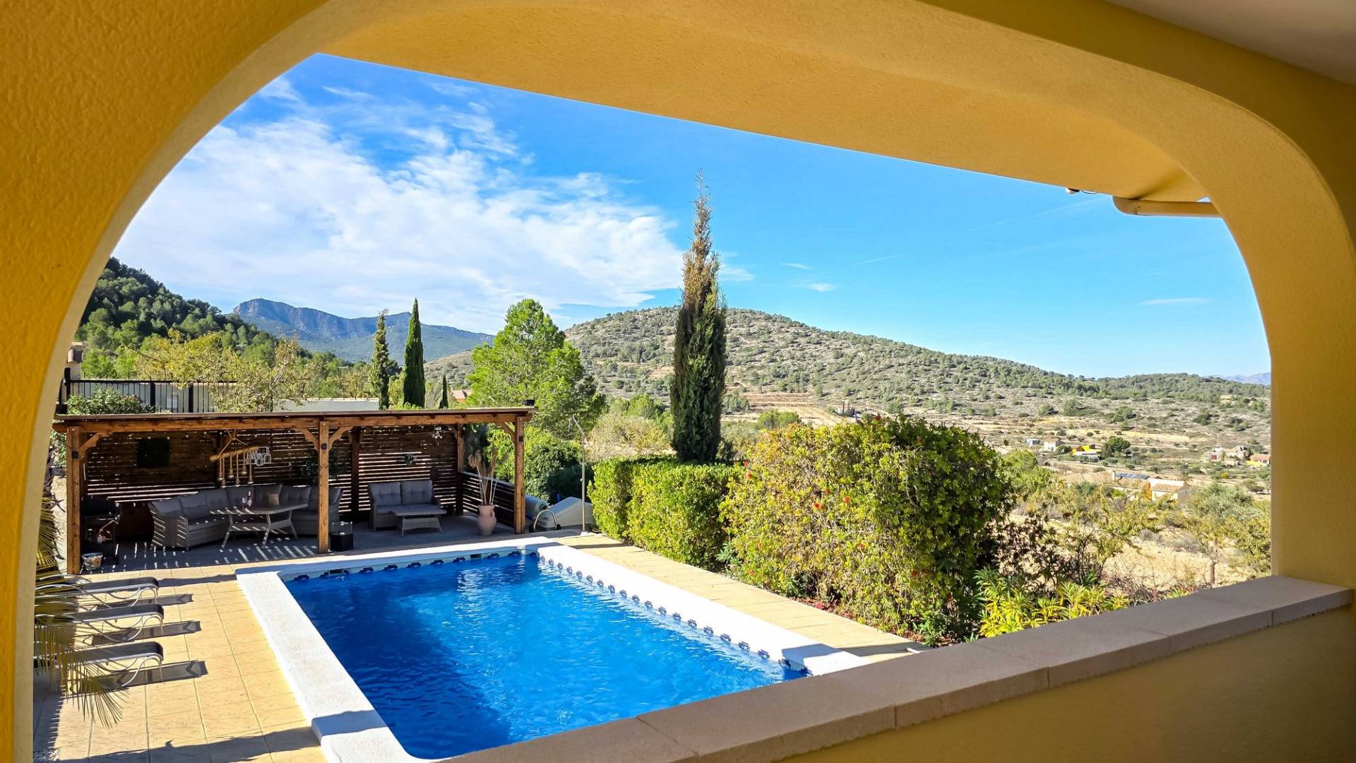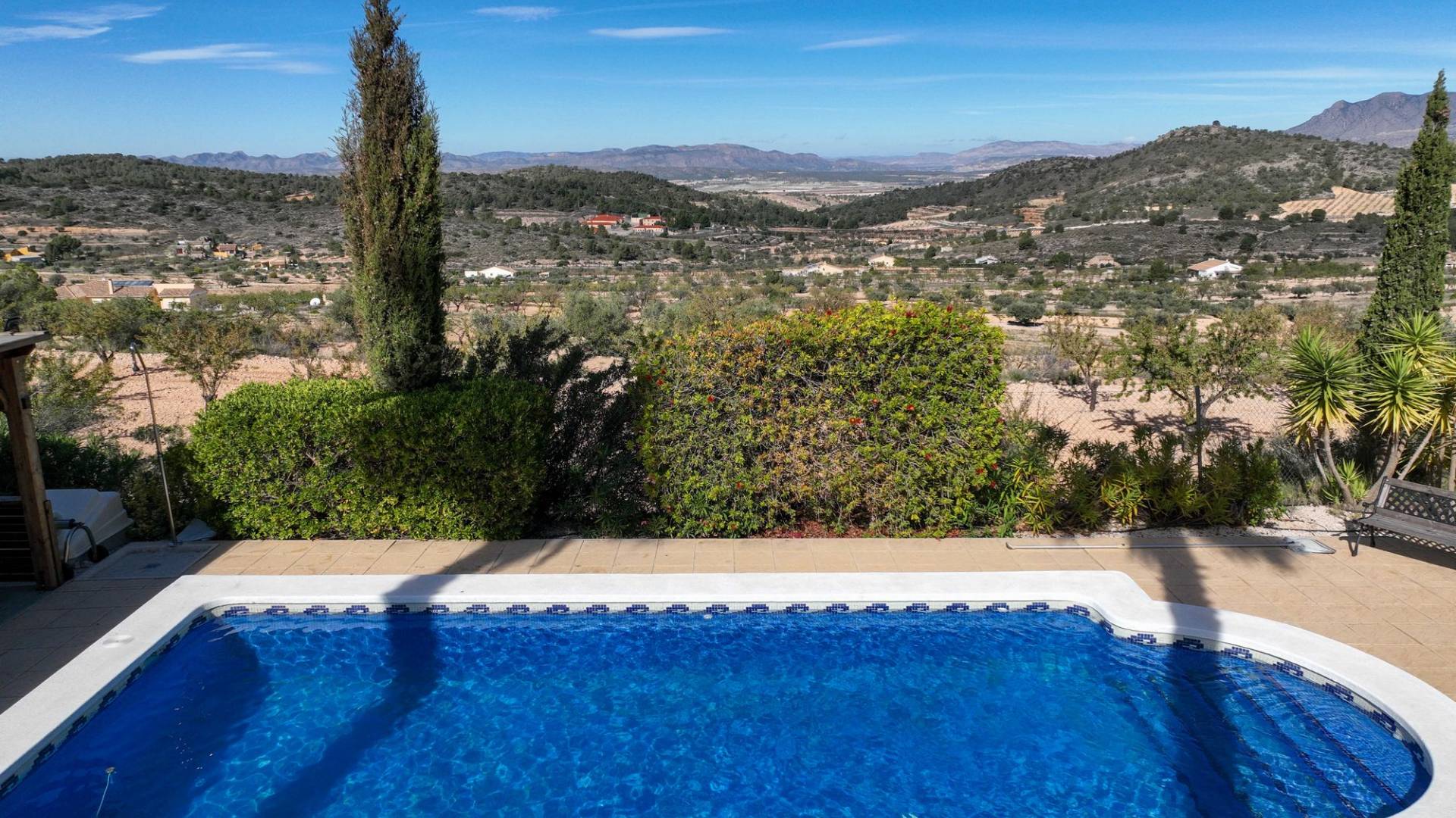 Villa La Zarza Una auténtica villa lista para entrar a vivir, con posiblemente la mejor vista al valle de La Zarza. Disfruta de la puesta de sol desde la terraza o junto a la piscina con una copa de vino local, rodeado de montañas y con total privacidad. Esta vivienda está en venta en exclusiva, lo que significa que todos los documentos han sido revisados previamente y que todo está en orden o se puede regularizar. Terreno Tras el portón eléctrico se encuentra la amplia parcela totalmente vallada. El jardín de bajo mantenimiento está bien cuidado e incluye varios olivos y almendros con riego automático. En el jardín hay un trastero independiente de obra (2,5 x 5 metros). La zona exterior cuenta con una piscina de 8 x 4 metros y una pérgola instalada recientemente que ofrece una zona de sombra ideal en los días calurosos. La villa La villa está impecable y lista para vivir de inmediato. Los muebles pueden adquirirse aparte, lo que permite instalarse sin demora o utilizarla como vivienda vacacional. Dispone de un salón amplio y luminoso que conecta con el comedor y una cocina bien equipada con electrodomésticos de primeras marcas. Hay tres dormitorios, siendo el principal con baño en suite. Además hay un segundo baño independiente. El salón tiene acceso a una amplia terraza cubierta con vistas panorámicas a la piscina, mientras que el comedor junto a la cocina da paso a otra terraza con vistas abiertas al valle. Instalaciones La villa cuenta con una estufa de pellets en el salón, calefacción central de gas con radiadores en todas las estancias y suelo radiante eléctrico. En el salón y el dormitorio principal se ha instalado recientemente aire acondicionado (frío/calor) con control por aplicación. Dispone de fosa séptica, conexión eléctrica y depósito de agua. Un panel solar proporciona agua caliente. Las ventanas de PVC son oscilobatientes con persianas y mosquiteras. Hay espacio de almacenamiento adicional bajo parte de la casa y sobre el dormitorio principal (acceso por trampilla). Ubicación La villa está rodeada de la hermosa naturaleza verde del valle de La Zarza, a solo 20 minutos en coche de Pinoso y Abanilla. Es una zona rural con pinares, viñedos y campos de almendros y olivos. La villa está en un entorno tranquilo, pero con otras villas en los alrededores. En Pinoso y Abanilla encontrarás todos los servicios diarios como supermercados, colegios, centro médico, instalaciones deportivas y numerosos restaurantes. La zona ofrece muchas rutas para caminar, hacer senderismo y ciclismo. El clima es plenamente mediterráneo. Tanto los aeropuertos de Alicante como de Murcia y las playas están a menos de una hora. Ponte en contacto para una visita y siente tú mismo las vistas espectaculares.