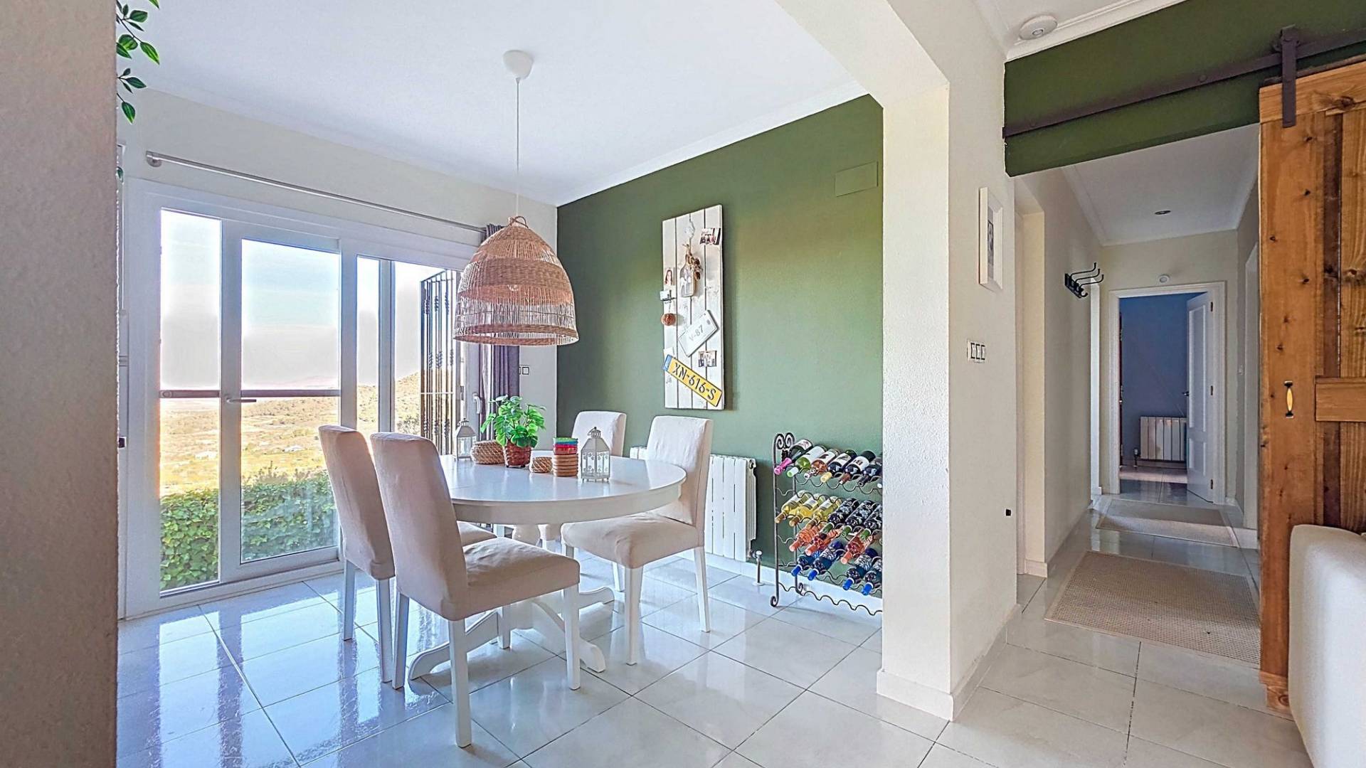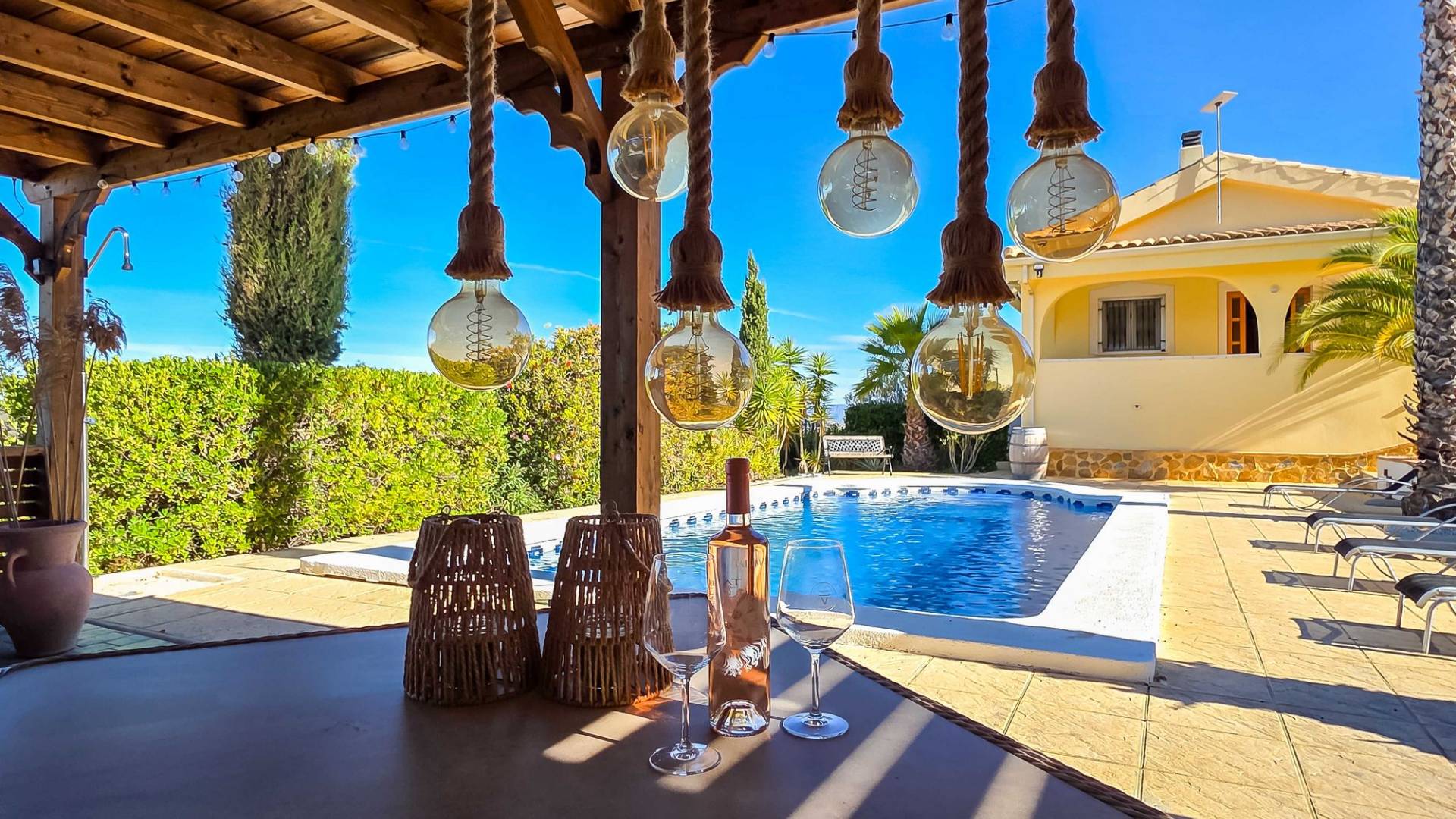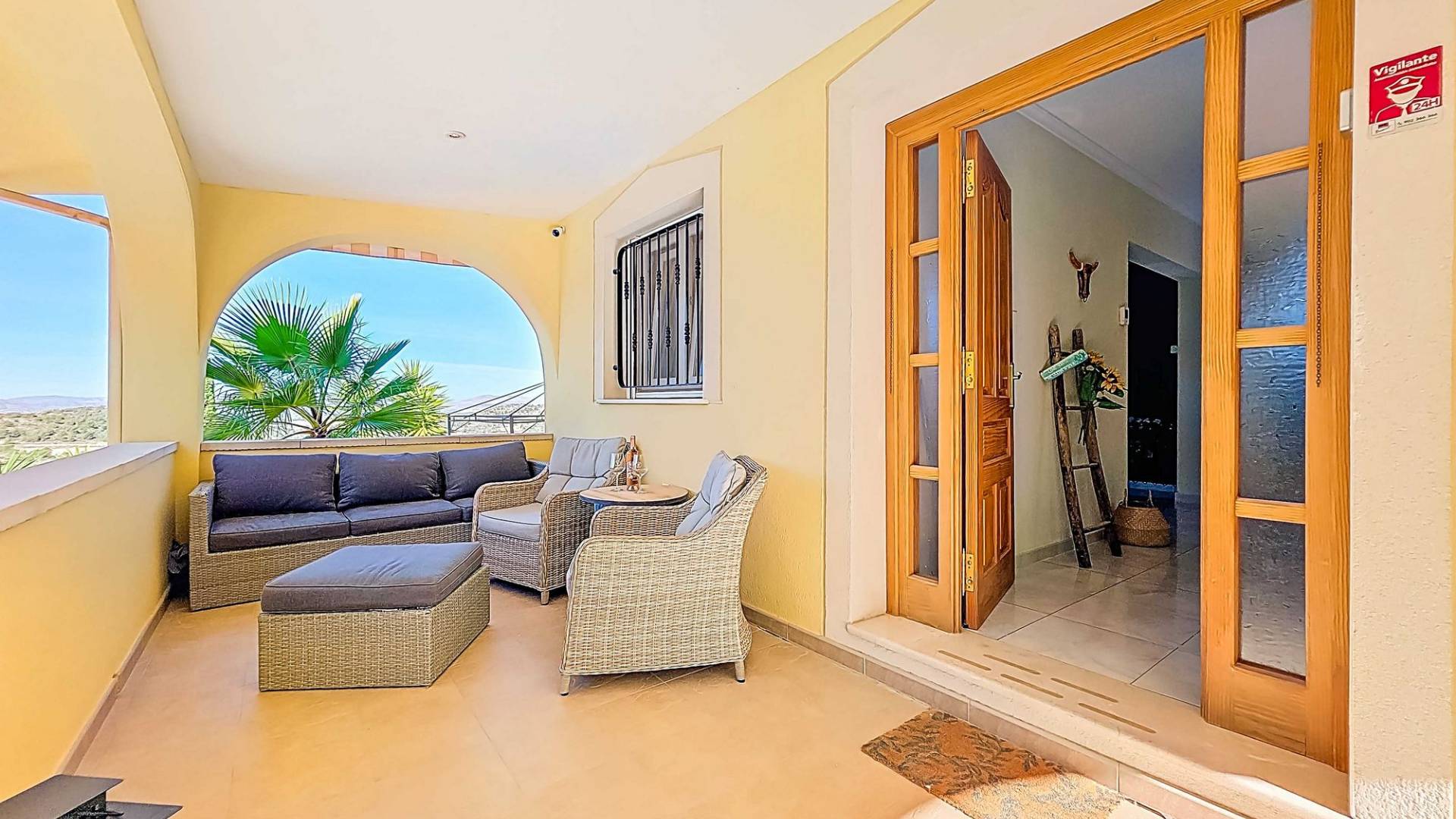 Villa La Zarza Una auténtica villa lista para entrar a vivir, con posiblemente la mejor vista al valle de La Zarza. Disfruta de la puesta de sol desde la terraza o junto a la piscina con una copa de vino local, rodeado de montañas y con total privacidad. Esta vivienda está en venta en exclusiva, lo que significa que todos los documentos han sido revisados previamente y que todo está en orden o se puede regularizar. Terreno Tras el portón eléctrico se encuentra la amplia parcela totalmente vallada. El jardín de bajo mantenimiento está bien cuidado e incluye varios olivos y almendros con riego automático. En el jardín hay un trastero independiente de obra (2,5 x 5 metros). La zona exterior cuenta con una piscina de 8 x 4 metros y una pérgola instalada recientemente que ofrece una zona de sombra ideal en los días calurosos. La villa La villa está impecable y lista para vivir de inmediato. Los muebles pueden adquirirse aparte, lo que permite instalarse sin demora o utilizarla como vivienda vacacional. Dispone de un salón amplio y luminoso que conecta con el comedor y una cocina bien equipada con electrodomésticos de primeras marcas. Hay tres dormitorios, siendo el principal con baño en suite. Además hay un segundo baño independiente. El salón tiene acceso a una amplia terraza cubierta con vistas panorámicas a la piscina, mientras que el comedor junto a la cocina da paso a otra terraza con vistas abiertas al valle. Instalaciones La villa cuenta con una estufa de pellets en el salón, calefacción central de gas con radiadores en todas las estancias y suelo radiante eléctrico. En el salón y el dormitorio principal se ha instalado recientemente aire acondicionado (frío/calor) con control por aplicación. Dispone de fosa séptica, conexión eléctrica y depósito de agua. Un panel solar proporciona agua caliente. Las ventanas de PVC son oscilobatientes con persianas y mosquiteras. Hay espacio de almacenamiento adicional bajo parte de la casa y sobre el dormitorio principal (acceso por trampilla). Ubicación La villa está rodeada de la hermosa naturaleza verde del valle de La Zarza, a solo 20 minutos en coche de Pinoso y Abanilla. Es una zona rural con pinares, viñedos y campos de almendros y olivos. La villa está en un entorno tranquilo, pero con otras villas en los alrededores. En Pinoso y Abanilla encontrarás todos los servicios diarios como supermercados, colegios, centro médico, instalaciones deportivas y numerosos restaurantes. La zona ofrece muchas rutas para caminar, hacer senderismo y ciclismo. El clima es plenamente mediterráneo. Tanto los aeropuertos de Alicante como de Murcia y las playas están a menos de una hora. Ponte en contacto para una visita y siente tú mismo las vistas espectaculares.