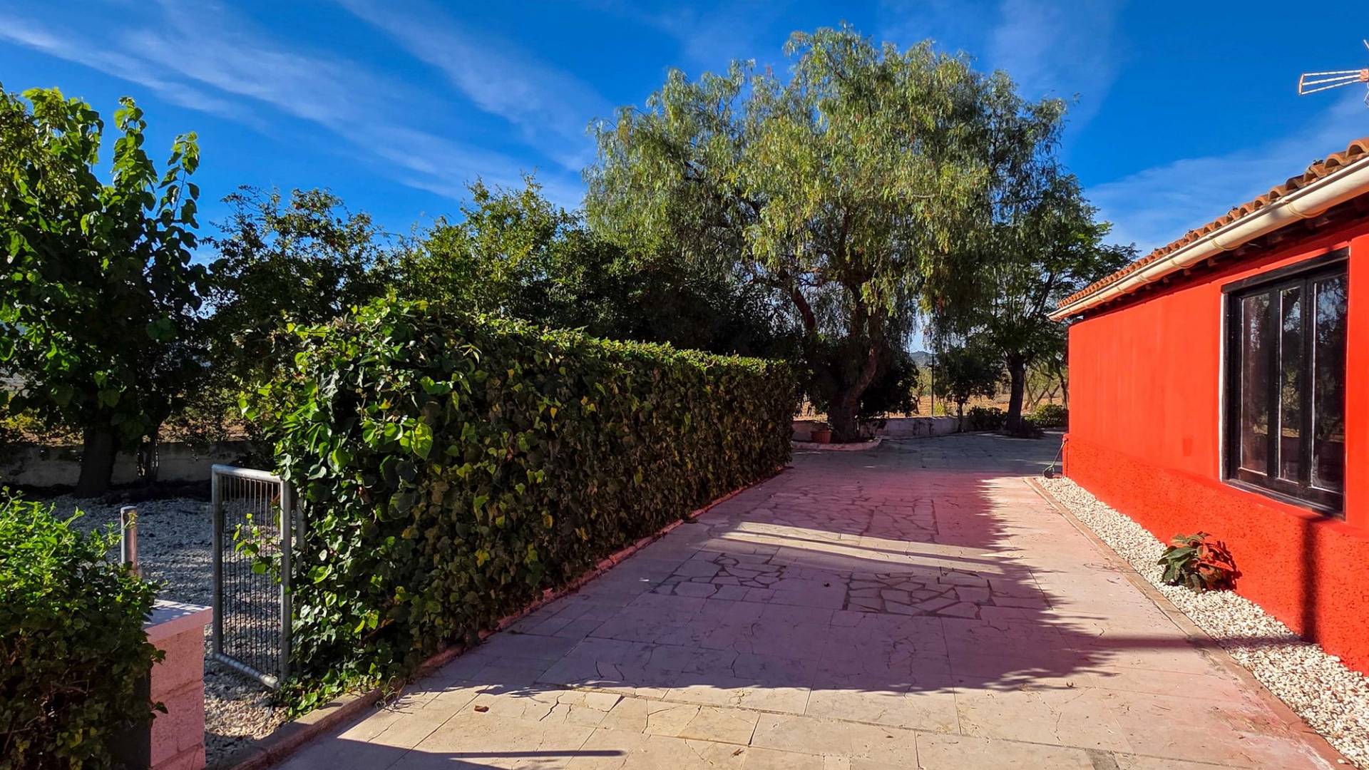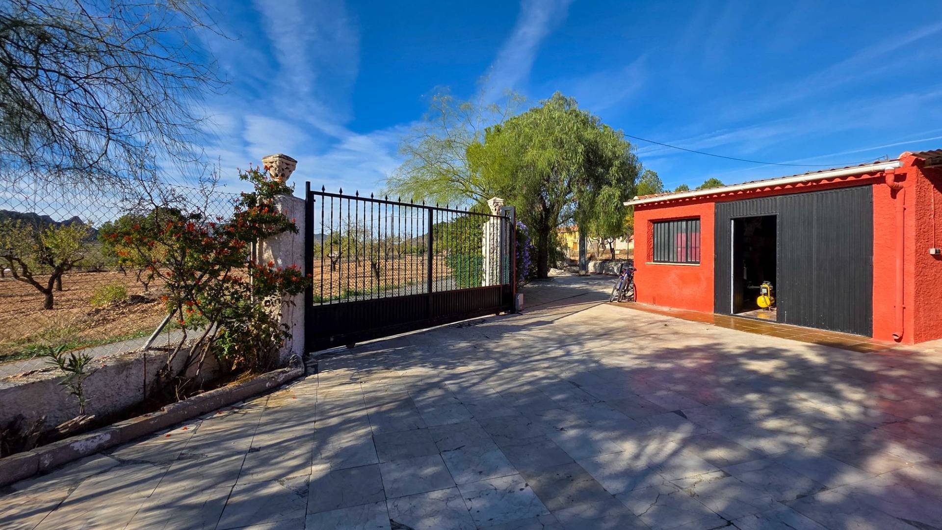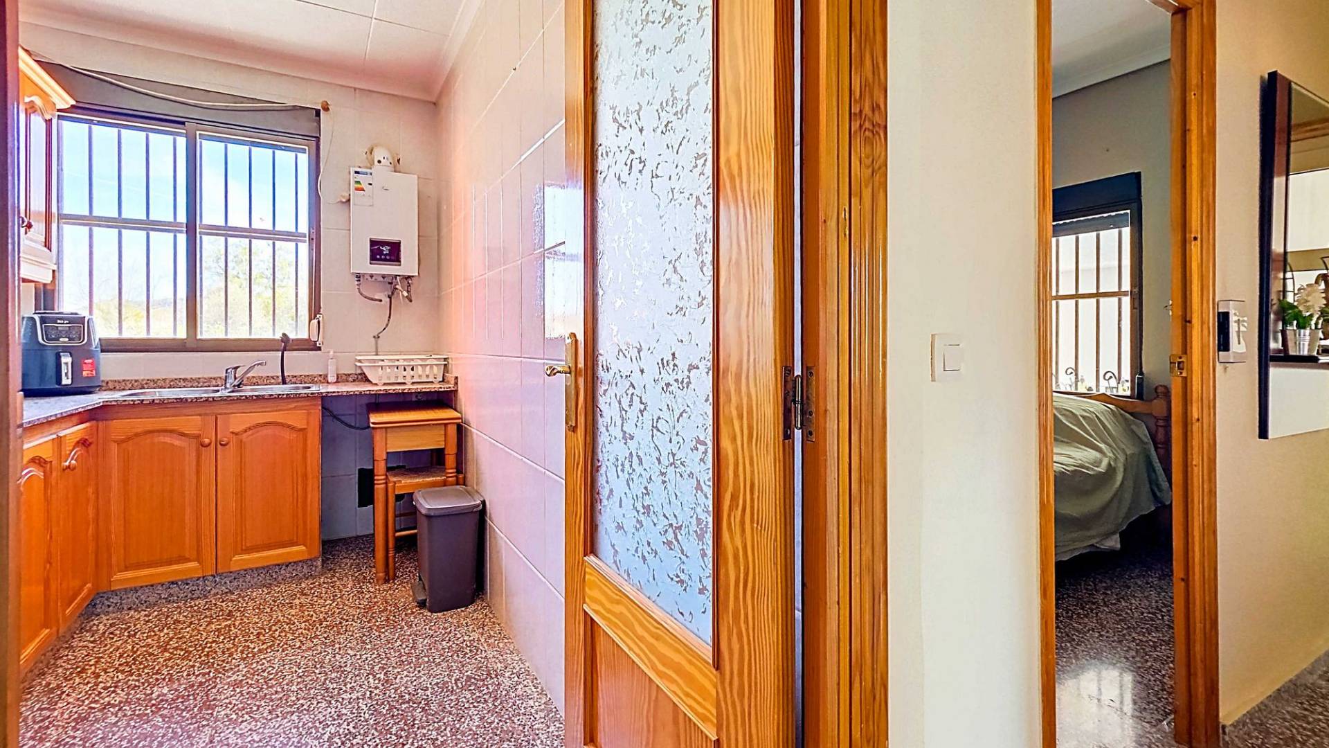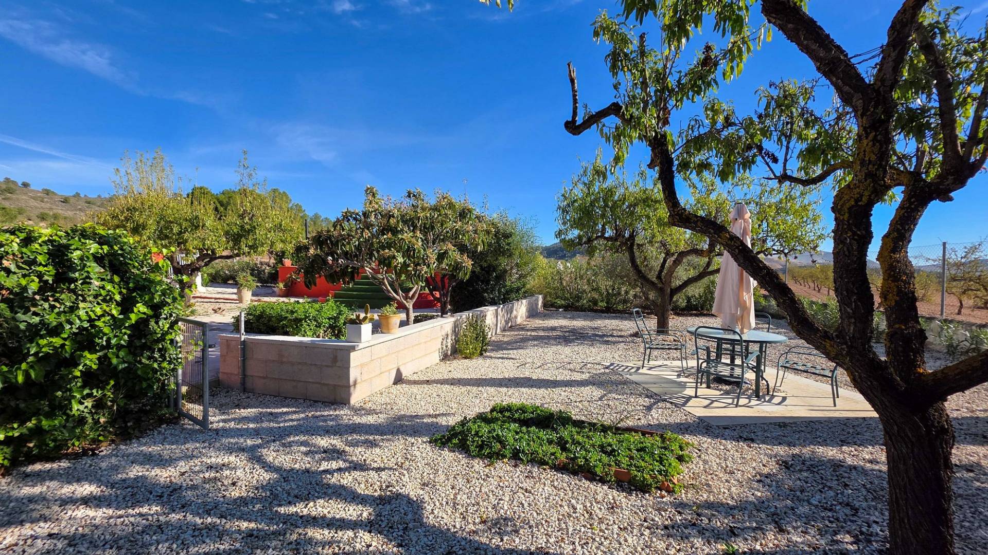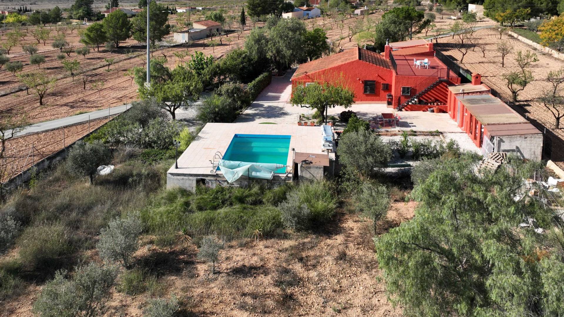 Amplia casa de campo lista para entrar a vivir, con garaje y unas vistas abiertas impresionantes tanto desde la zona del jardín y la piscina como desde la gran azotea. Esta vivienda está en venta en exclusiva, lo que significa que todos los documentos han sido revisados previamente y que todo está en orden o se puede regularizar. La parcela La parcela está completamente vallada y se accede por un portón eléctrico. Hay un garaje amplio y la parte entre el garaje y la vivienda cuenta con una zona cubierta para aparcar dos coches a la sombra. El garaje también podría destinarse a otro uso, como una oficina en casa. En la parte trasera de la vivienda se encuentran dos trasteros y un baño con ducha. La piscina está situada en una zona elevada del jardín y hay varios rincones agradables para sentarse tanto al sol como a la sombra y disfrutar del estilo de vida al aire libre. La vivienda La casa, toda en una planta, tiene dos accesos y mucho espacio para una familia grande o, con algunas adaptaciones, para dos viviendas independientes. Hay una cocina-comedor muy amplia con estufa de pellets conectada a la terraza. Desde la cocina, un pasillo da acceso a cuatro dormitorios y a un trastero. Otro pasillo lleva al baño, un dormitorio adicional y una segunda cocina. En esta parte también se encuentra un salón muy amplio con estufa de leña. Por último, hay acceso a una gran estancia extra que ofrece espacio tanto para una zona de estar como de comedor. Desde aquí se accede por un lado a la terraza principal y por el otro a la terraza con piscina. Mediante una escalera exterior se llega a la azotea, que ofrece unas vistas fantásticas a los alrededores. Instalaciones Además de las estufas, hay aire acondicionado (frío/calor). La vivienda está conectada a la red de agua y electricidad. Las ventanas tienen mosquiteras enrollables. Ubicación La vivienda está en una zona tranquila cerca de los pueblos de Algueña y Pinoso. Un entorno rural donde aún se respira la auténtica vida española. Pinoso tiene mercado dos veces por semana y Algueña una vez por semana. Todas las comodidades diarias están cerca: supermercados, colegios, centro médico, instalaciones deportivas y una buena oferta de restaurantes. Hay muchas rutas para caminar, hacer senderismo o ir en bici, rodeadas de almendros, olivos y viñedos — todo en un clima mediterráneo agradable. Tanto los aeropuertos de Alicante y Murcia como las playas están a menos de una hora. Contáctanos hoy mismo para organizar una visita.