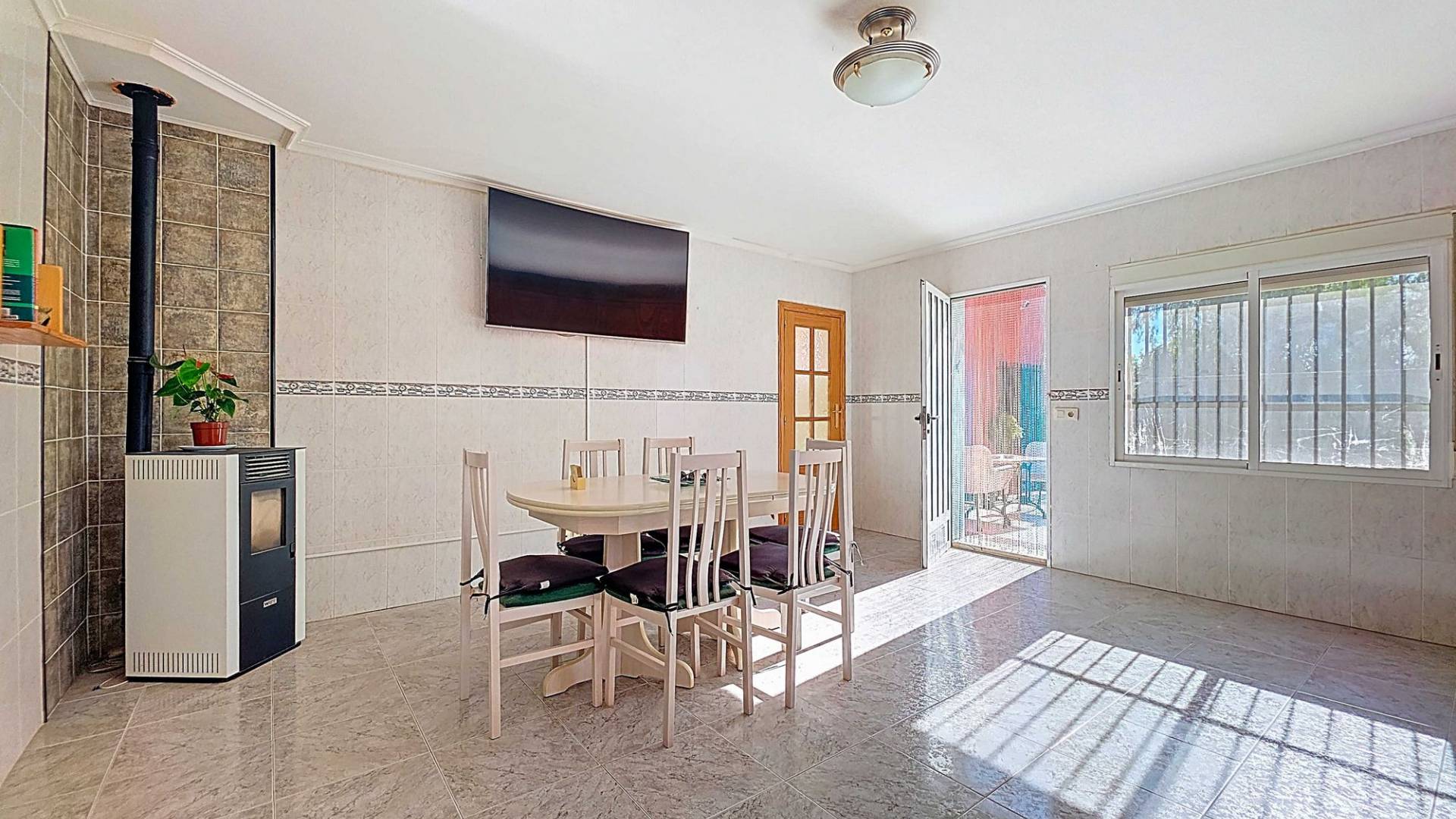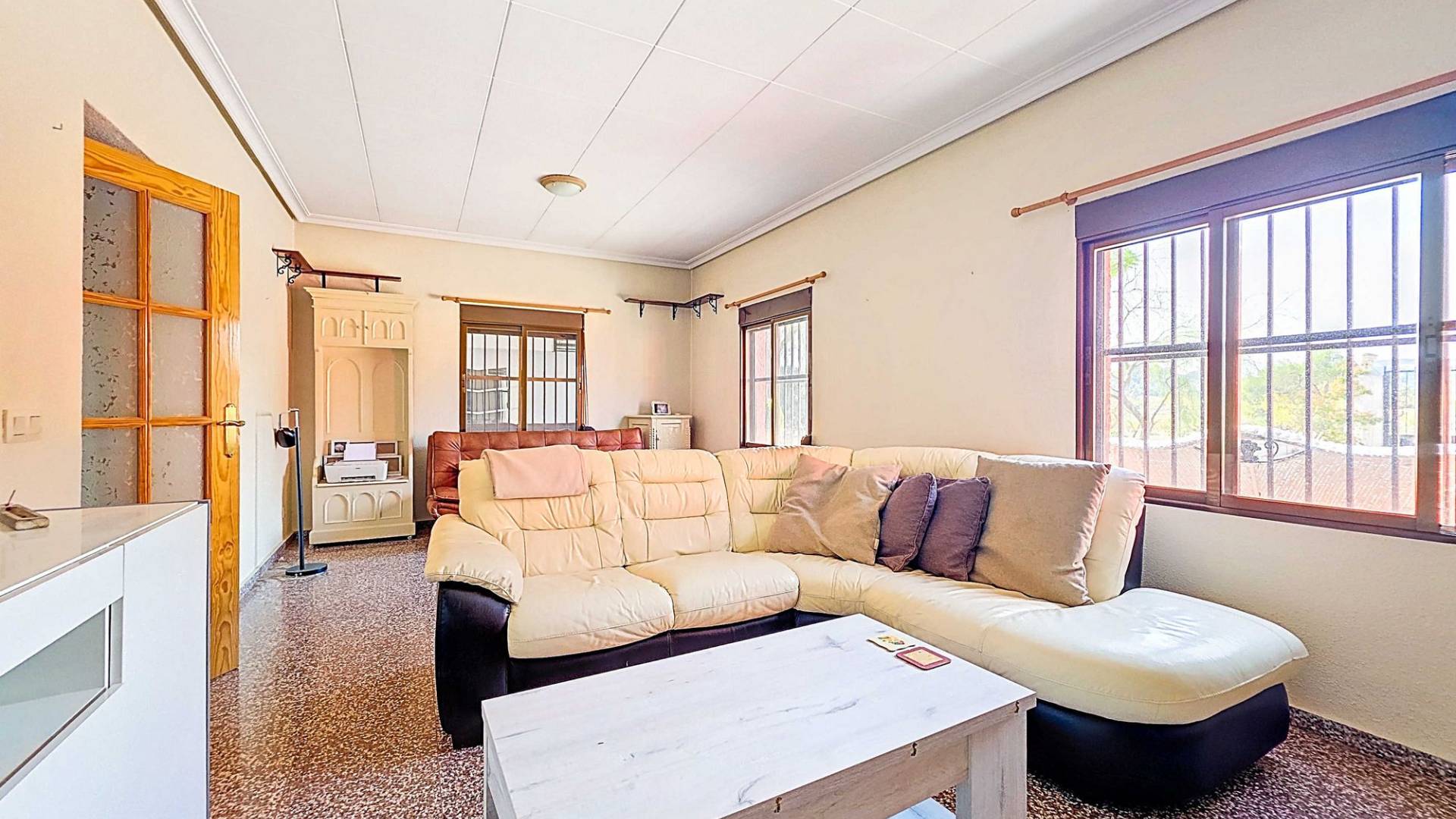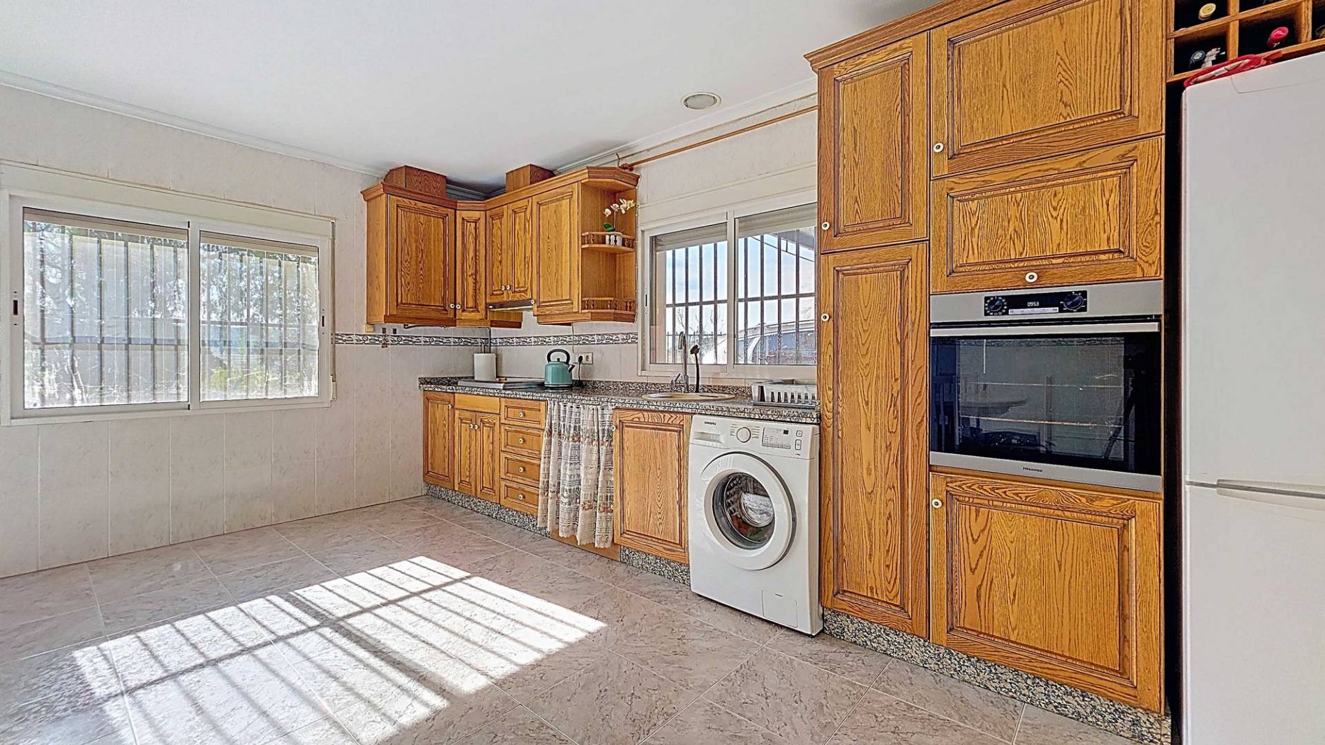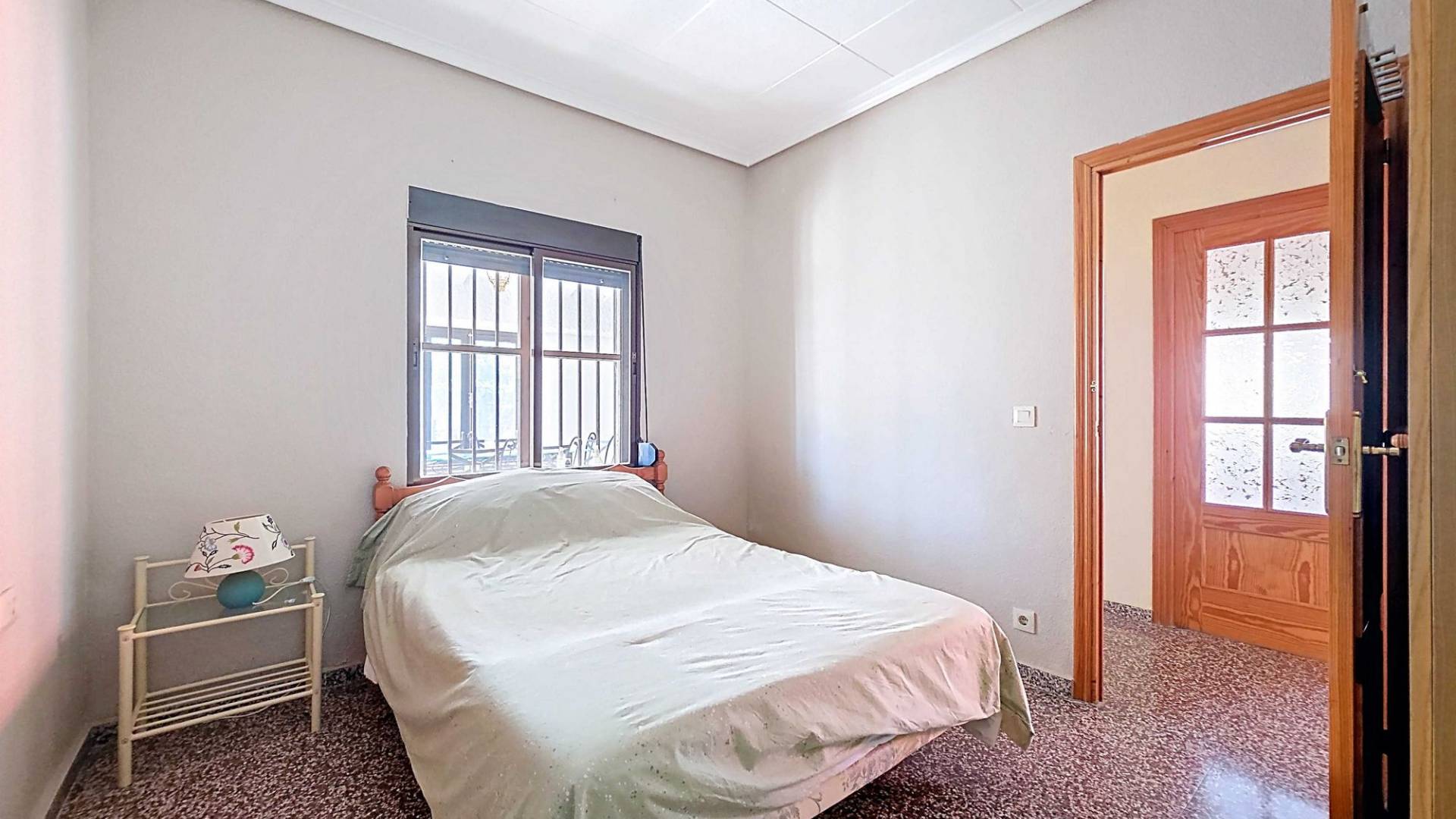 Amplia casa de campo lista para entrar a vivir, con garaje y unas vistas abiertas impresionantes tanto desde la zona del jardín y la piscina como desde la gran azotea. Esta vivienda está en venta en exclusiva, lo que significa que todos los documentos han sido revisados previamente y que todo está en orden o se puede regularizar. La parcela La parcela está completamente vallada y se accede por un portón eléctrico. Hay un garaje amplio y la parte entre el garaje y la vivienda cuenta con una zona cubierta para aparcar dos coches a la sombra. El garaje también podría destinarse a otro uso, como una oficina en casa. En la parte trasera de la vivienda se encuentran dos trasteros y un baño con ducha. La piscina está situada en una zona elevada del jardín y hay varios rincones agradables para sentarse tanto al sol como a la sombra y disfrutar del estilo de vida al aire libre. La vivienda La casa, toda en una planta, tiene dos accesos y mucho espacio para una familia grande o, con algunas adaptaciones, para dos viviendas independientes. Hay una cocina-comedor muy amplia con estufa de pellets conectada a la terraza. Desde la cocina, un pasillo da acceso a cuatro dormitorios y a un trastero. Otro pasillo lleva al baño, un dormitorio adicional y una segunda cocina. En esta parte también se encuentra un salón muy amplio con estufa de leña. Por último, hay acceso a una gran estancia extra que ofrece espacio tanto para una zona de estar como de comedor. Desde aquí se accede por un lado a la terraza principal y por el otro a la terraza con piscina. Mediante una escalera exterior se llega a la azotea, que ofrece unas vistas fantásticas a los alrededores. Instalaciones Además de las estufas, hay aire acondicionado (frío/calor). La vivienda está conectada a la red de agua y electricidad. Las ventanas tienen mosquiteras enrollables. Ubicación La vivienda está en una zona tranquila cerca de los pueblos de Algueña y Pinoso. Un entorno rural donde aún se respira la auténtica vida española. Pinoso tiene mercado dos veces por semana y Algueña una vez por semana. Todas las comodidades diarias están cerca: supermercados, colegios, centro médico, instalaciones deportivas y una buena oferta de restaurantes. Hay muchas rutas para caminar, hacer senderismo o ir en bici, rodeadas de almendros, olivos y viñedos — todo en un clima mediterráneo agradable. Tanto los aeropuertos de Alicante y Murcia como las playas están a menos de una hora. Contáctanos hoy mismo para organizar una visita.