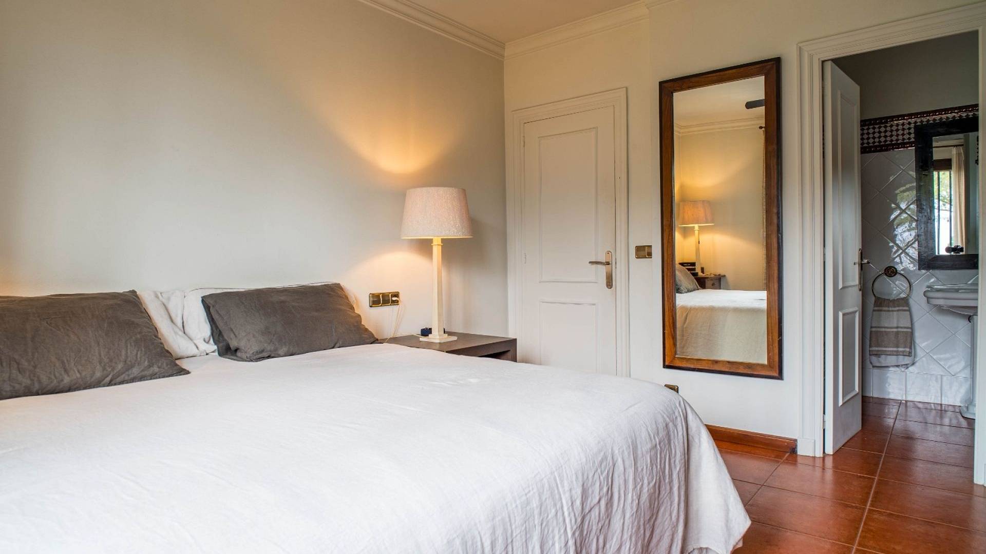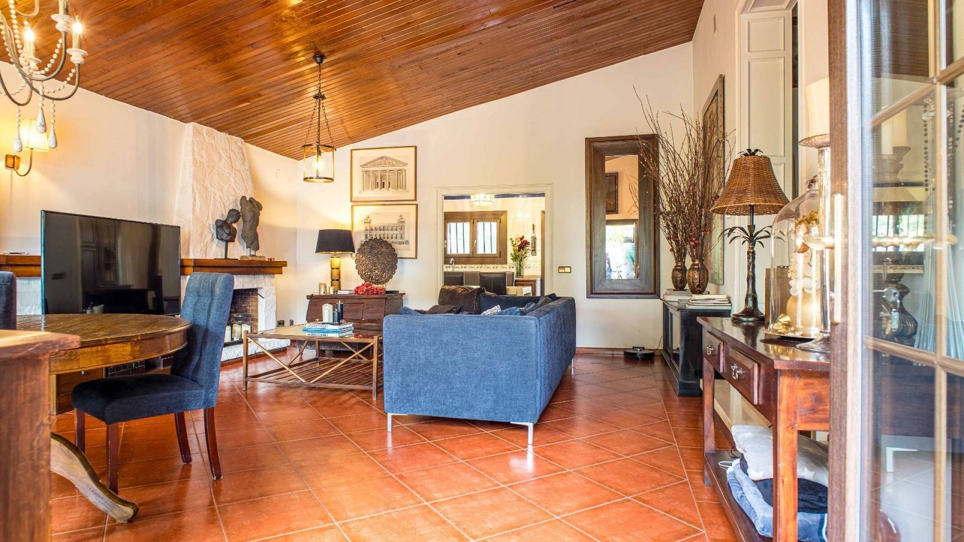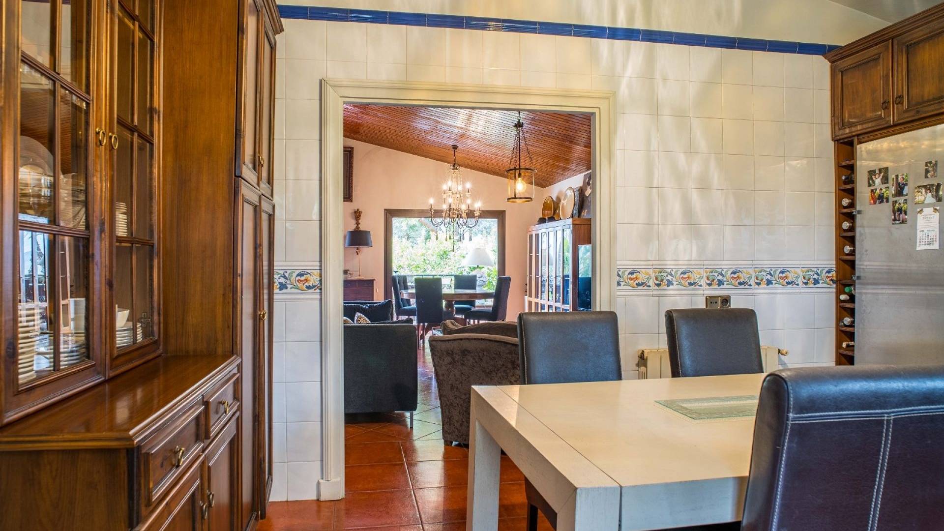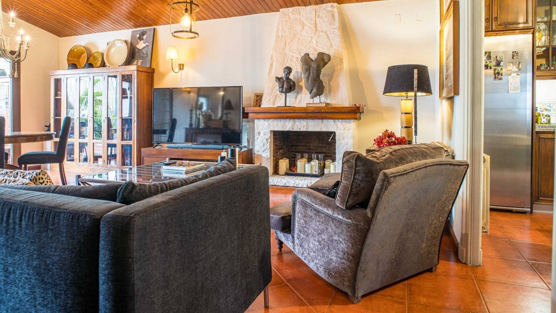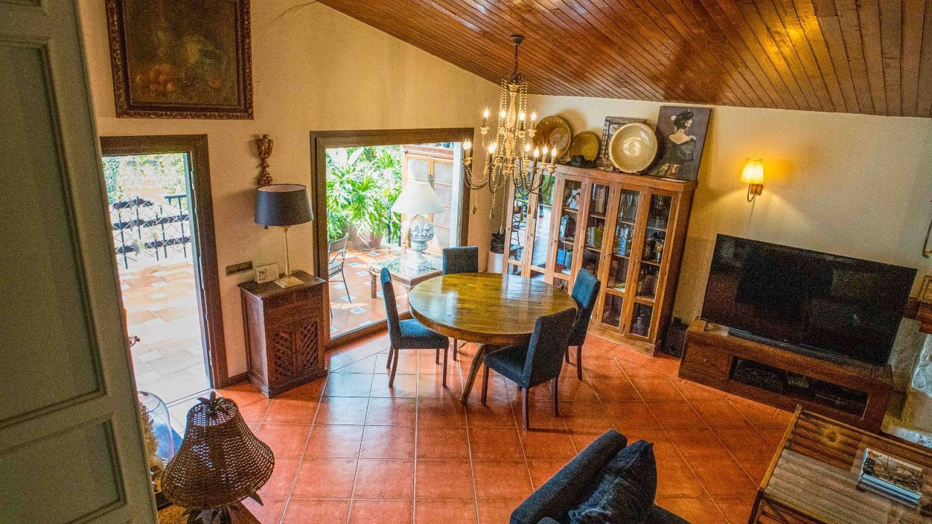 Los espacios habitables tienen un ambiente cálido y clásico mediterráneo. El salón constituye el centro de la casa y ofrece un amplio espacio tanto para relajarse como para recibir invitados. La cocina, de estilo tradicional, está amueblada de forma práctica. Además, en la planta baja hay un lavadero independiente y un aseo con ducha.