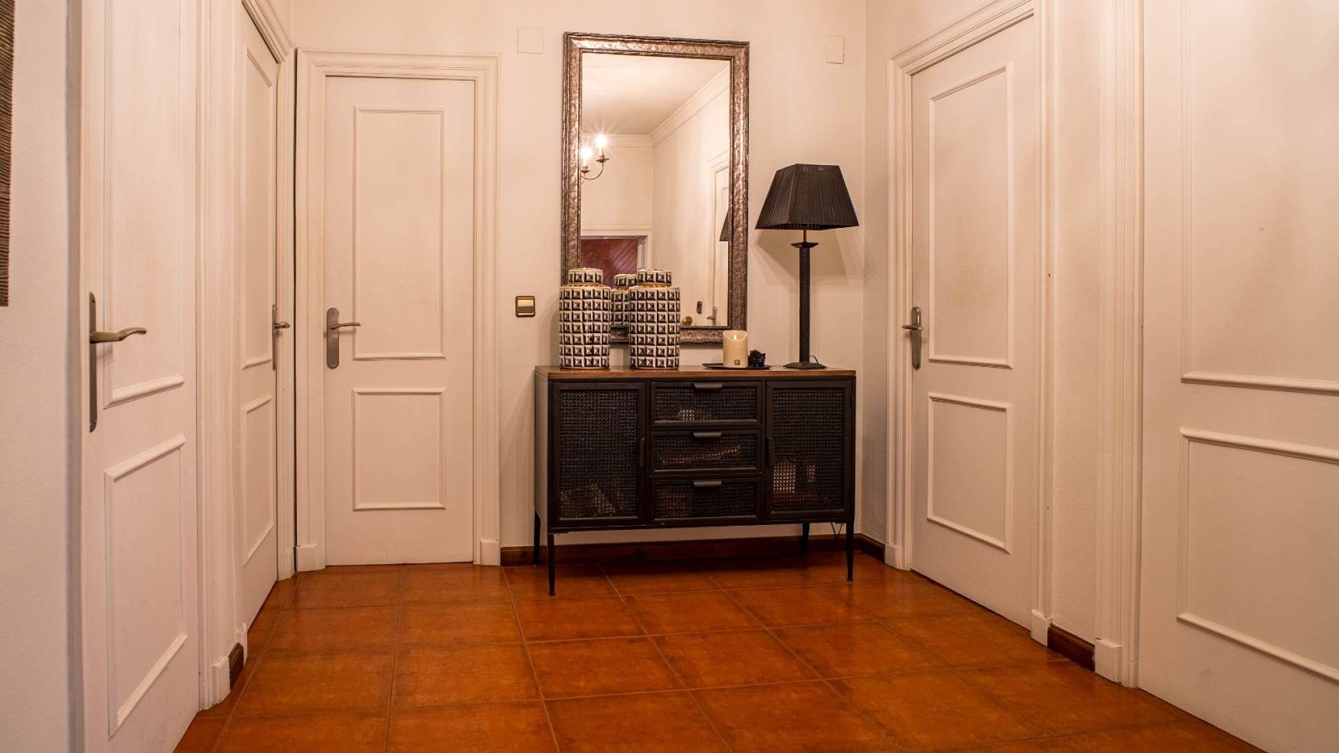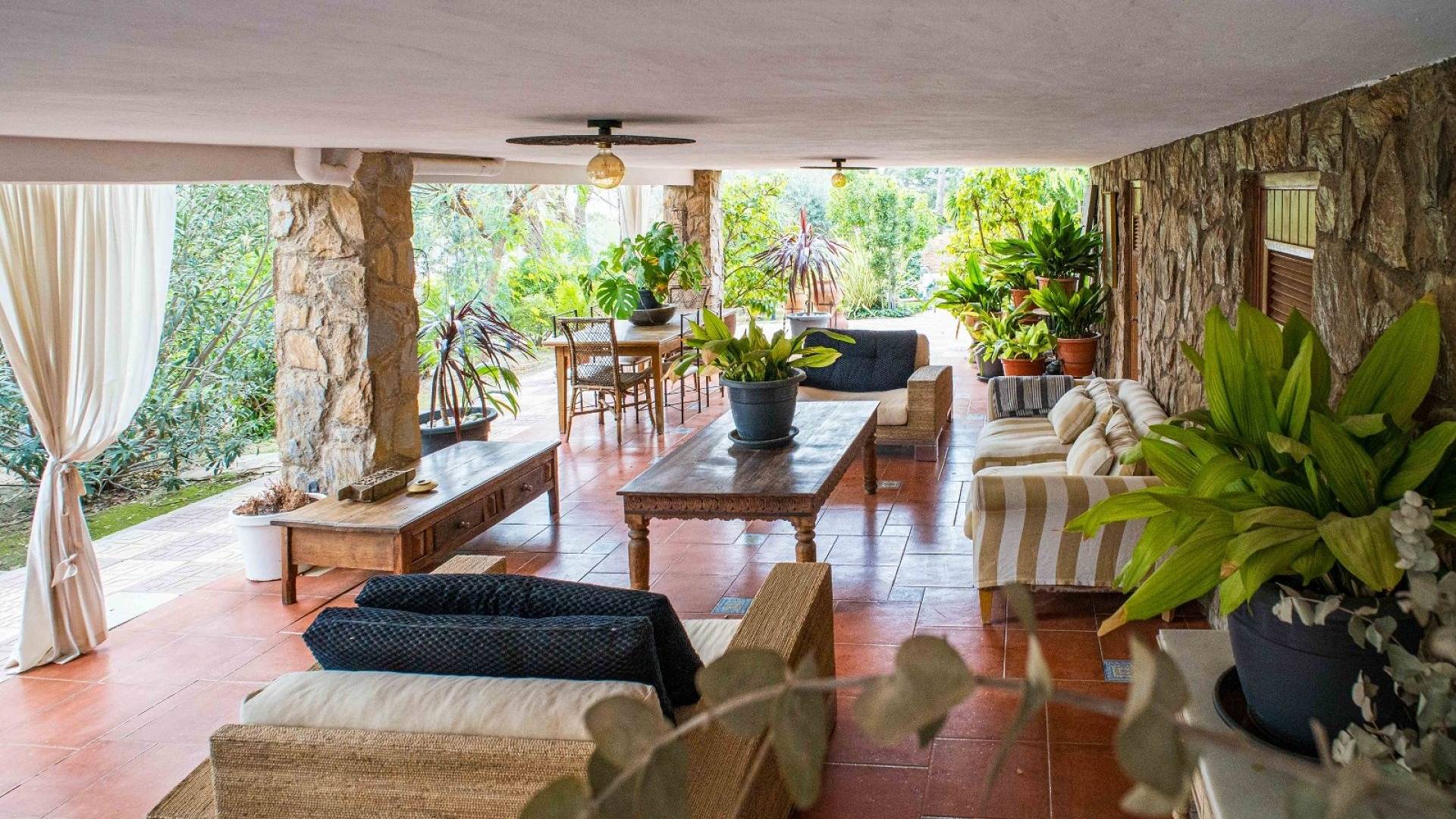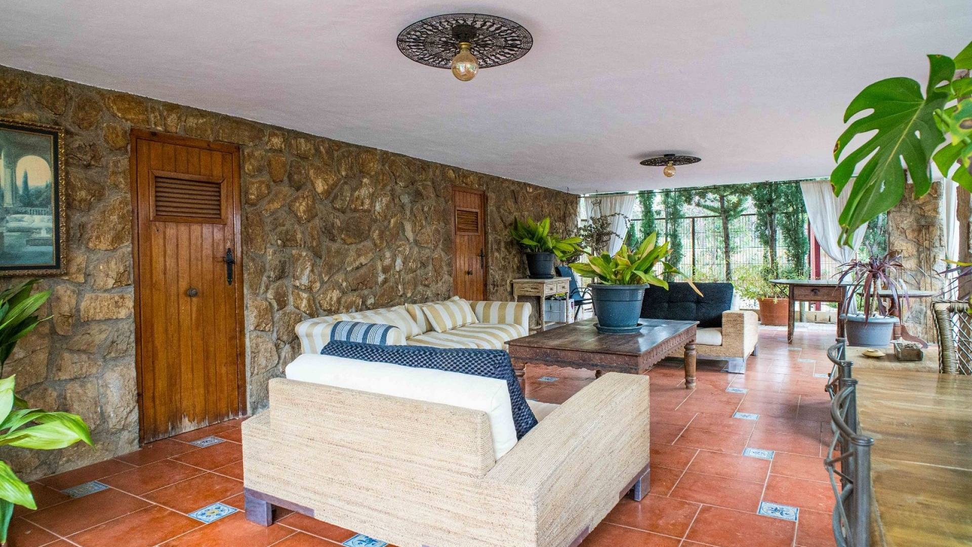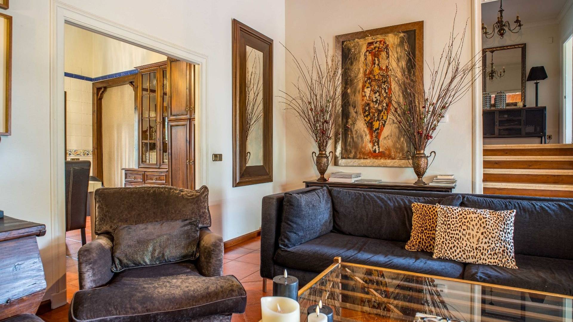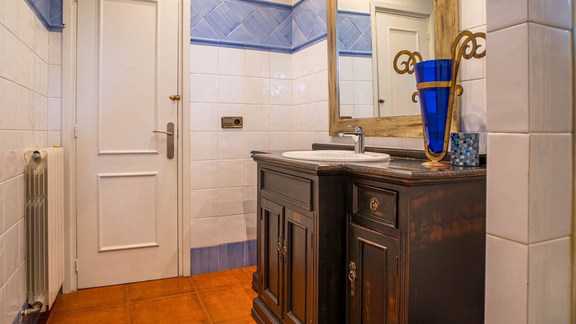 Los espacios habitables tienen un ambiente cálido y clásico mediterráneo. El salón constituye el centro de la casa y ofrece un amplio espacio tanto para relajarse como para recibir invitados. La cocina, de estilo tradicional, está amueblada de forma práctica. Además, en la planta baja hay un lavadero independiente y un aseo con ducha.