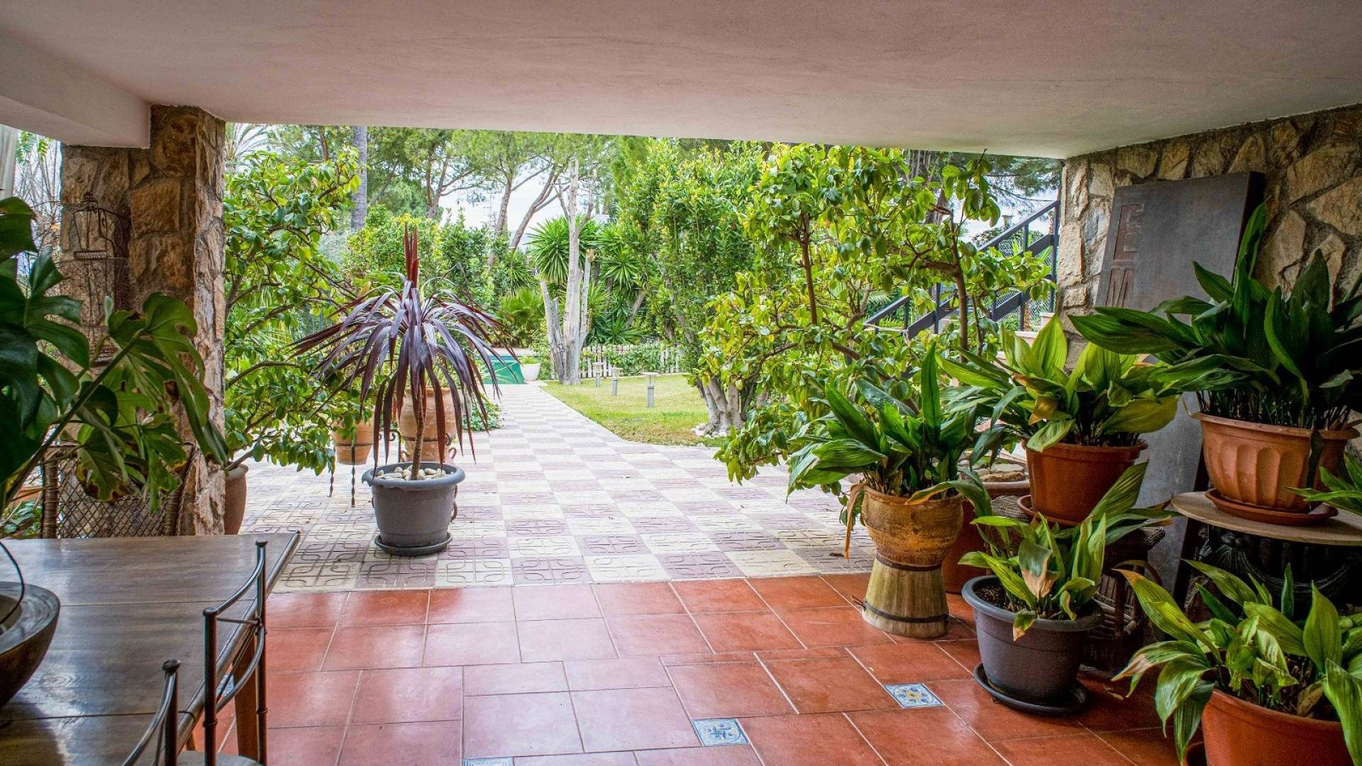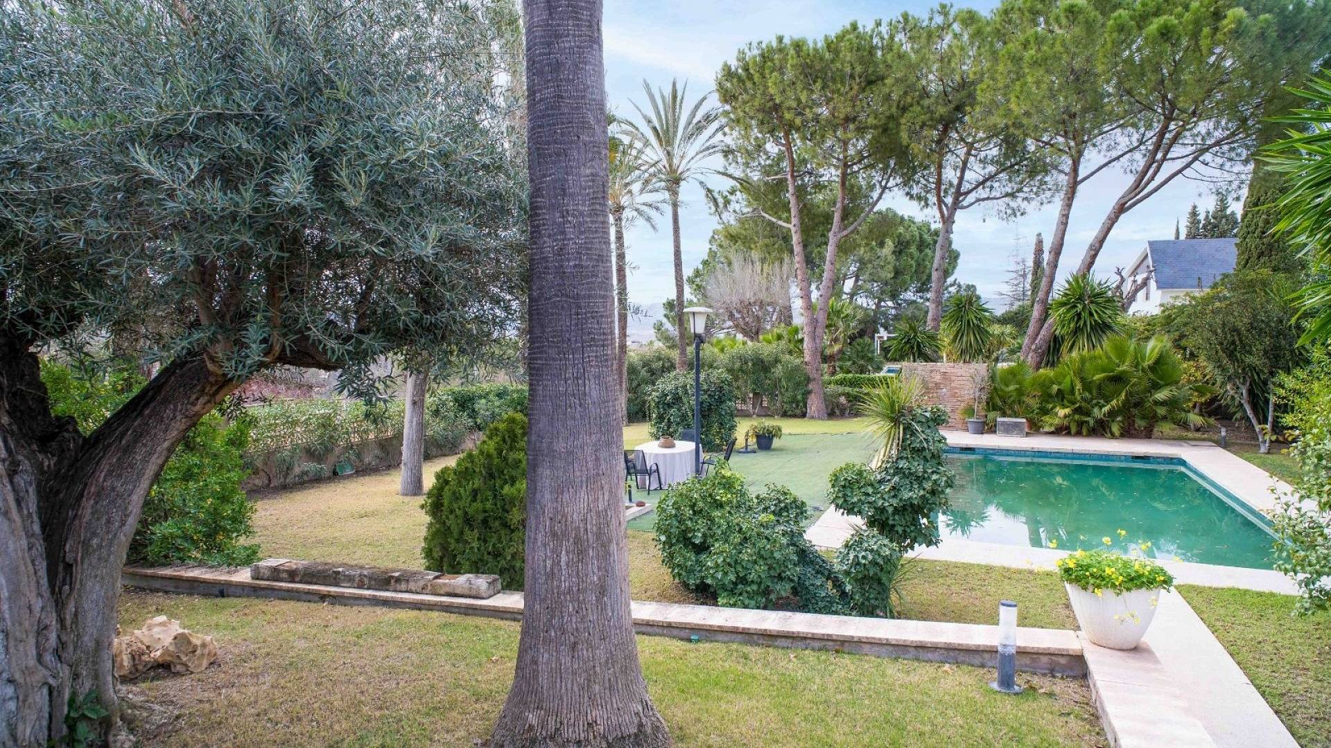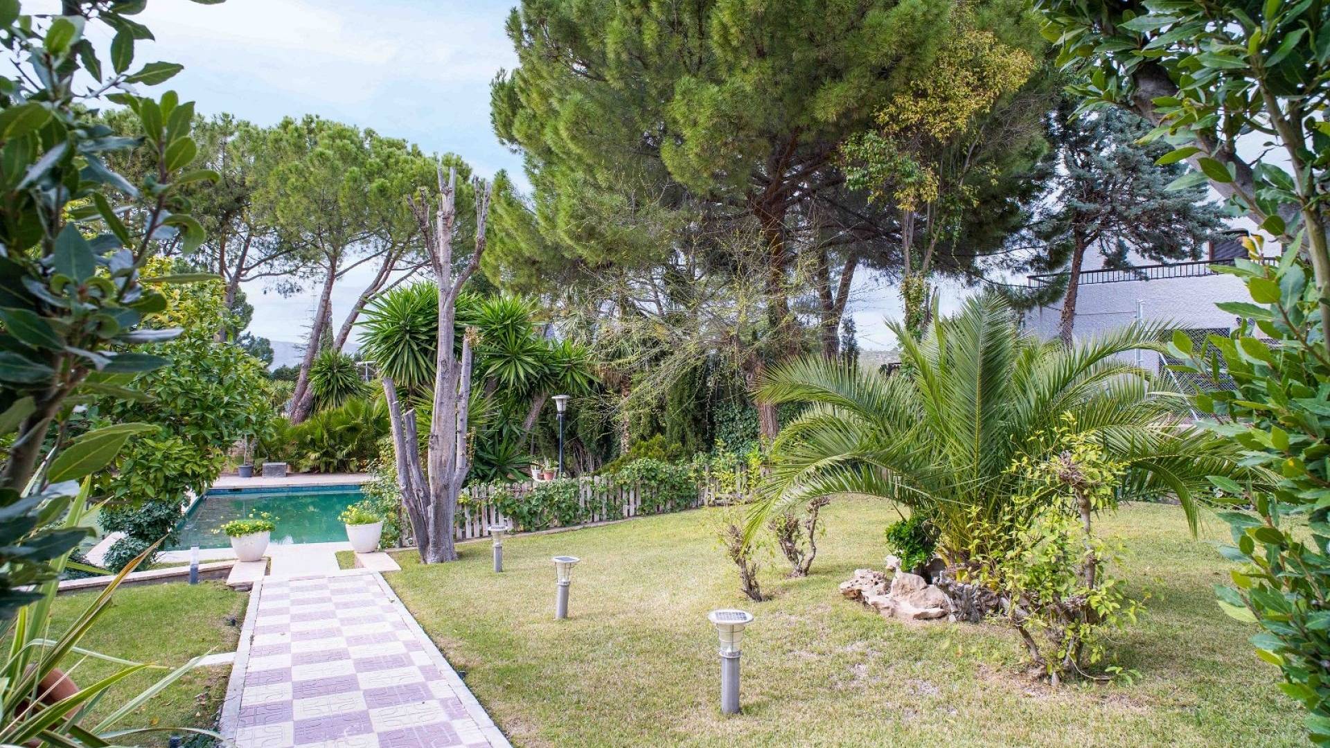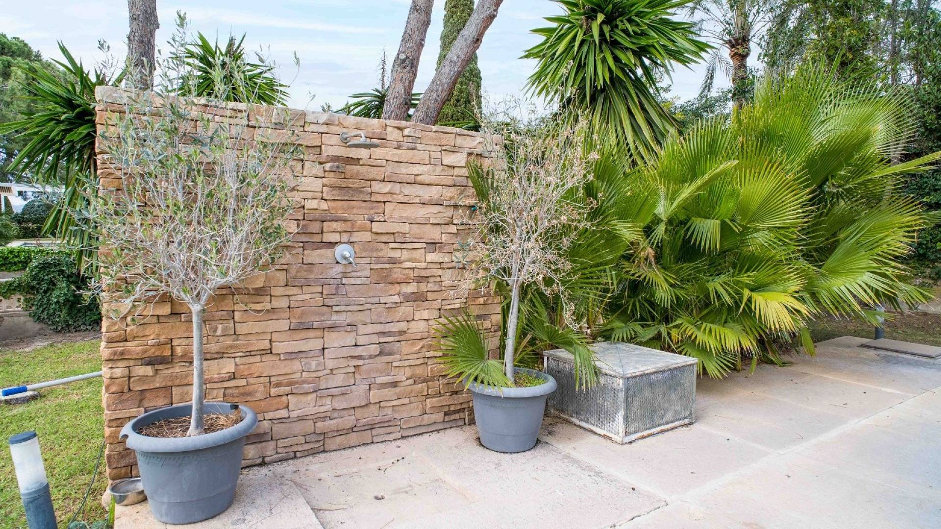 El espacio exterior está cuidadosamente ajardinado con césped, palmeras maduras y varias zonas de estar. La piscina de aproximadamente 56 m² (registrada como deportiva) es el elemento central del jardín. Hay espacio para comer al aire libre, una zona de barbacoa y varias terrazas para disfrutar tanto del sol como de la sombra.