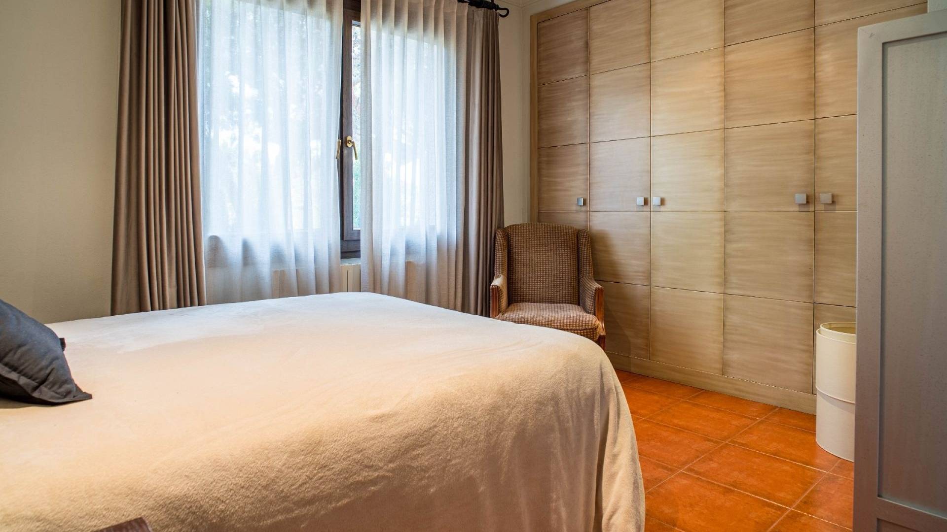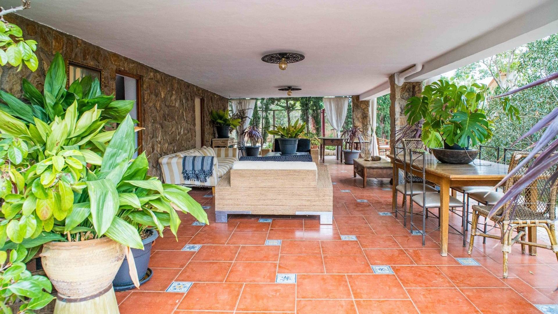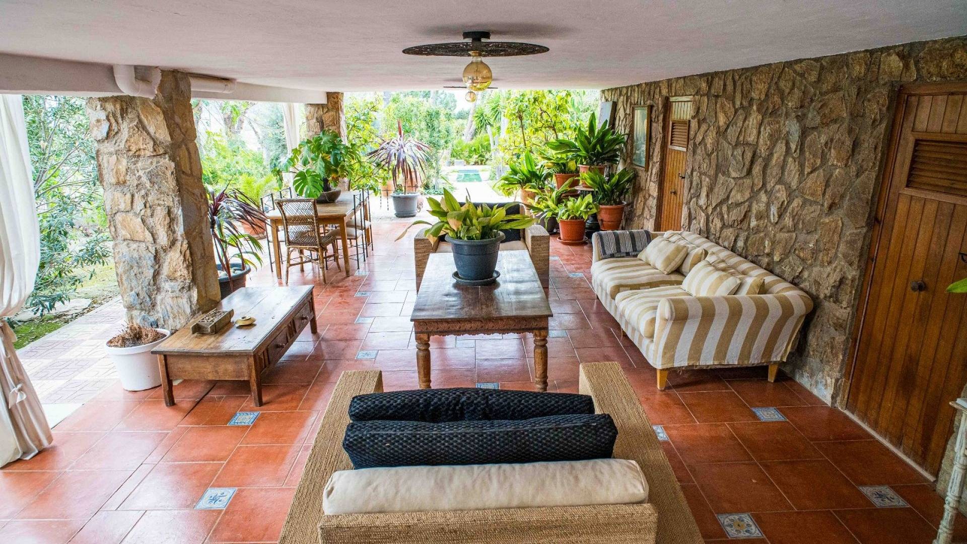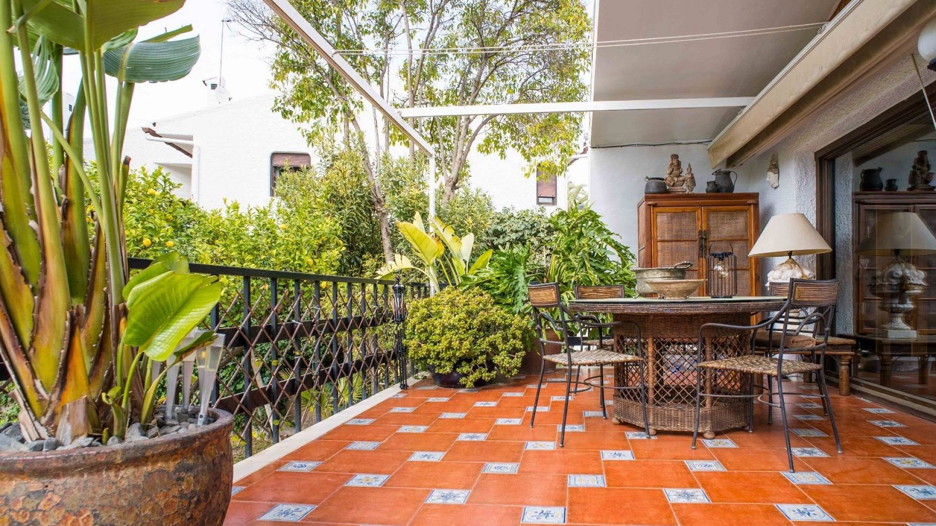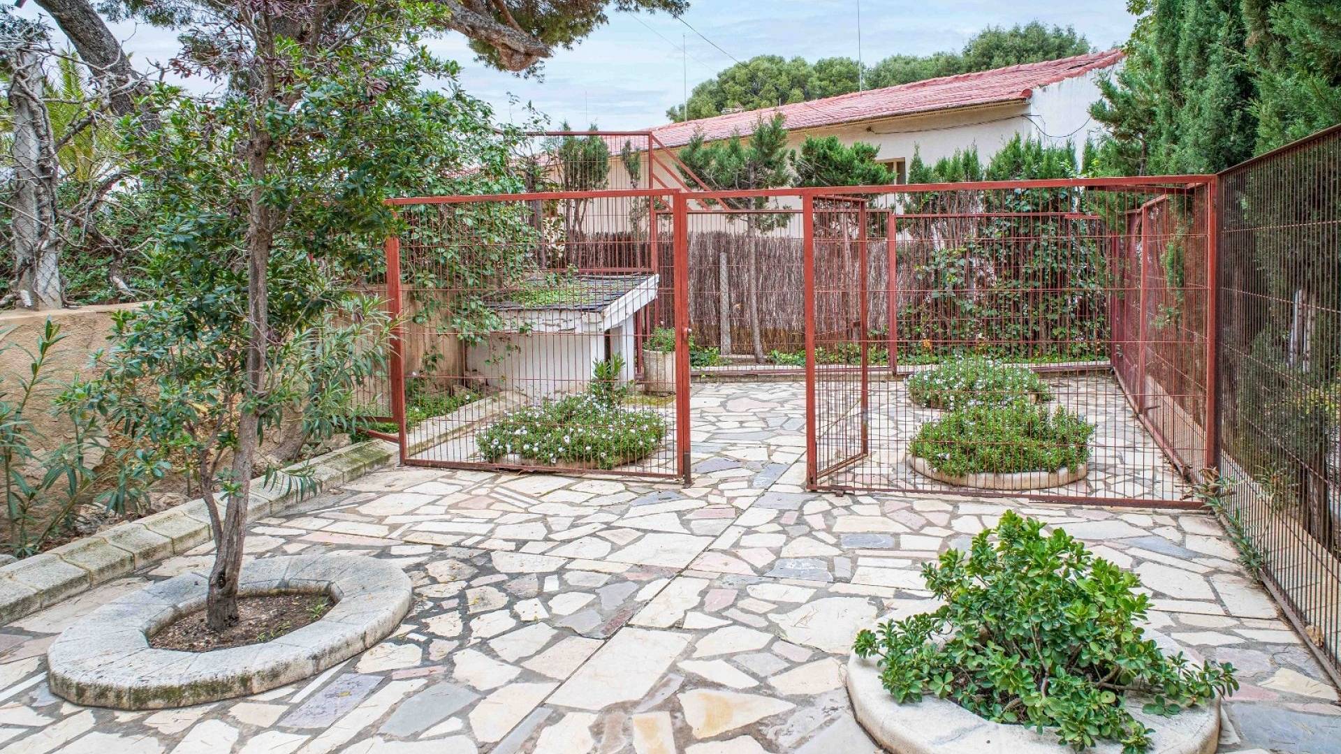 El espacio exterior está cuidadosamente ajardinado con césped, palmeras maduras y varias zonas de estar. La piscina de aproximadamente 56 m² (registrada como deportiva) es el elemento central del jardín. Hay espacio para comer al aire libre, una zona de barbacoa y varias terrazas para disfrutar tanto del sol como de la sombra.