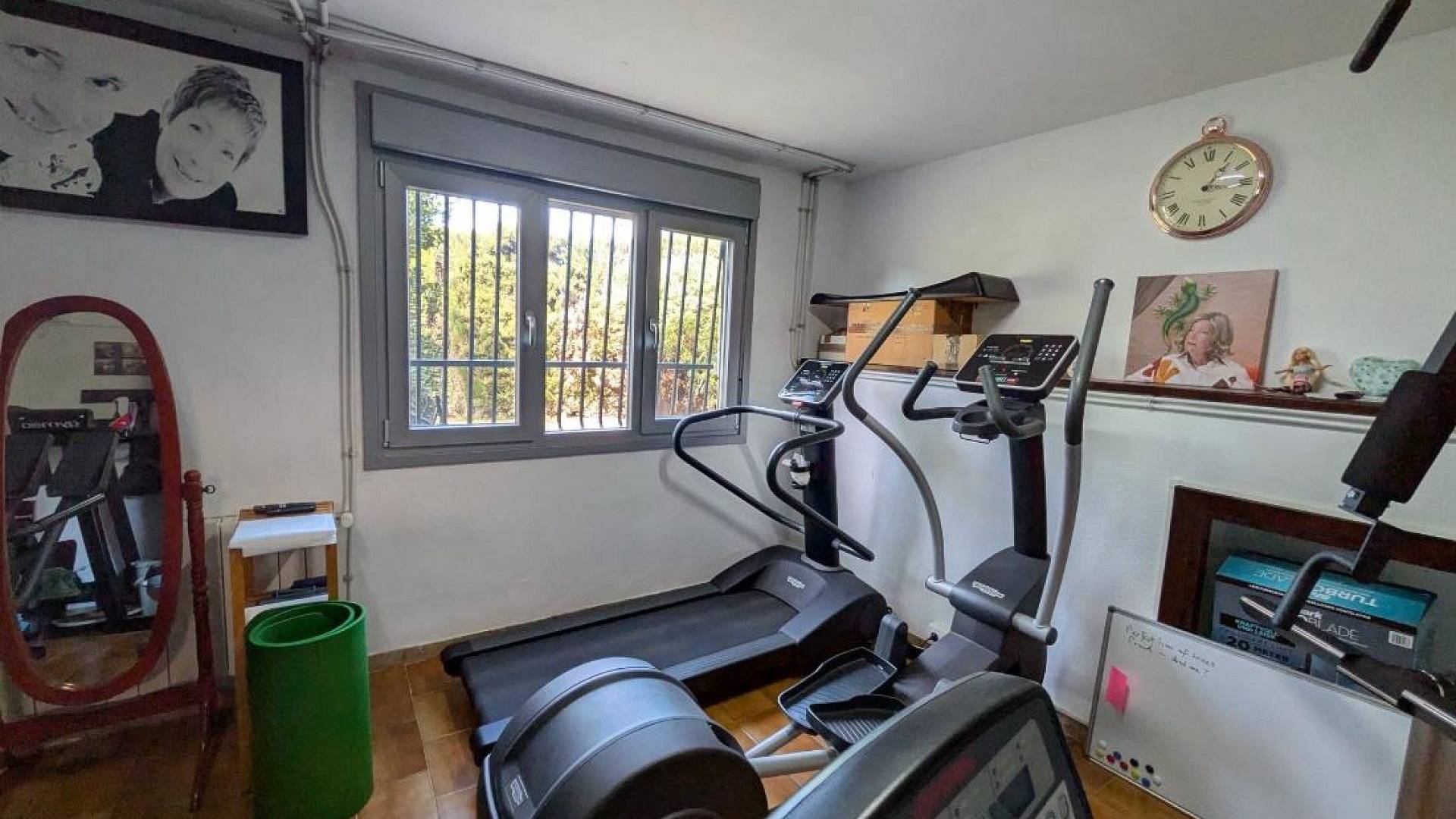 En su interior, la propiedad ofrece aproximadamente 339 metros cuadrados de espacio habitable versátil. El salón principal es elegante y acogedor, con una chimenea de leña como eje central y acceso directo a una soleada terraza. La casa cuenta con cinco amplias habitaciones dobles con armarios empotrados, además de cuatro modernos baños con acabados de alta calidad. Una habitación adicional, actualmente utilizada como gimnasio, ofrece la flexibilidad de convertirse en una sexta habitación, con la posibilidad de crear una séptima si se desea.