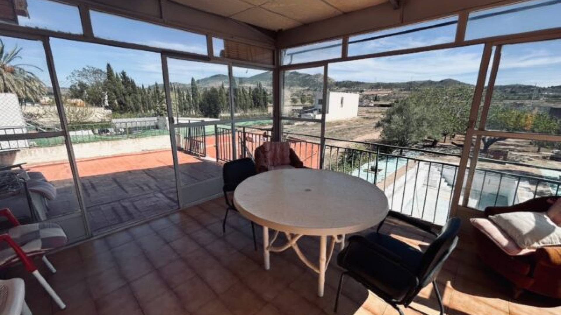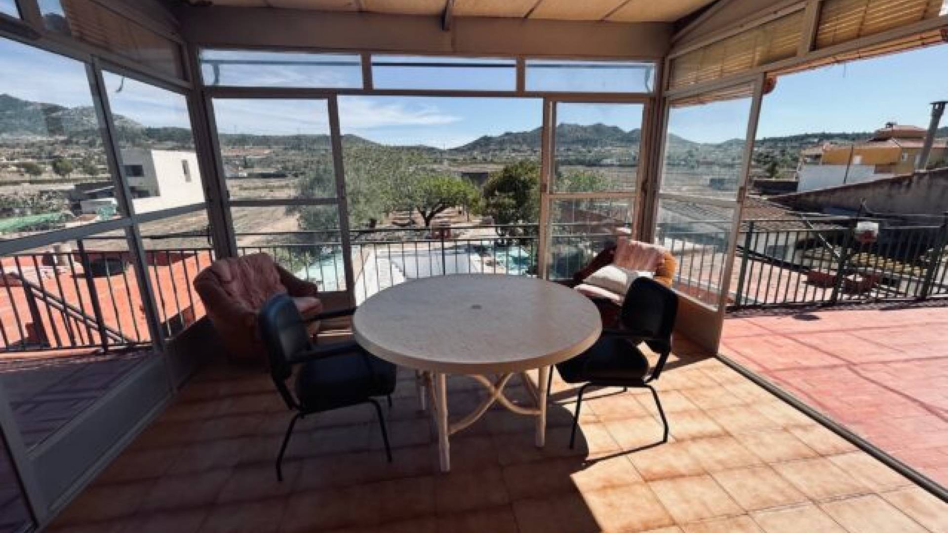 Cette propriété unique a la particularité dêtre située au cur du village de Hondon de los Frailes, donc idéale pour les personnes souhaitant tout faire à pied.La propriété date des années 70 et na jamais été rénovée. Des travaux de rafraichissement (modernisation) sont à prévoir. La propriété fait 469m² au total, répartis sur 2 niveaux.Au rez-de-chaussée, se trouvent un grand parking (5 voitures), ainsi que des bureaux et autres débarras.Au premier étage (non communiquant avec le garage), vous avez la maison qui fait environs 130m². Cette dernière est composée dun hall dentrée avec un couloir traversant la maison. Vous avez un salon/salle à manger avec feu ouvert, 3 spacieuses chambres à coucher, une salle de bain et au bout du couloir se trouve une grande cuisine avec feu ouvert donnant sur une véranda avec de superbes vues sur les environs. De chaque côté de la véranda, vous avez également de grandes terrasses.A larrière de la propriété, vous avez une très grande piscine, une toilette extérieure, des débarras et un jardin composé dolivier.Au bout du jardin, se trouve un très grand hangar de 124m² avec accès direct à la route.Le terrain fait au total 1.076m². 692m² pour la parcelle avec la maison et la piscine et le reste pour le jardin doliviers et le hangar.Cette propriété a, de par sa situation, de multiples possibilités telles quutiliser les places de parking et/ou le hangar à des fins commerciales.La maison avec le garage est à vendre pour 250.000 et le hangar avec le jardin pour 50.000.