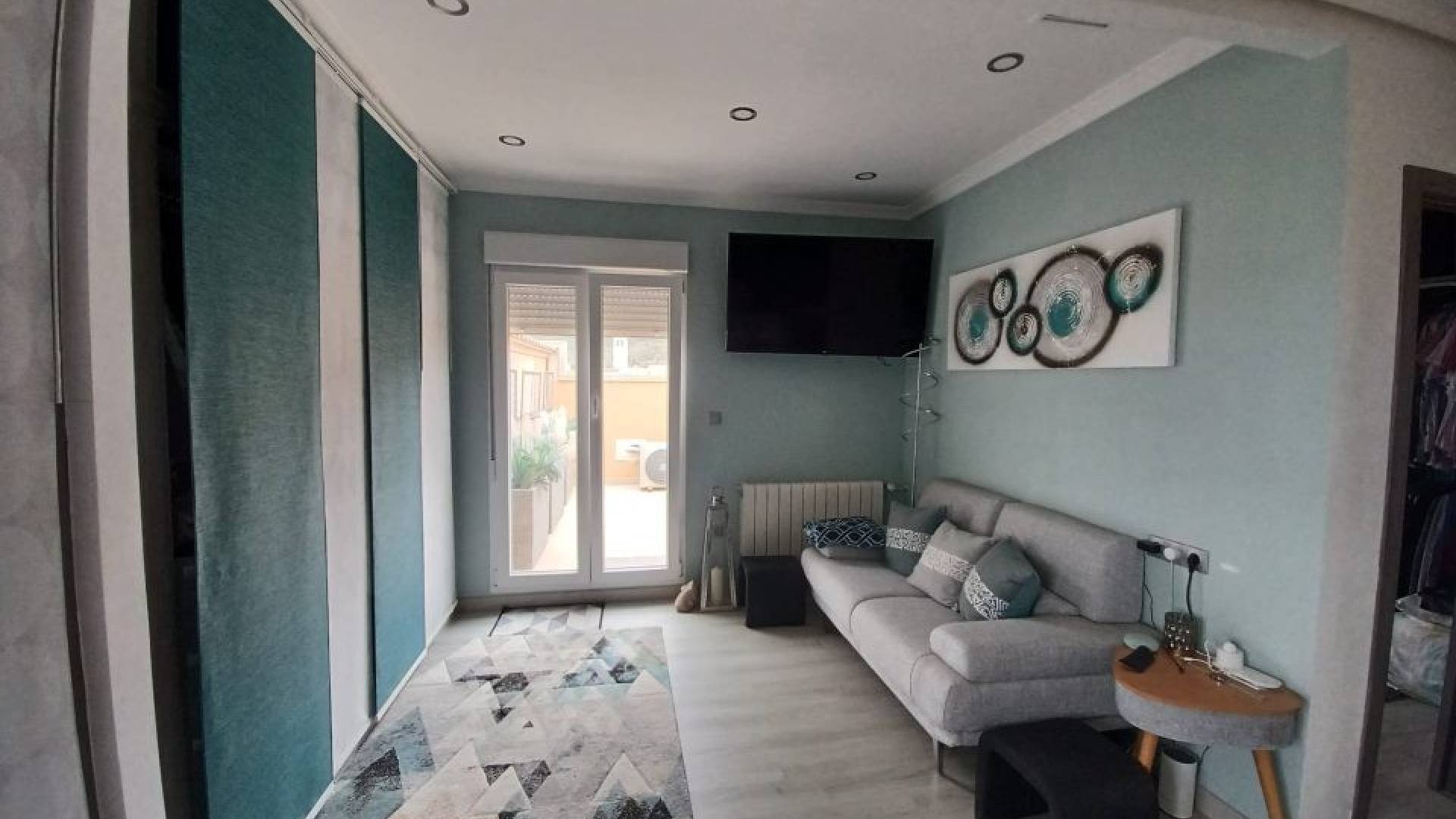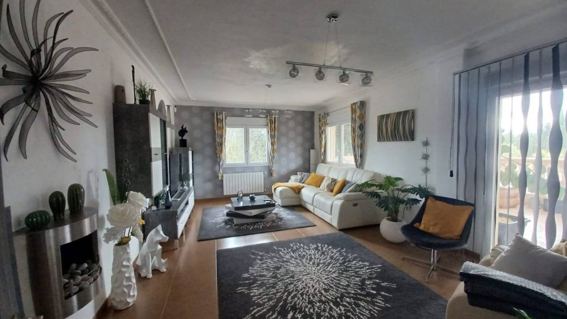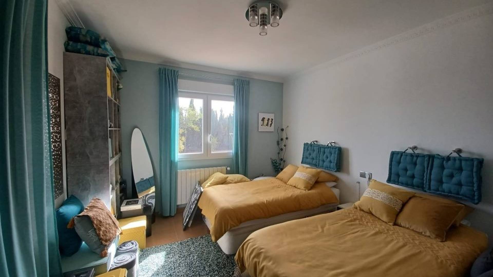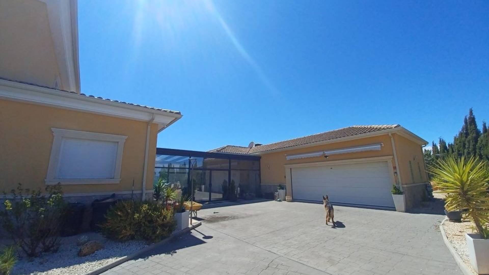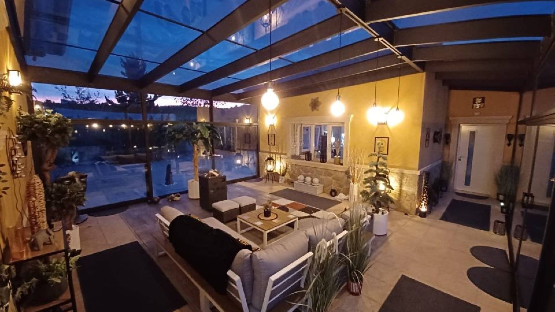 Entre la maison et l’annexe se trouve une grande véranda de plus de 60 m2, traitée avec du verre anti-uv pour éviter la chaleur, donc un espace idéal pour recevoir en été ou en hiver. La véranda s’ouvre sur une maison d’amis très spacieuse avec un salon et une cuisine ouverte donnant sur la piscine, un bar, une salle de bains et une chambre, entièrement climatisée (chaud/froid) et avec chauffage central. La porte de la maison d’amis mène