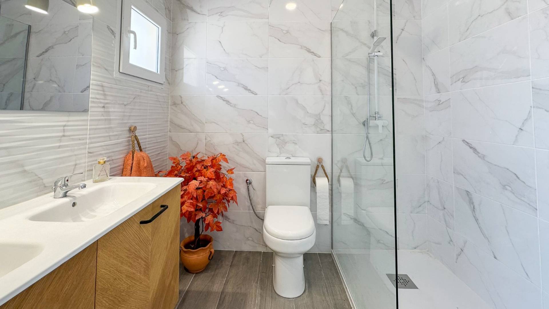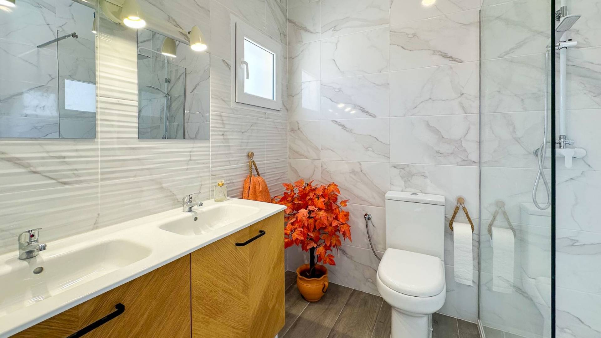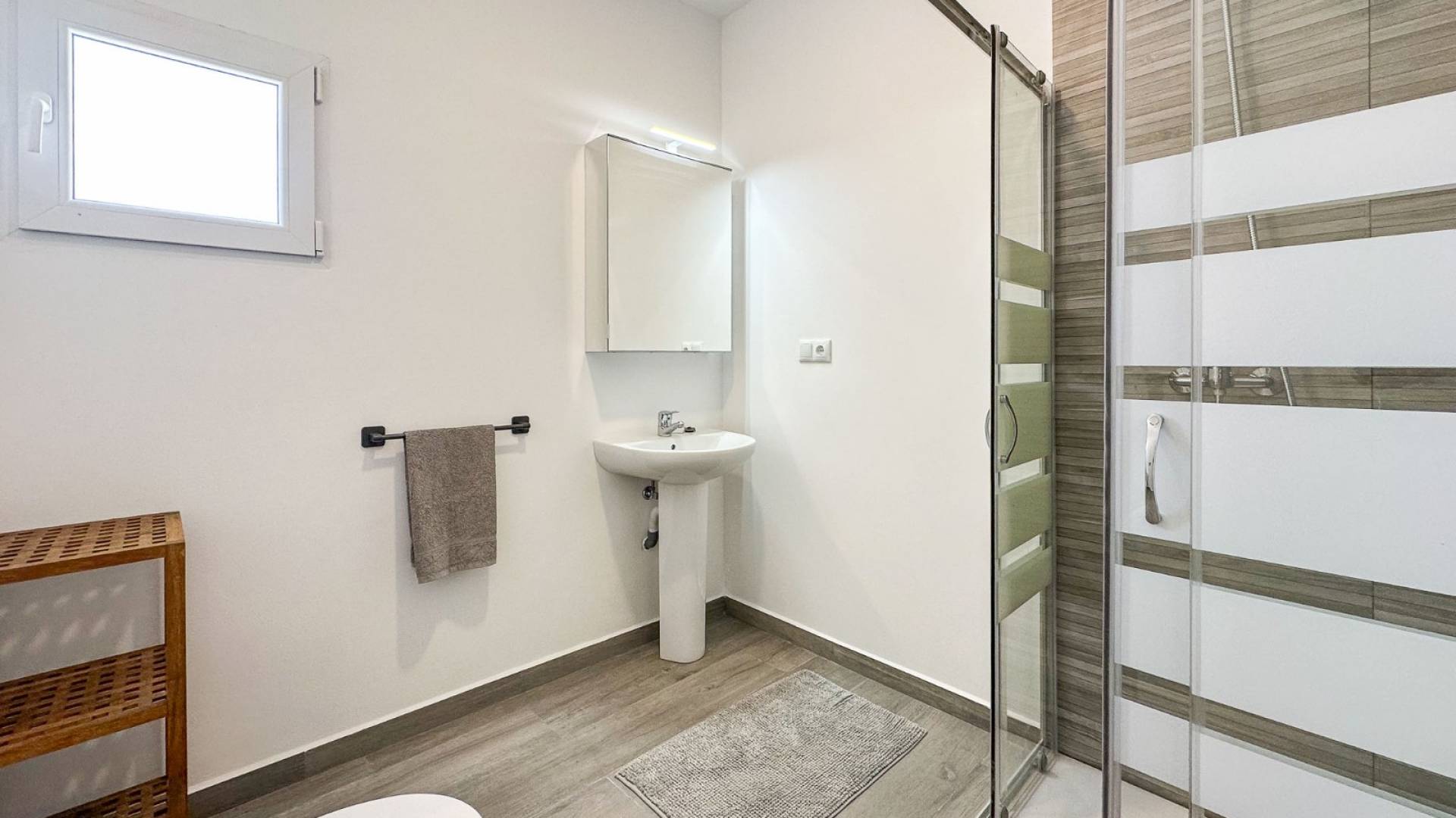 Les fenêtres et portes sont en uPVC de haute qualité avec double vitrage, et les volets électriques peuvent être contrôlés par Wi-Fi ou via des systèmes intelligents comme Alexa. La climatisation est déjà installée au rez-de-chaussée, et la maison dispose également d’un poêle à bois apportant du confort durant les mois les plus froids.