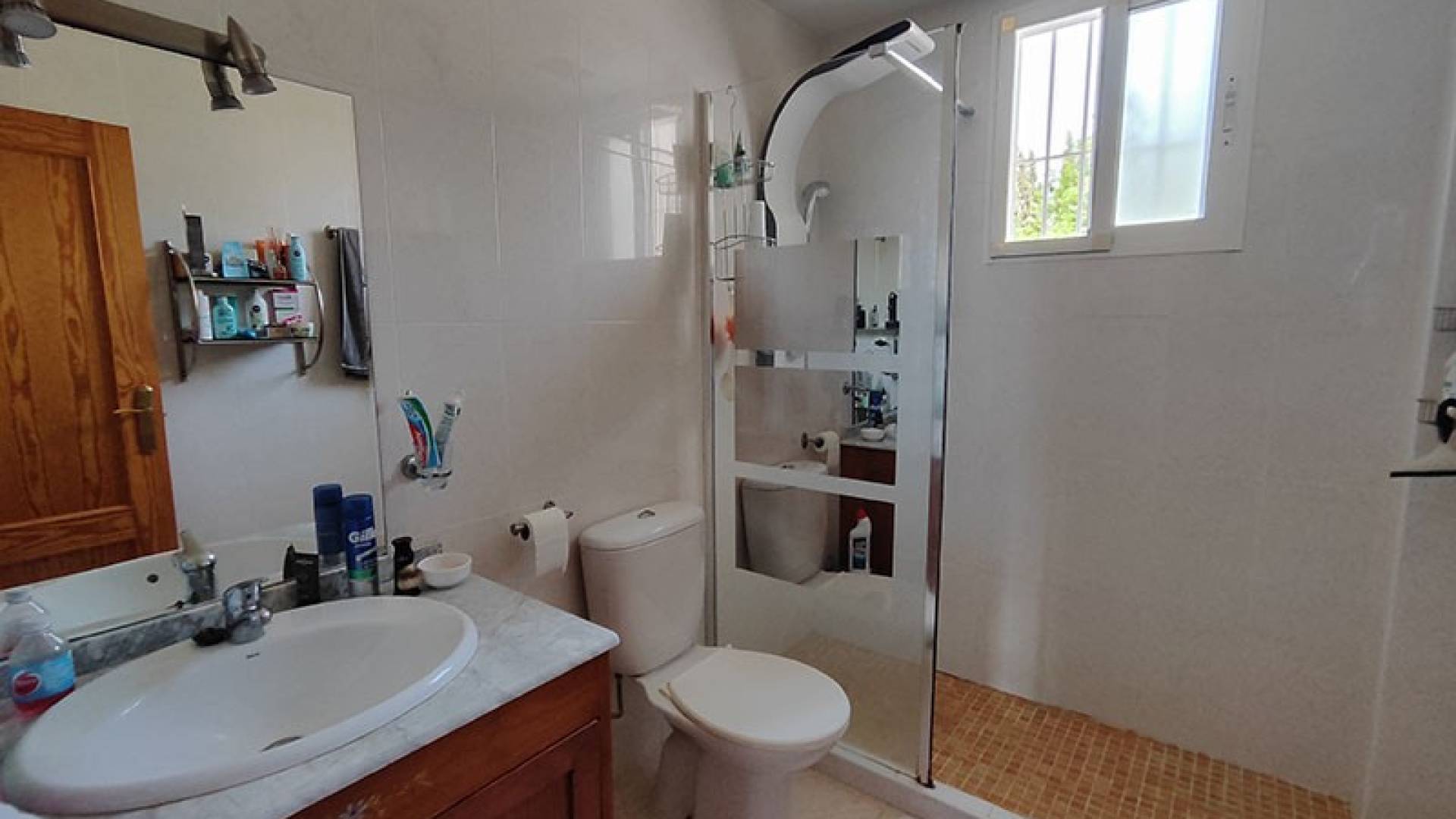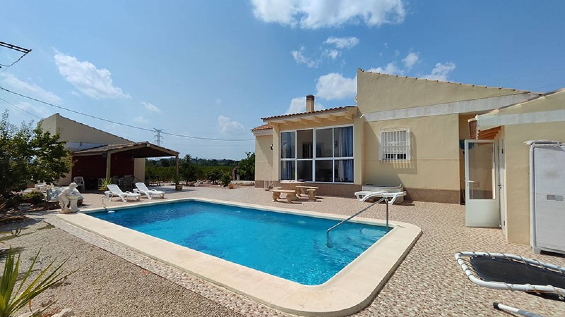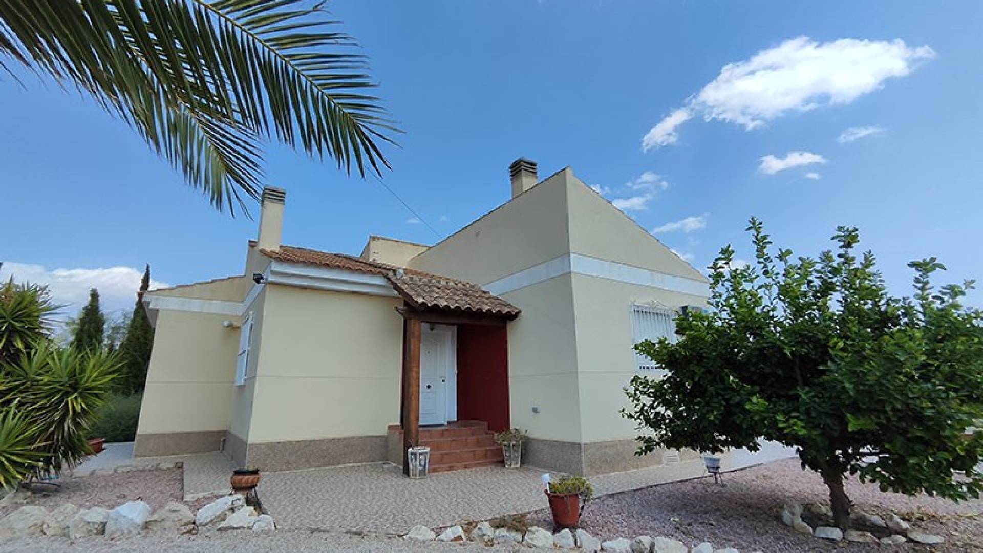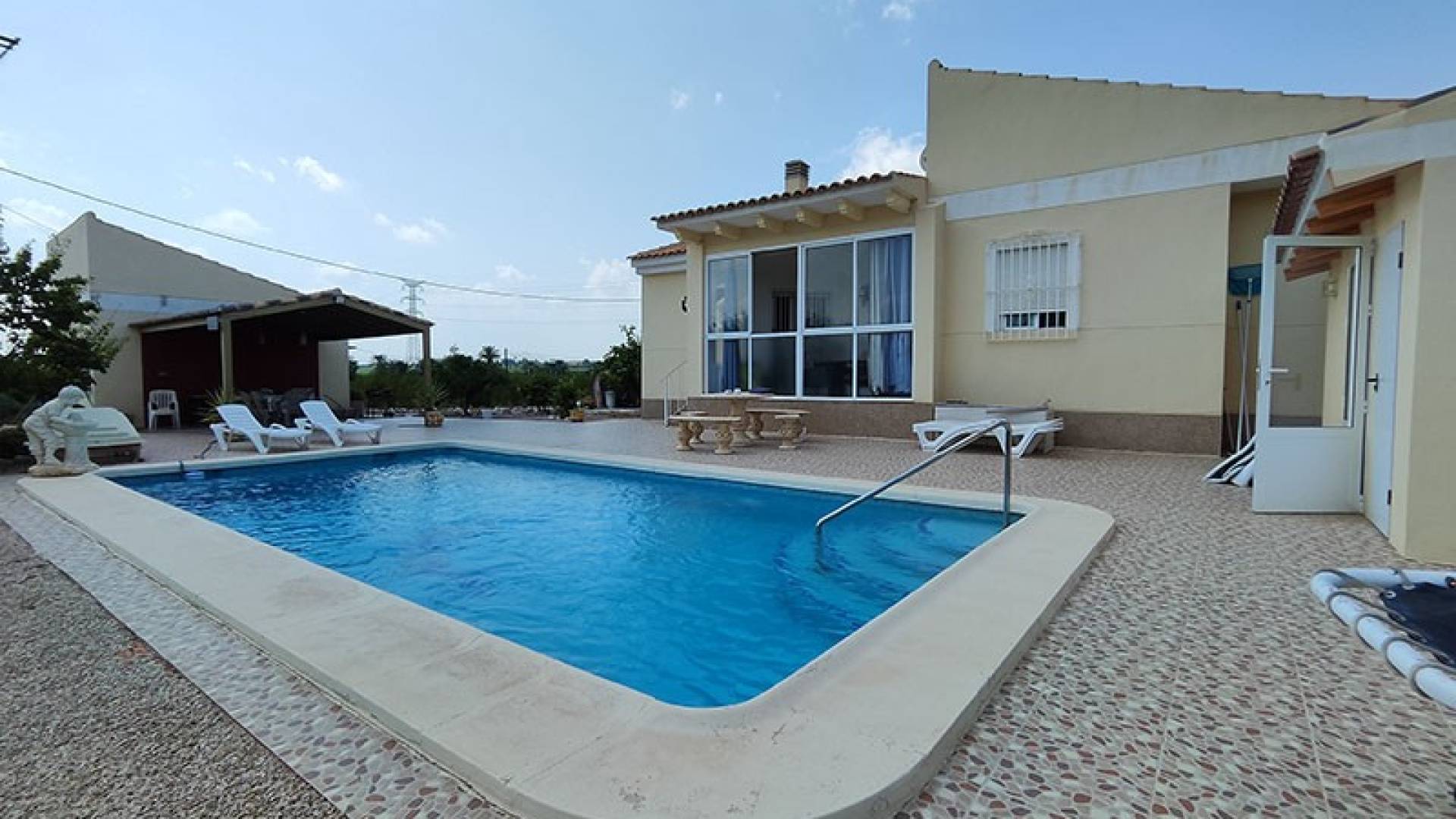 La villa dispose d’une véranda fermée pour les quelques jours frais du petit hiver Murcien, d’un beau salon/Salle a manger avec air conditionné, une cheminée, une cuisine séparée entièrement équipée, 3 chambres a coucher et 3 salles de bains ( la chambre principale à sa salle de douche privée).