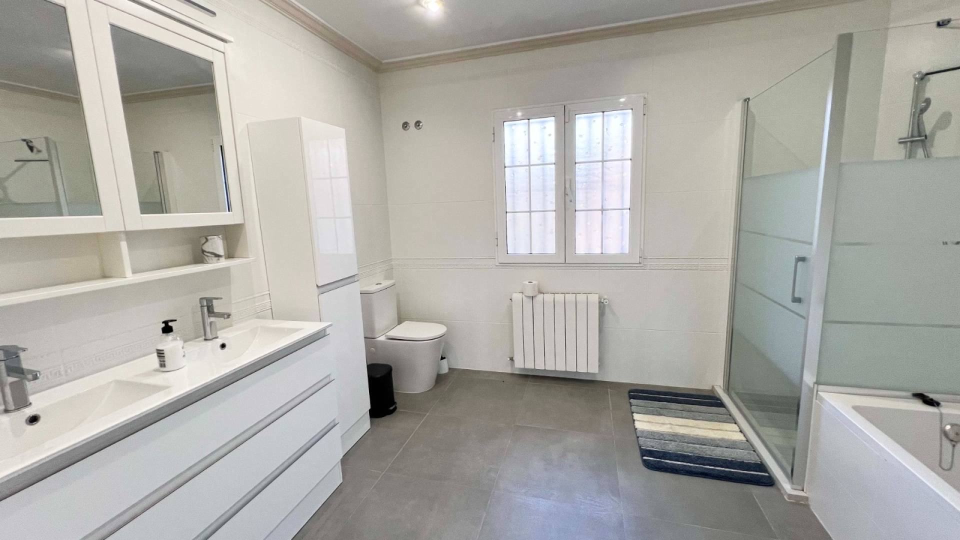 Salle de bain invités avec baignoire, chauffage au sol et porte-serviettes électrique.