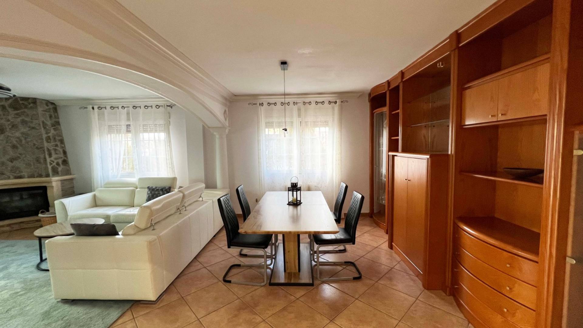 Salle à manger avec climatisation et cheminée à bois ventilée.
