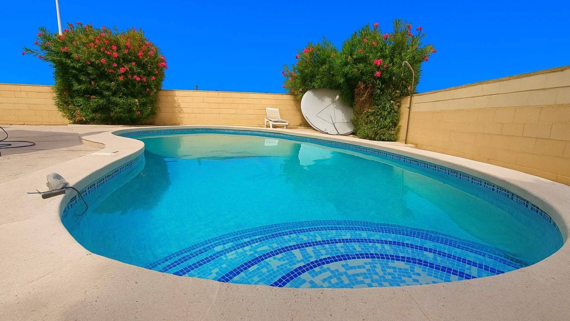 À côté de la maison se trouve une belle piscine en forme de rein d’environ 8×4 mètres et un jardin facile à entretenir. La propriété est raccordée au tout-à-l’égout, à l’électricité et à l’eau potable. Elle dispose également d’un carport, d’un espace couvert verrouillable et de nombreuses places de stationnement pour les invités.