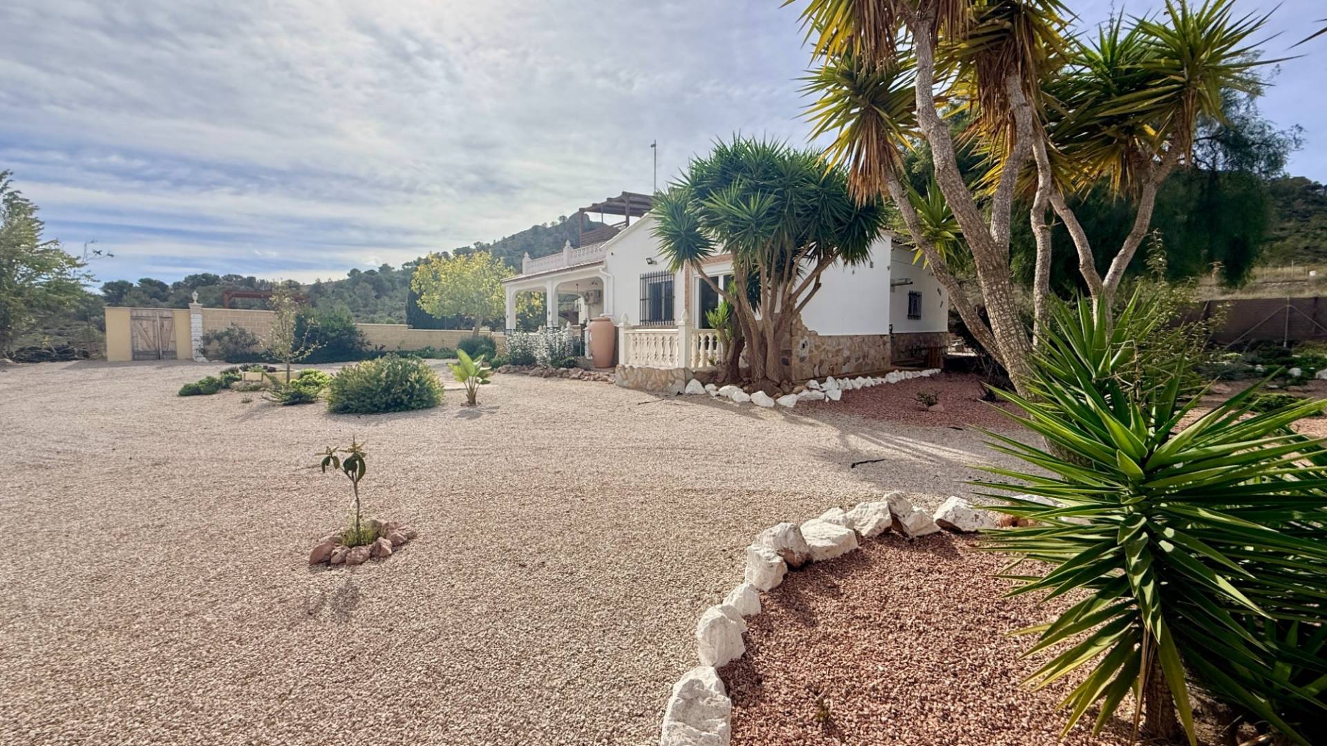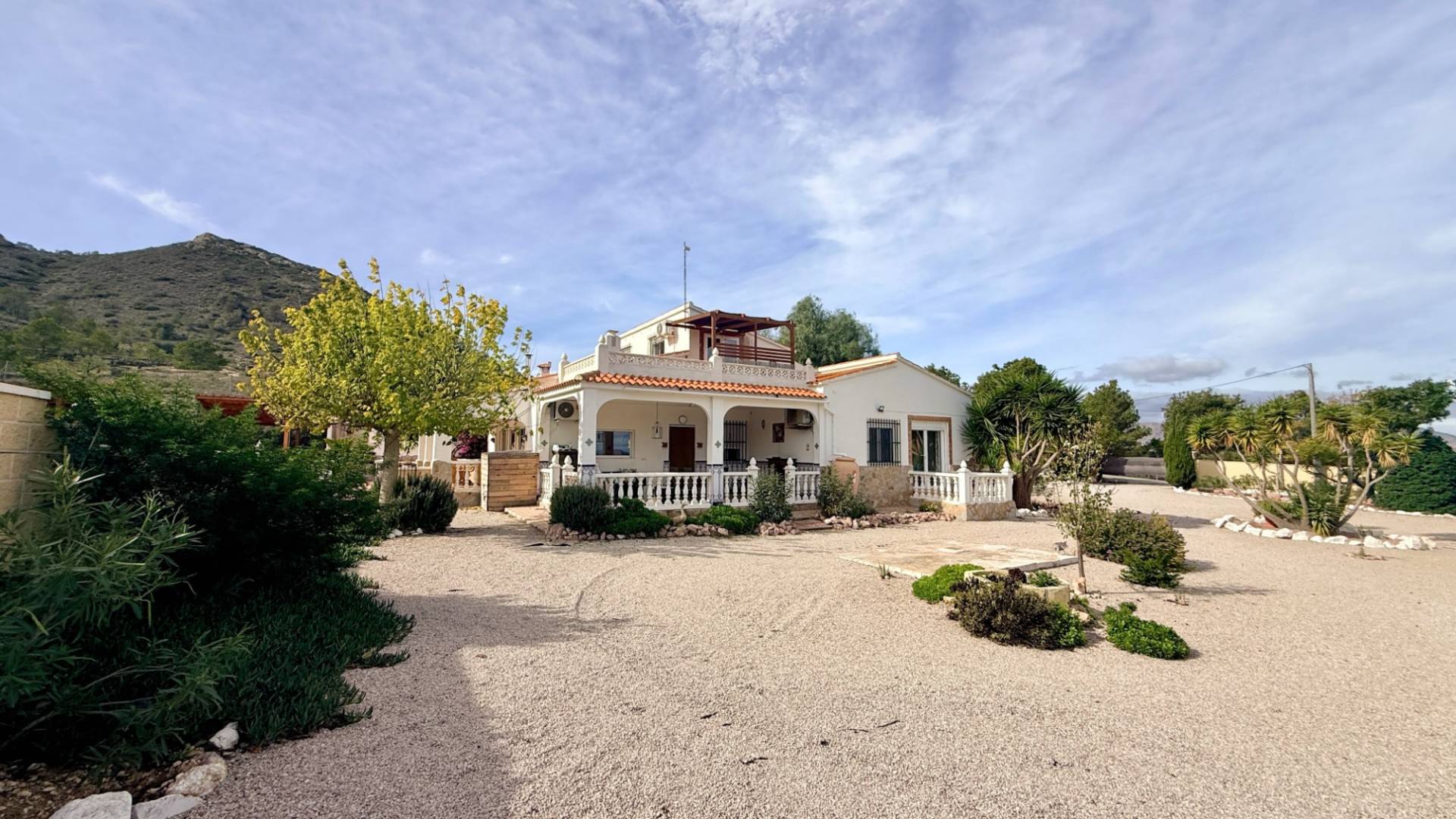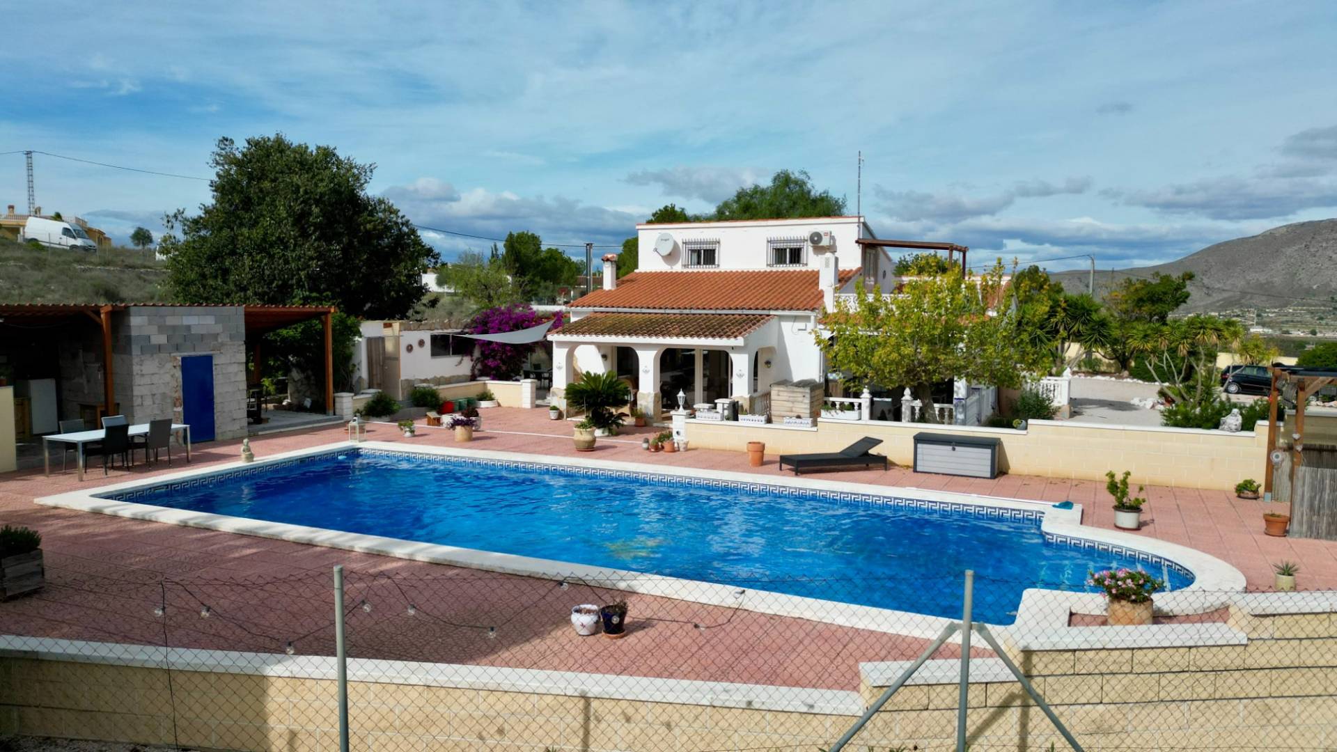 Idéalement située en hauteur avec une vue panoramique sur la magnifique vallée de Hondón, cette charmante finca espagnole allie caractère authentique et confort moderne. Les paysages s’étendent de Murcie à l’ouest jusqu’aux montagnes d’Alicante à l’est. Construite en 1996, la villa combine le style rustique espagnol avec le confort d’aujourd’hui : chauffage central, eau potable et panneaux solaires. Le terrain, entièrement clôturé, fait près de 5 000m² et se divise en deux niveaux — le principal avec la maison et les jardins, et un verger en contrebas. La Maison Principale :Sur deux niveaux, elle dispose d’un porche lumineux idéal pour les repas ou la détente avec vue sur la vallée. Un second porche fait face à la piscine et à la terrasse ensoleillée. À l’intérieur, un grand salon-salle à manger baigné de lumière naturelle grâce aux grandes baies vitrées. Chauffage central, climatisation et internet haut débitPoêle à bois pour les soirées d’hiverCuisine équipée de style galèreCuisine d’été et barbecue à l’extérieur Un couloir mène à trois chambres : la principale avec salle d’eau attenante et accès au jardin, une seconde chambre double avec placards intégrés, et une troisième idéale comme bureau. Salle de bain et débarras complètent cet étage. L’Appartement d’Invités :Accessible par un escalier extérieur, cet appartement indépendant comprend une pièce ouverte avec coin nuit, kitchenette, salle à manger, salle d’eau séparée et balcon privé avec vue imprenable. Idéal pour des invités ou un espace de travail indépendant. Jardins et Piscine :Le point fort de cette propriété est sans conteste sa piscine exceptionnelle de 14m x 6m, soit près de 90m², entourée d’une grande terrasse ensoleillée. À proximité, une cuisine d’été, un coin repas ombragé, douche, toilettes et espaces de rangement. Les jardins paysagers offrent une belle végétation méditerranéenne et un espace de stationnement couvert. Un havre de paix ensoleillé plus de 320 jours par an. Raccordée à l’eau et à l’électricité, la maison dispose de 14 panneaux solaires (4,6kW) et d’un onduleur de 5,6kW. Chauffage central au fioul. À seulement 5 minutes de Hondón de las Nieves avec ses restaurants, commerces et marchés, et à 35 minutes de la côte et de l’aéroport.