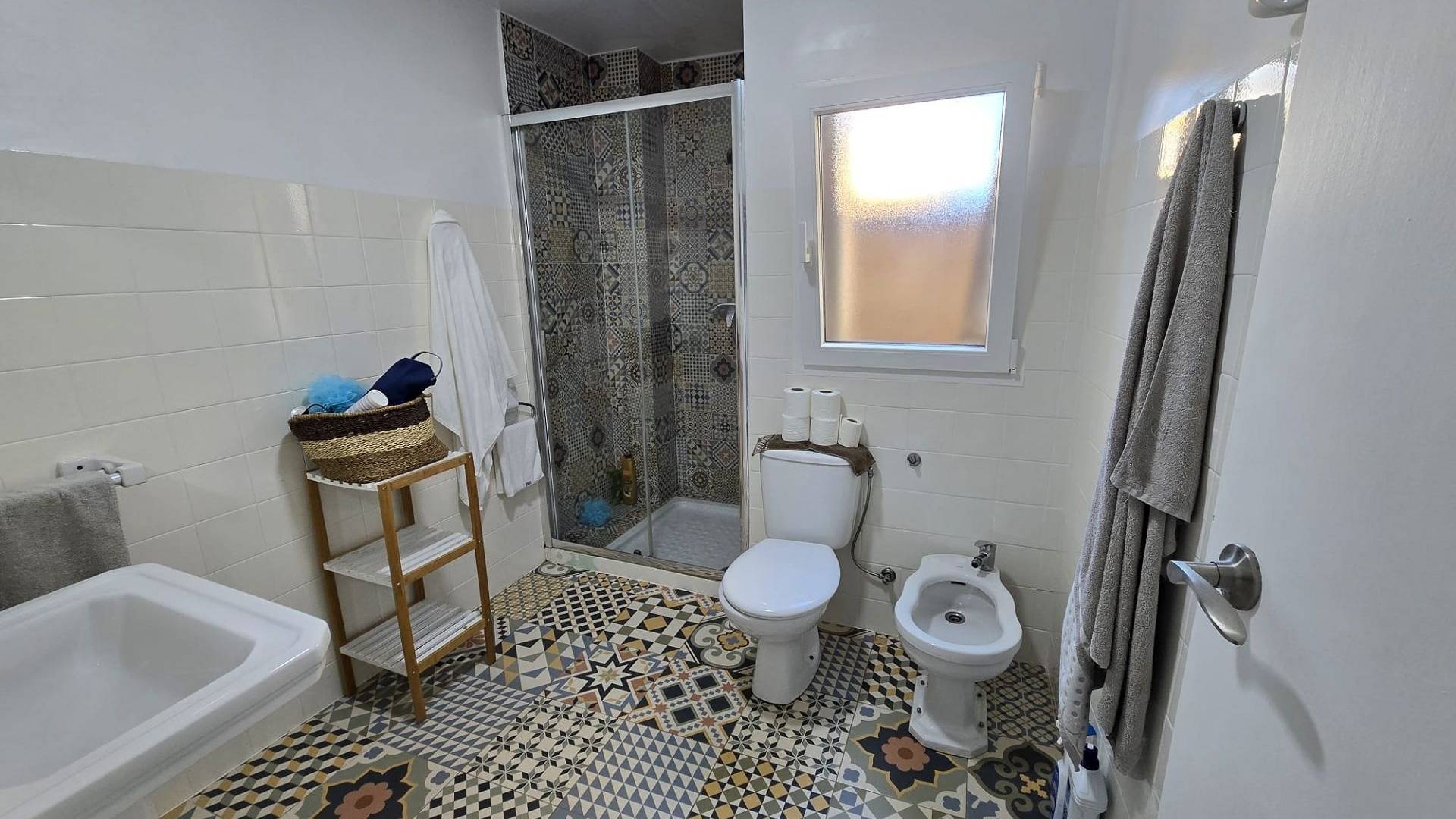 L'appartement comprend trois chambres et une salle de bains moderne avec une grande douche à l'italienne. Le séjour offre un espace chaleureux et accueillant, idéal pour se détendre, recevoir des invités ou passer des moments en famille. La cuisine a été modernisée avec des équipements et des rangements modernes, créant un espace fonctionnel et esthétique pour cuisiner, et dispose d'une buanderie séparée. La salle de bains a également été rénovée avec des finitions de qualité, offrant un style épuré et contemporain.