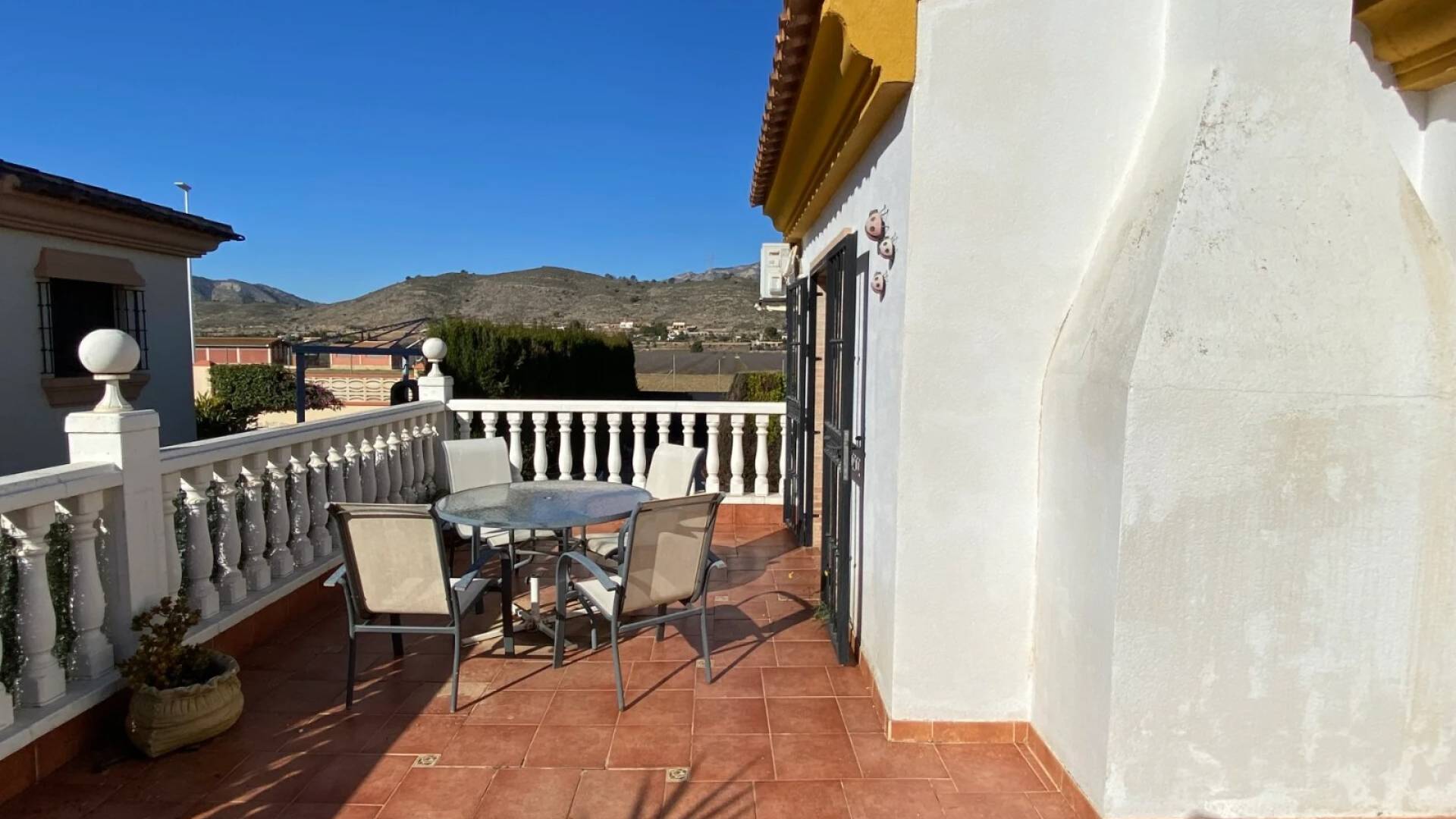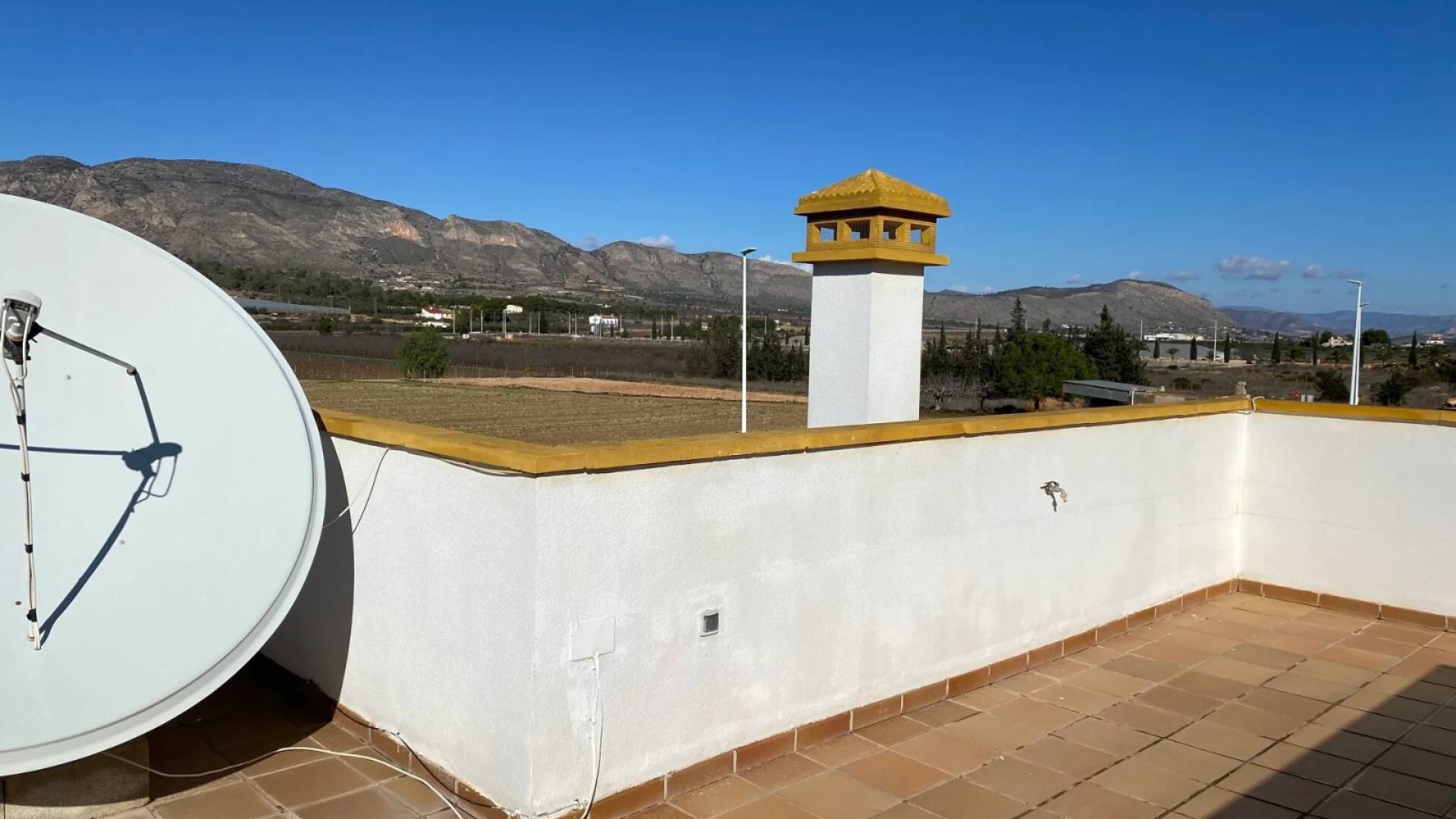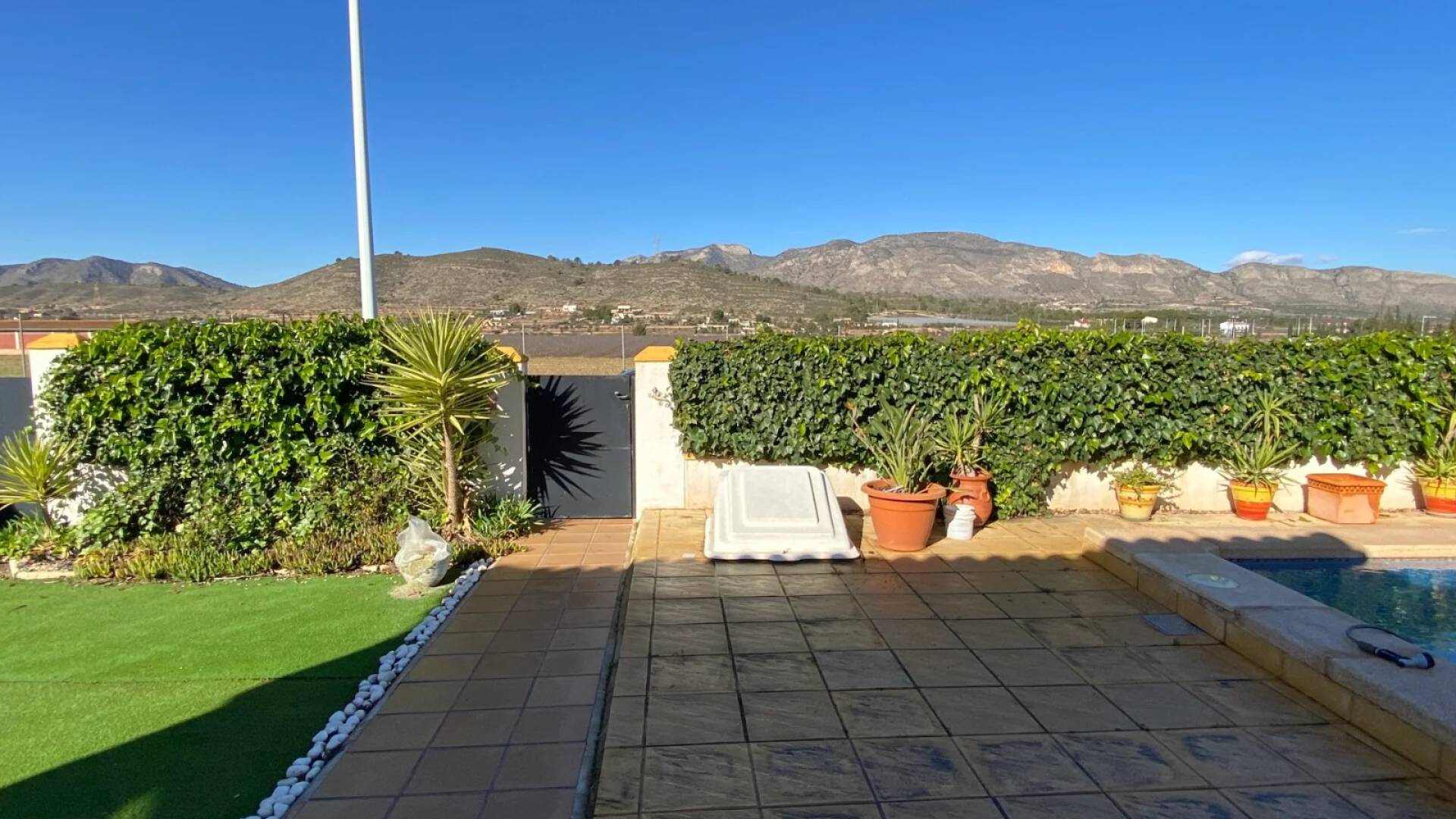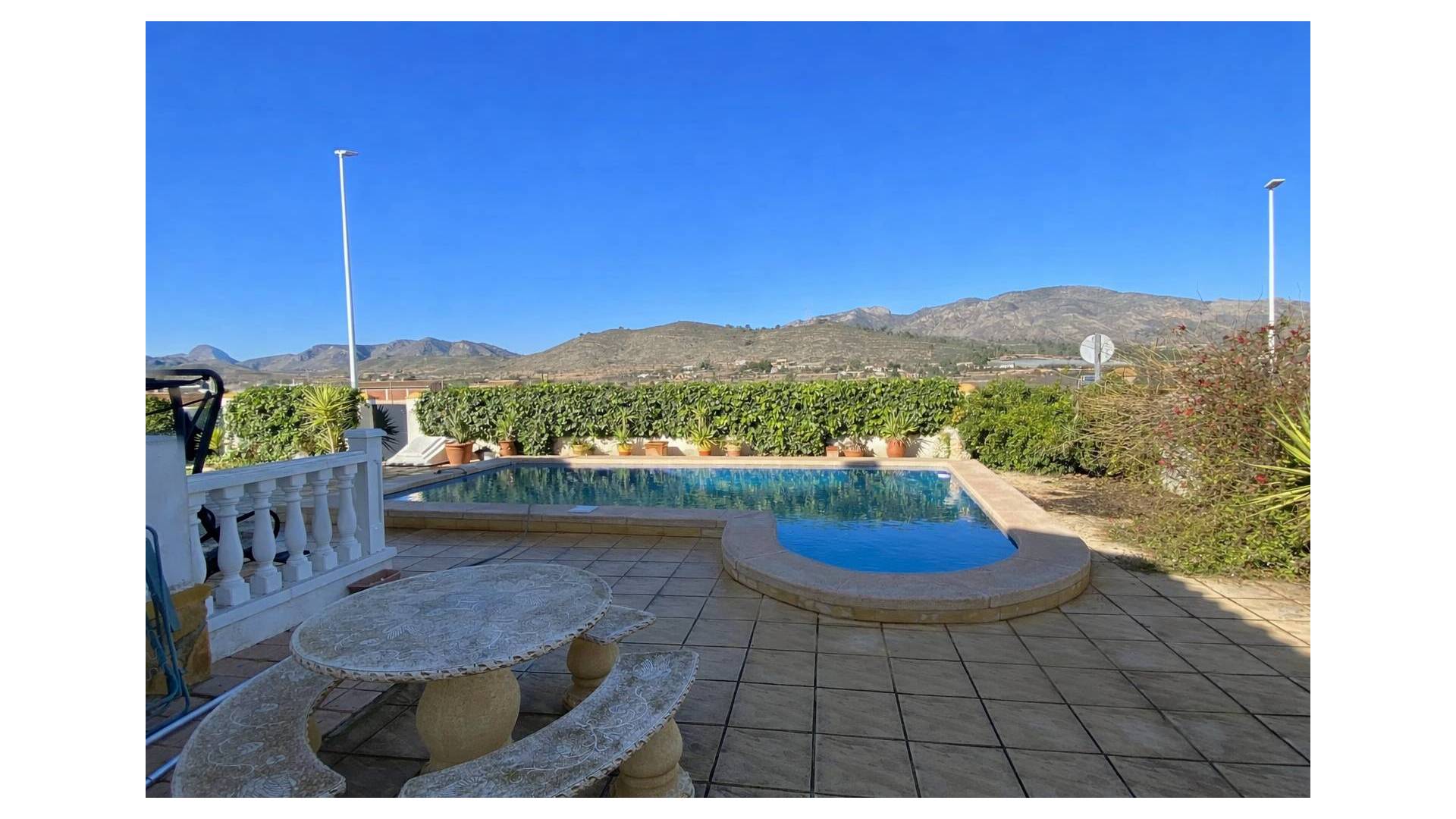 La villa est accessible par une porte piétonne ou un double portail pour véhicules, offrant un stationnement hors route. La piscine privée se situe à l’avant de la propriété, entourée d’un espace pour se détendre et de jardins bien entretenus avec des plantes établies. À l’arrière, un petit local buanderie et un grand cabanon en bois avec électricité offrent un espace pratique. Une terrasse surélevée sur le côté est parfaite pour profiter de l’extérieur, accessible depuis le salon ou l’arrière de la villa. Le solarium sur le toit complète la maison avec des vues panoramiques spectaculaires sur la vallée de Hondón.