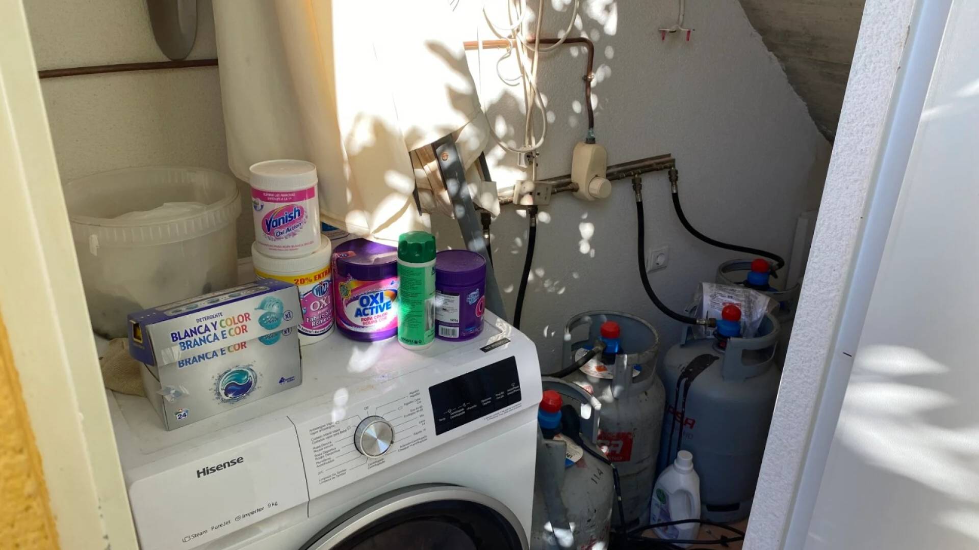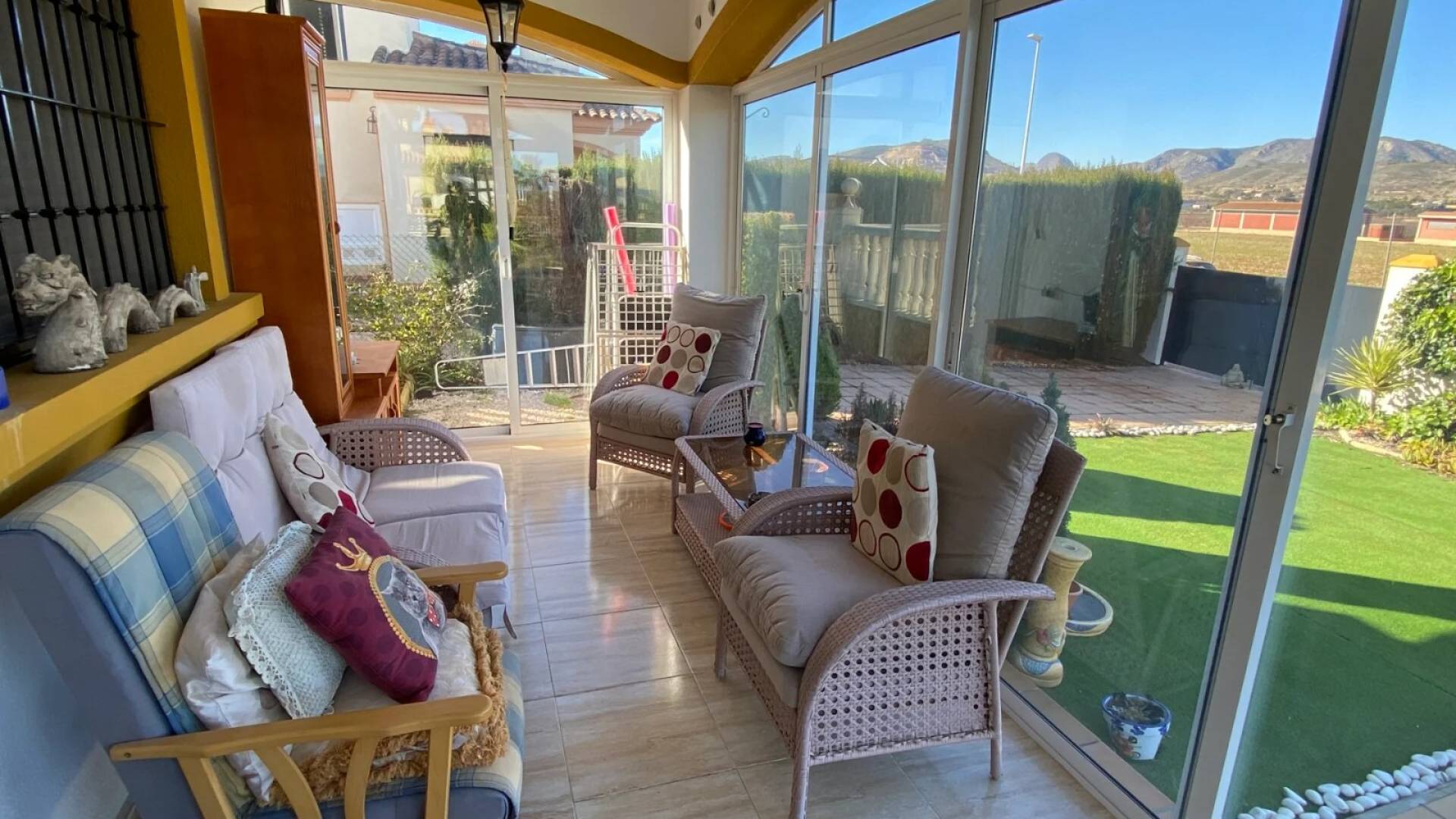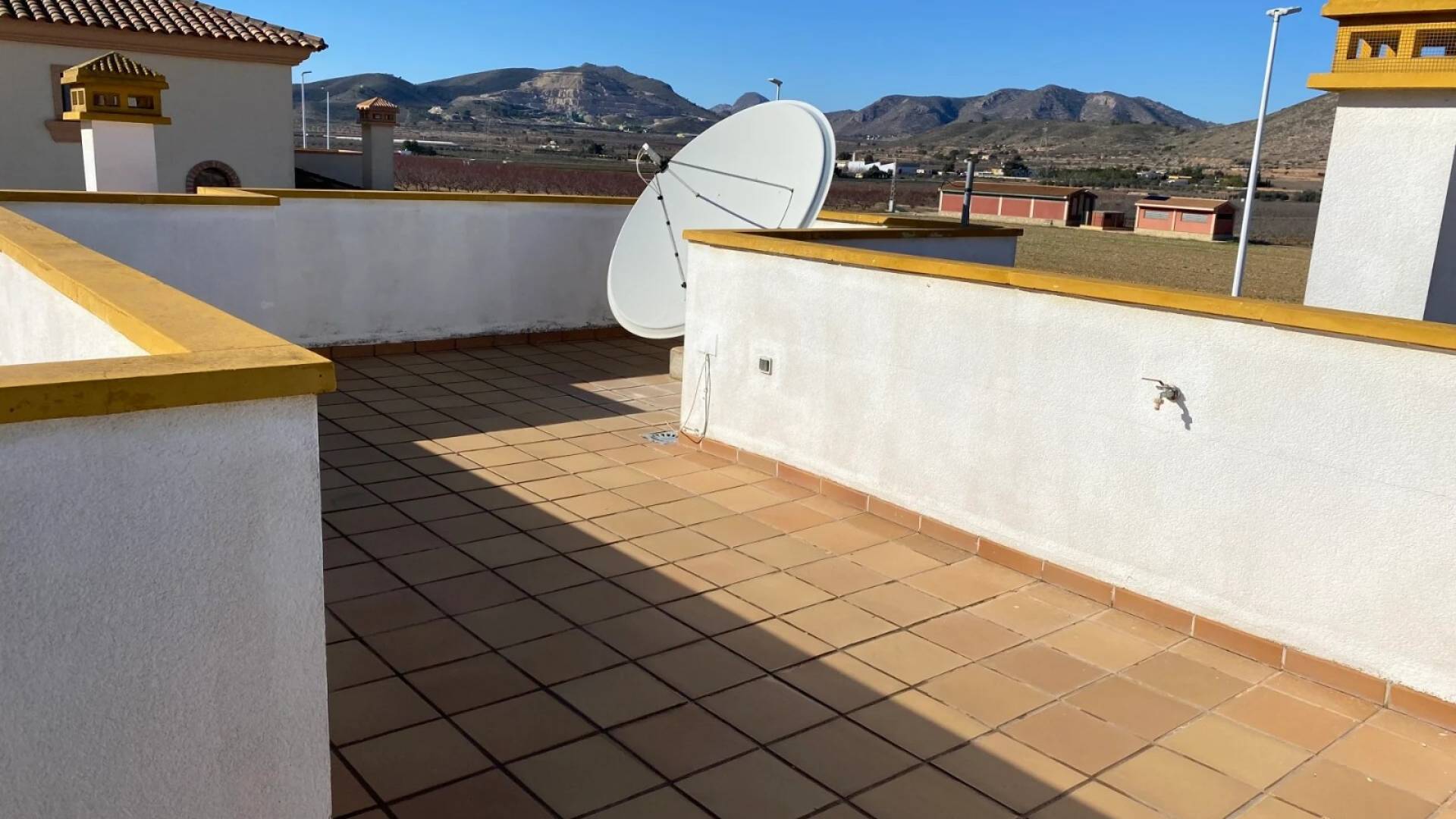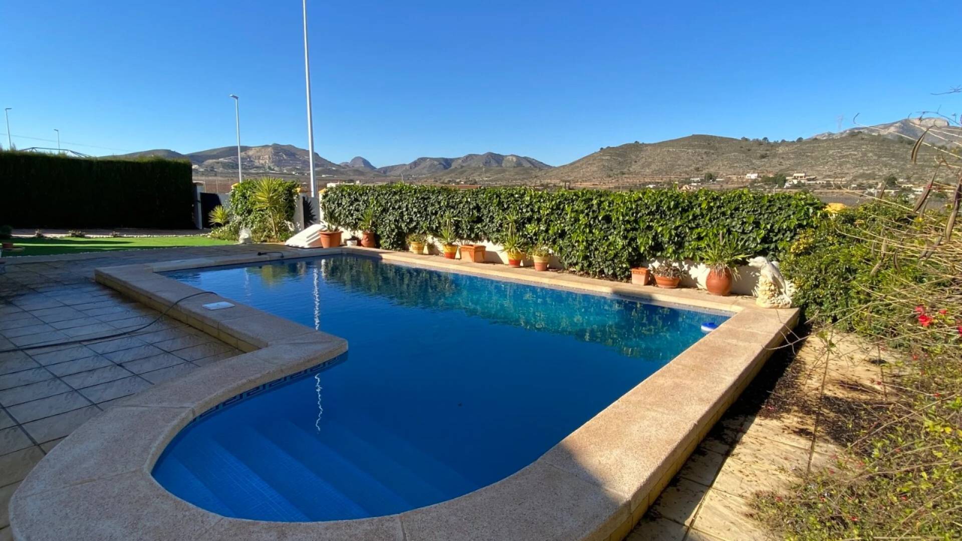 La villa est accessible par une porte piétonne ou un double portail pour véhicules, offrant un stationnement hors route. La piscine privée se situe à l’avant de la propriété, entourée d’un espace pour se détendre et de jardins bien entretenus avec des plantes établies. À l’arrière, un petit local buanderie et un grand cabanon en bois avec électricité offrent un espace pratique. Une terrasse surélevée sur le côté est parfaite pour profiter de l’extérieur, accessible depuis le salon ou l’arrière de la villa. Le solarium sur le toit complète la maison avec des vues panoramiques spectaculaires sur la vallée de Hondón.