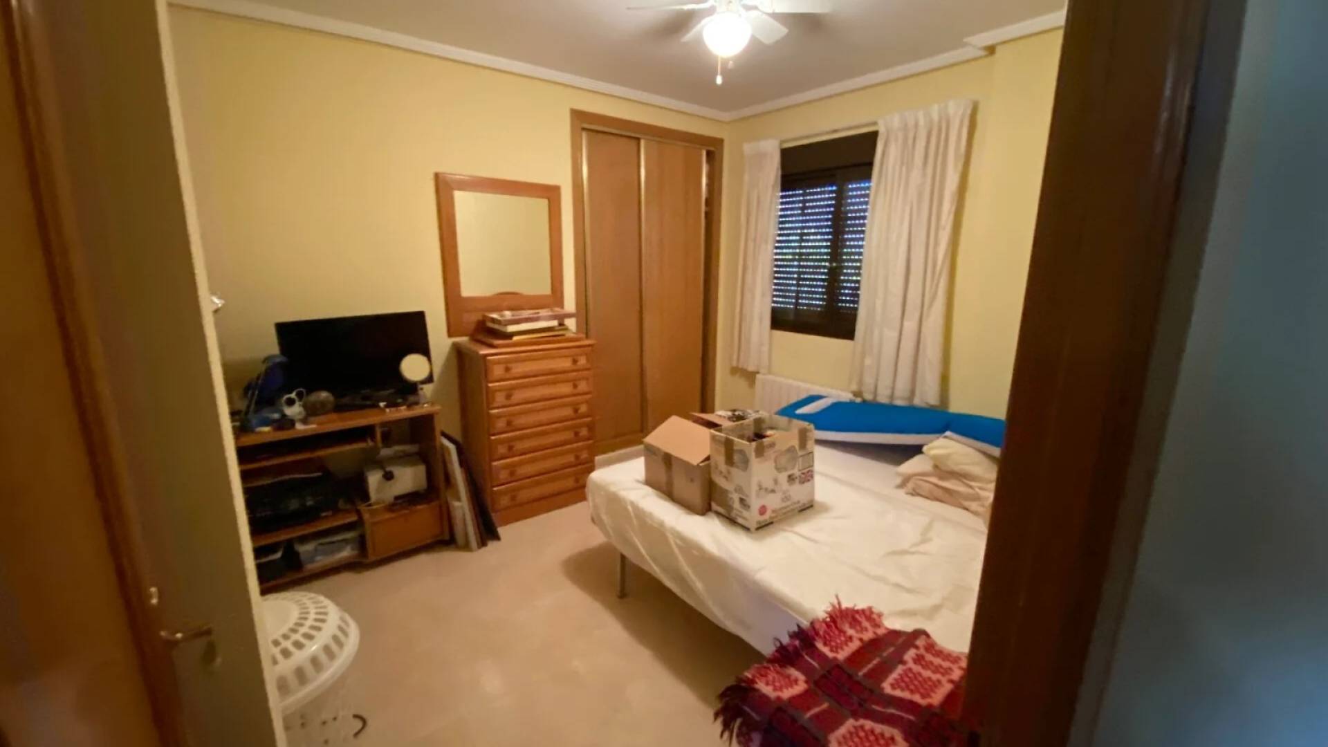 La chambre principale comprend des placards intégrés, la climatisation, un ventilateur au plafond, le chauffage central et une salle de bains privative avec baignoire, douche, WC et lavabo. Deux autres chambres doubles disposent de placards intégrés, ventilateurs et chauffage central, desservies par une salle de bains familiale avec douche à l’italienne double.
