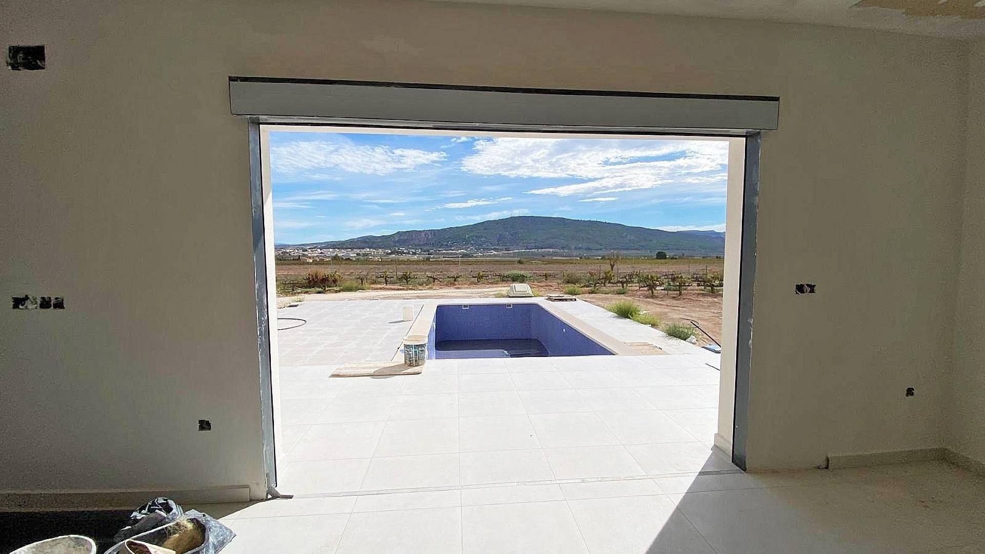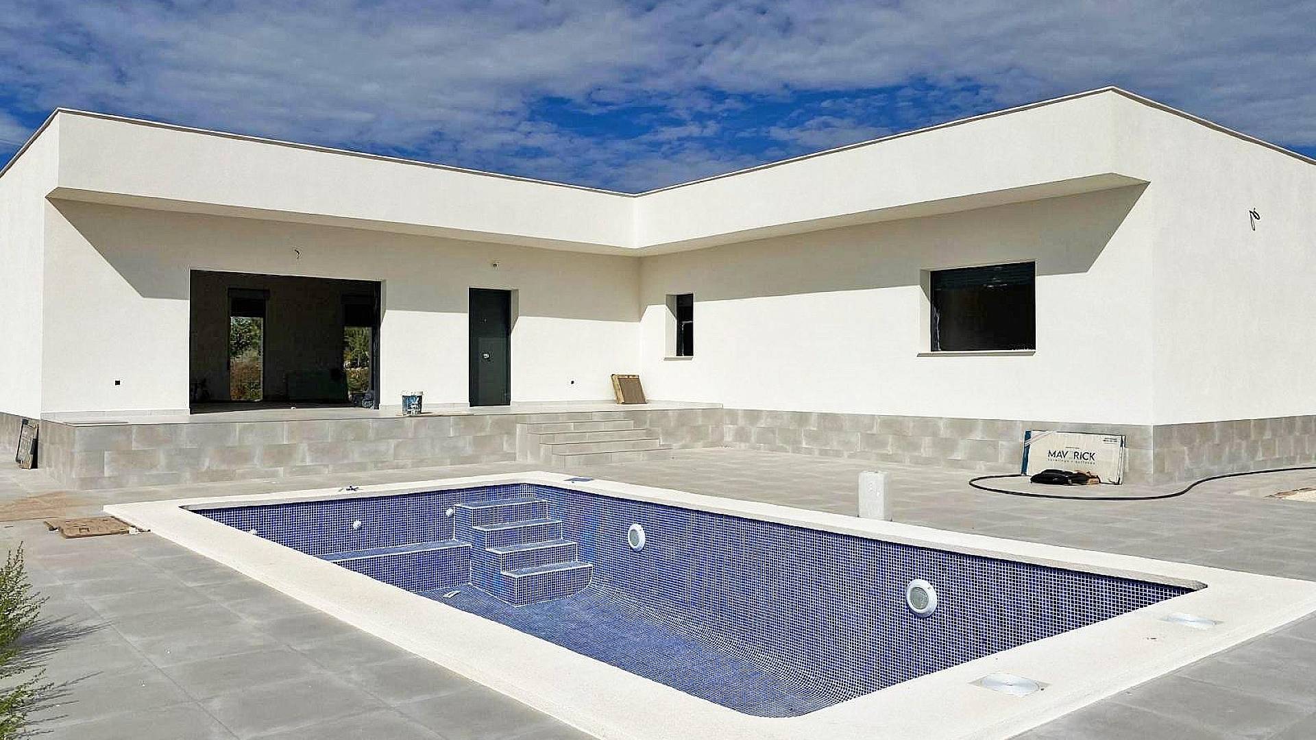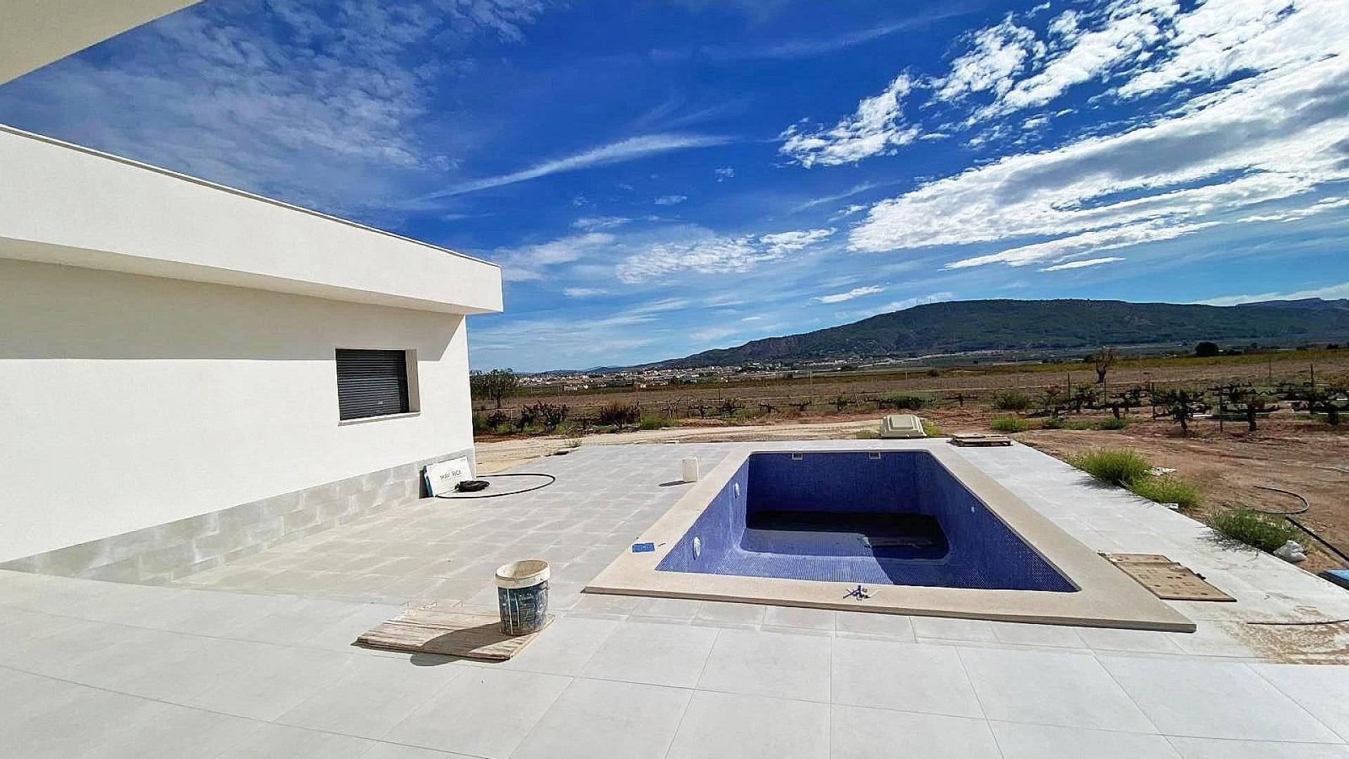 Cette nouvelle villa de style moderne est en cours d'achèvement. La villa est située à Pinoso, à 5 minutes à pied de toutes les commodités.La villa fait 160m² et comprend un grand espace de vie avec salon/salle à manger et cuisine équipée (pour 3,000), une buanderie, 3 chambres, dont 2 avec placards et 1 chambre avec une salle de bain attenante. La villa dispose d'une pré-installation pour la climatisation dans toute la maison (chaud/froid), de l'eau courante et de l'électricité. Le terrain est d'une superficie de 10 000 m², dont 3 000 m² sont clôturés. Il y a une piscine de 8x4m avec douche extérieure. L'accès à la propriété se fait par un portail électrique. Il y a un choix de finitions et d'extras (cuisine, salle de bain, etc.). Si vous cherchez une nouvelle construction mais que vous ne voulez pas attendre des mois, cette villa est faite pour vous.