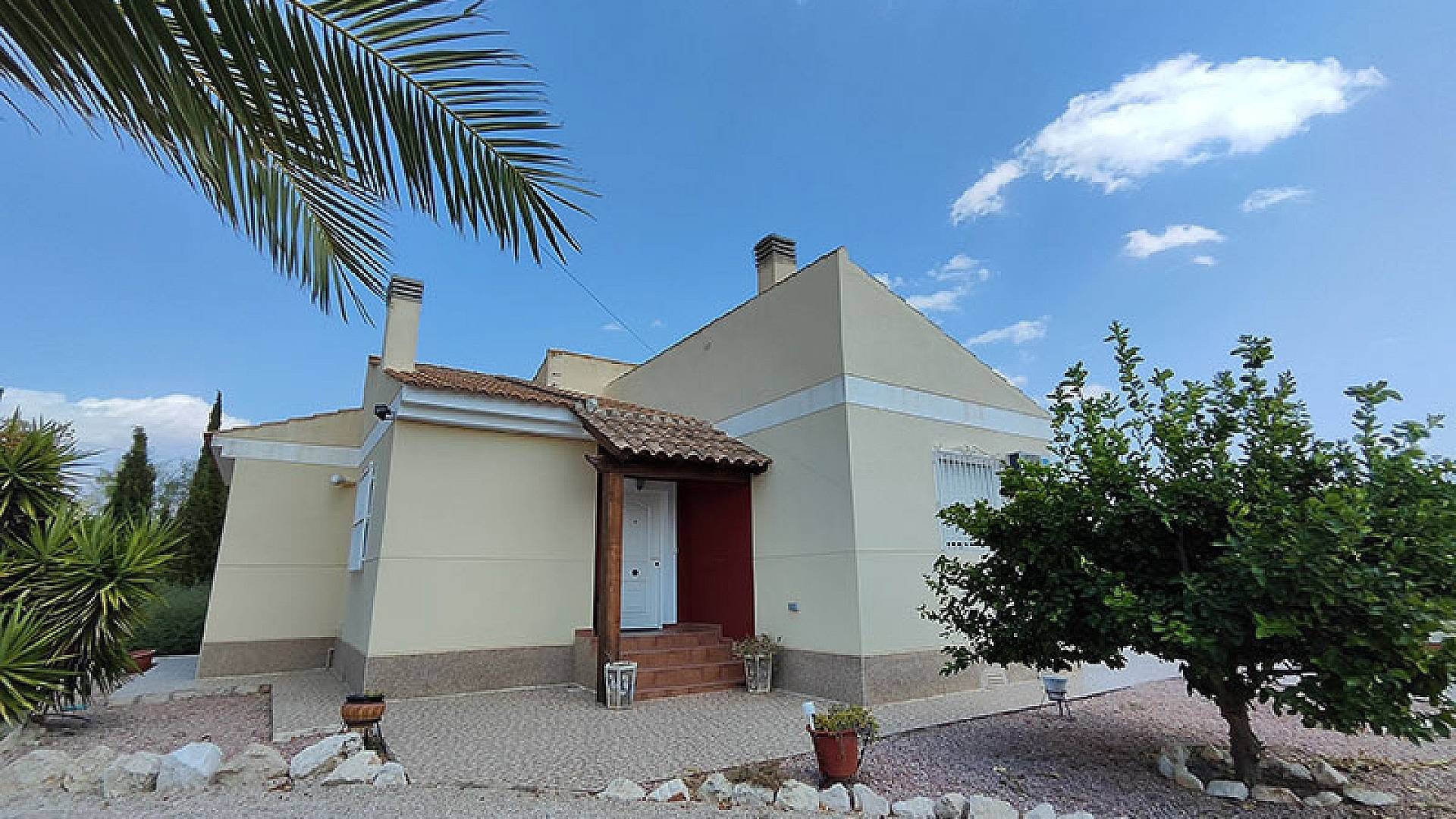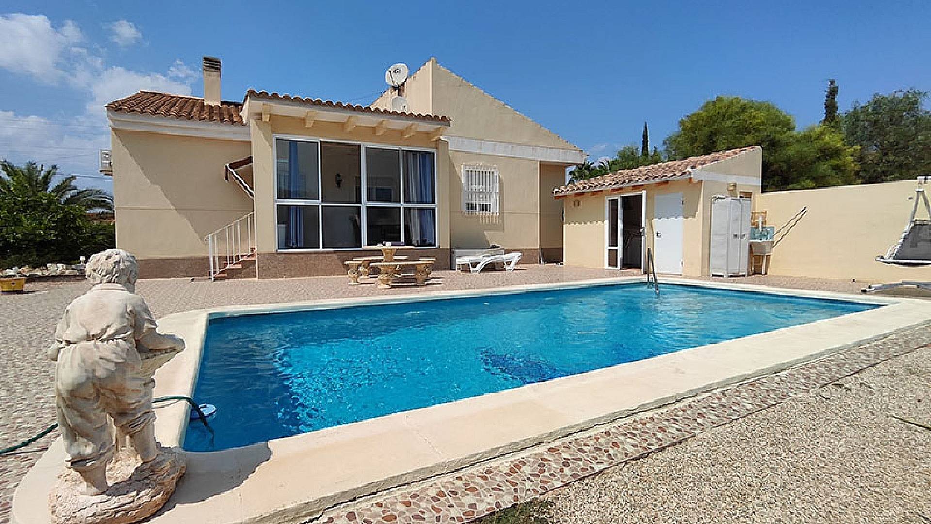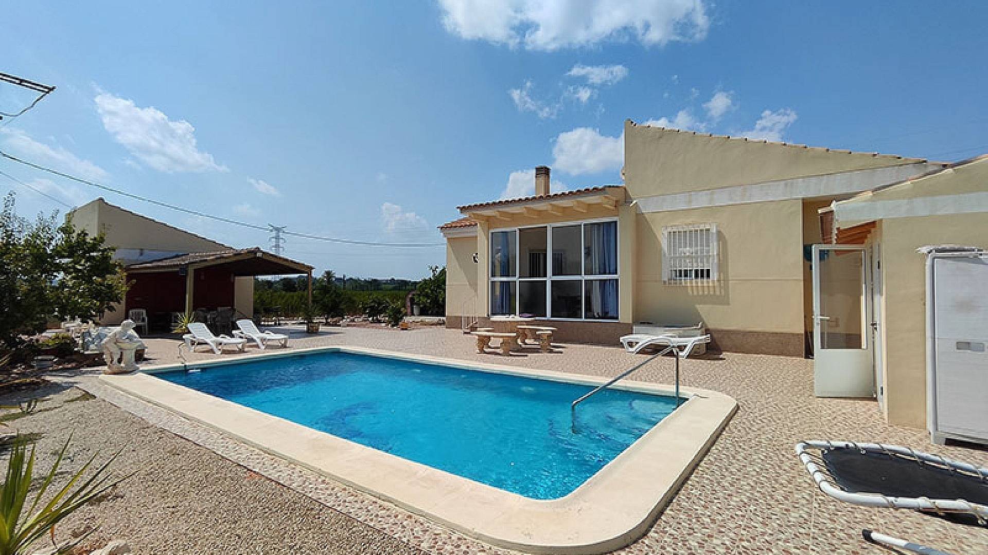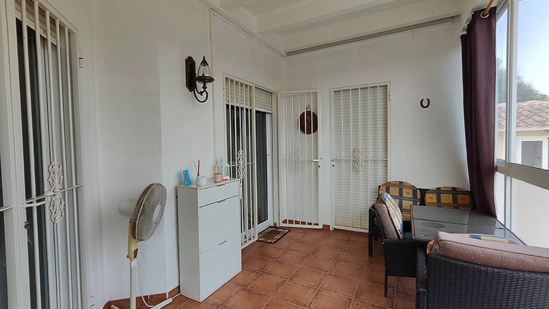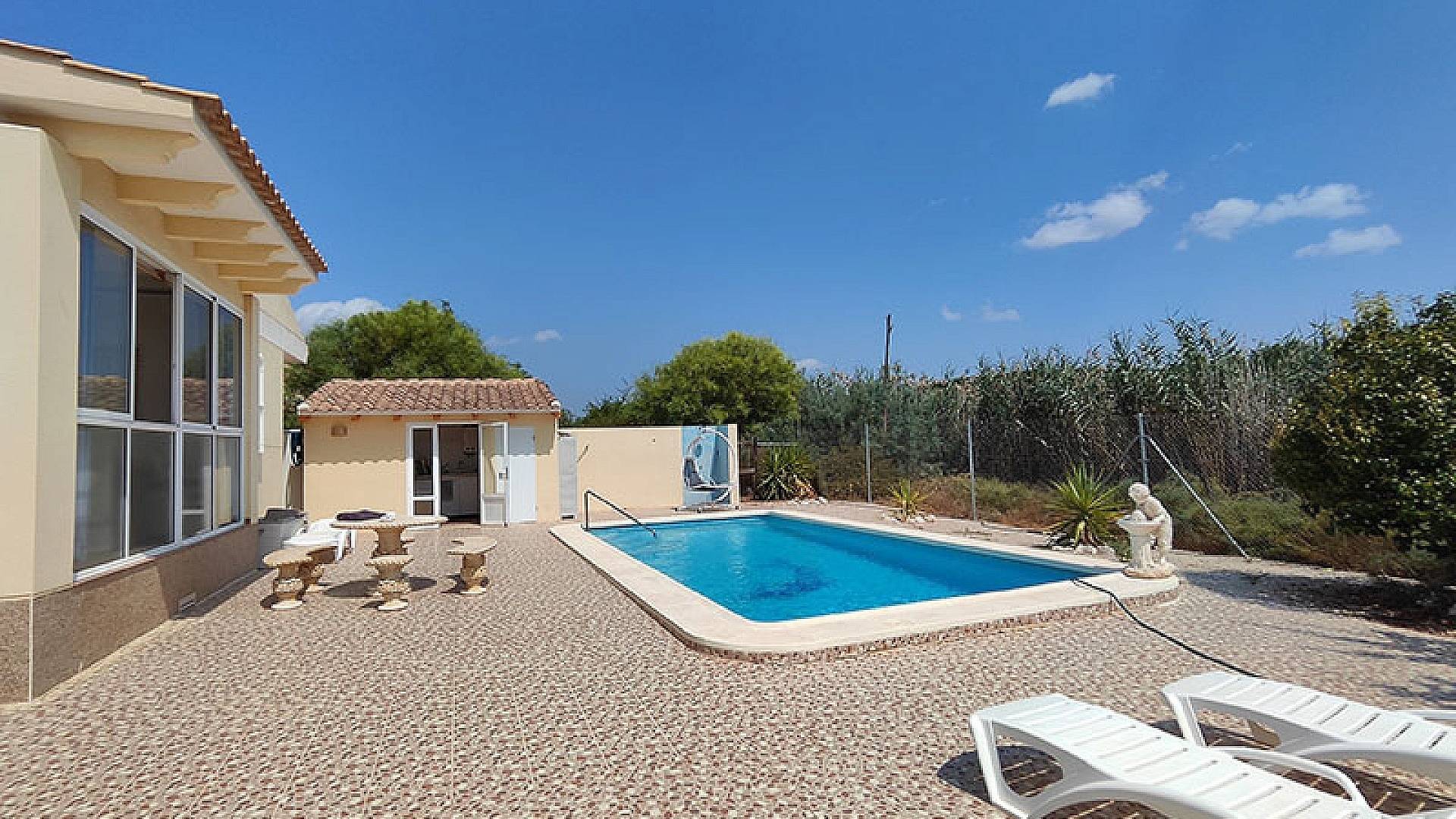 La villa dispose d'une véranda fermée pour les quelques jours frais du court hiver mercien, d'un beau salon/salle à manger climatisé, d'une cheminée, d'une cuisine séparée entièrement équipée, de 3 chambres et de 3 salles de bains (la chambre principale dispose de sa propre salle d'eau privative).