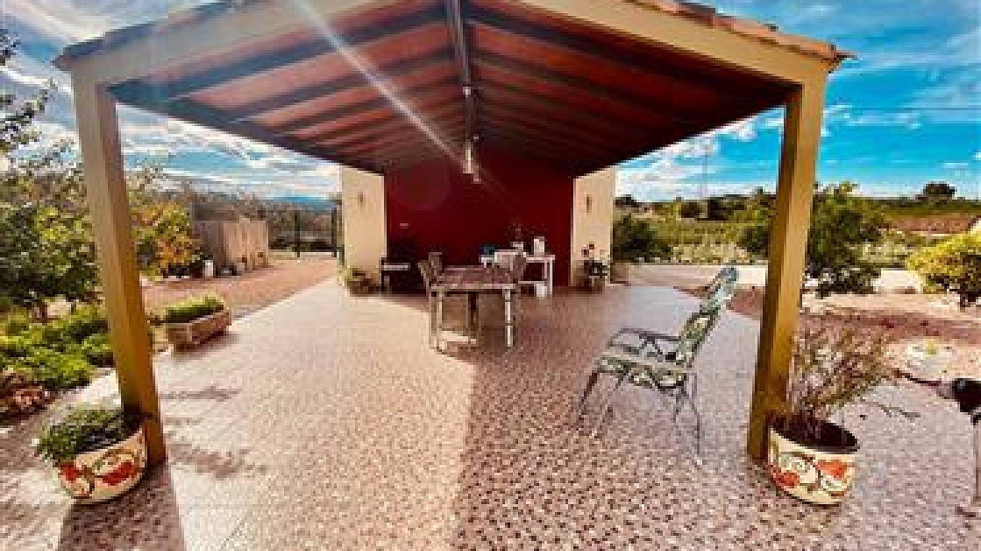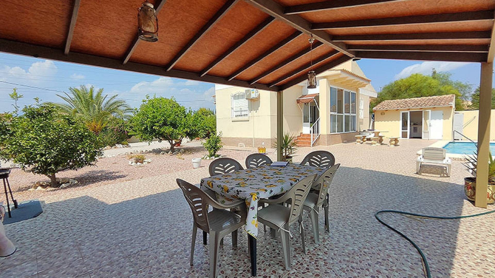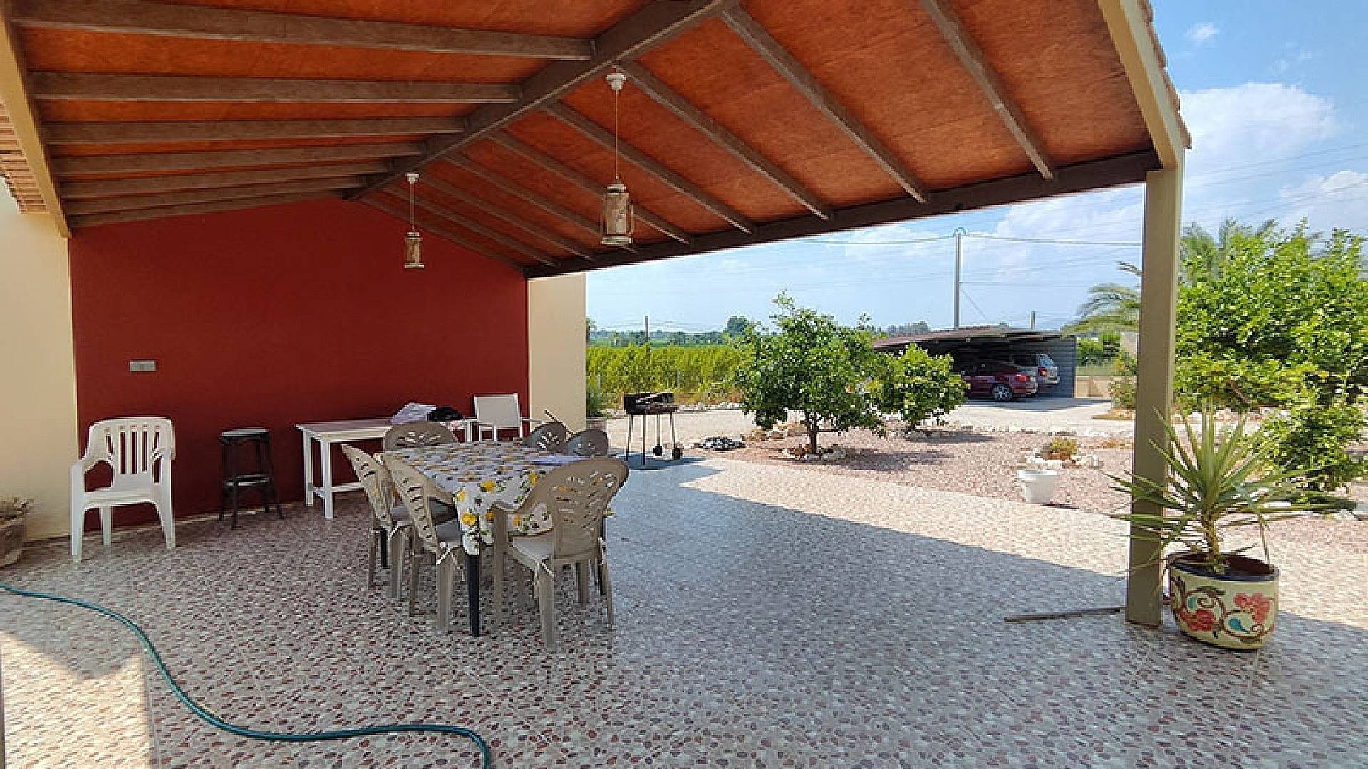 À l'extérieur, vous trouverez un abri pour 3 voitures (possibilité d'en accueillir 4 si fermé), un grand garage spacieux de 34 m², une piscine au chlore de 8 x 4 m (entièrement rénovée, ainsi que l'ensemble du système d'eau de la maison), une belle cuisine extérieure équipée, des toilettes extérieures séparées et une belle terrasse couverte en bois de 8 x 4 m, idéale pour les grands rassemblements entre amis ou en famille.