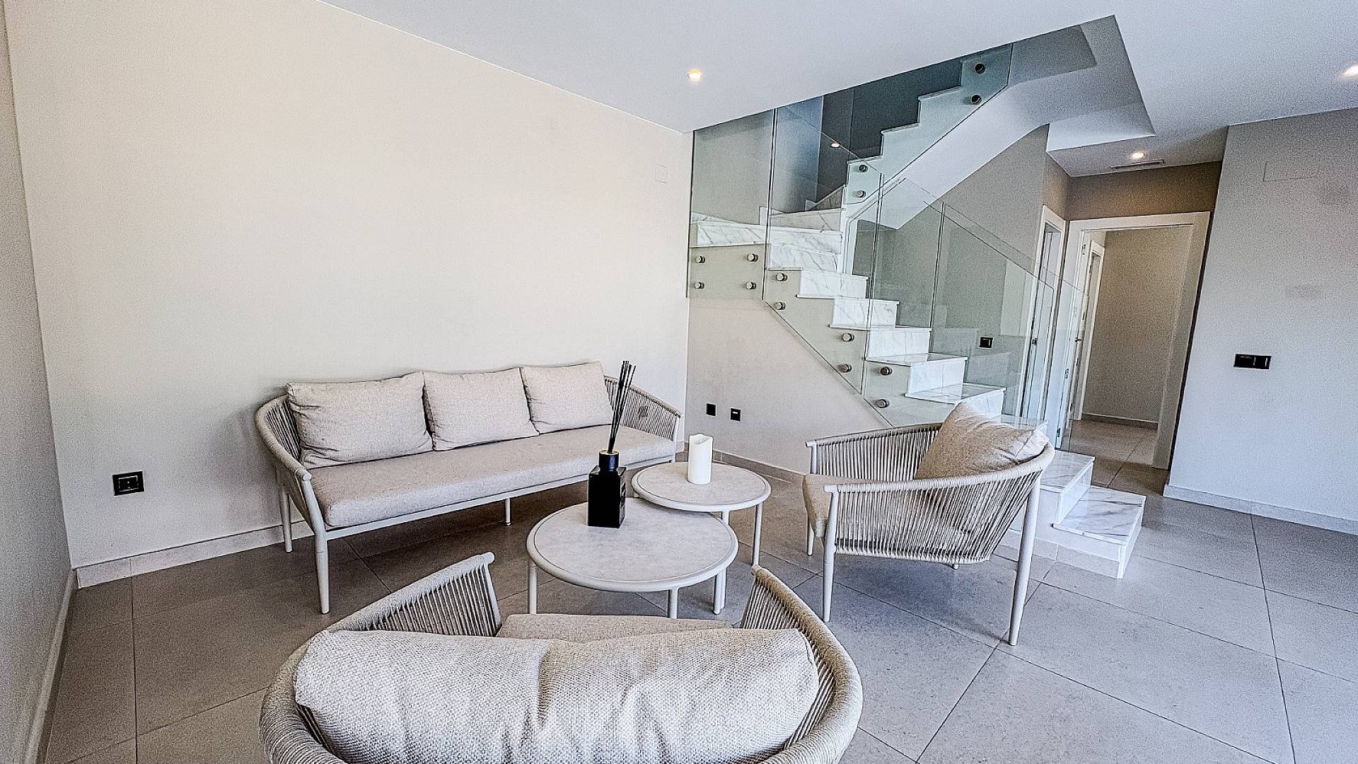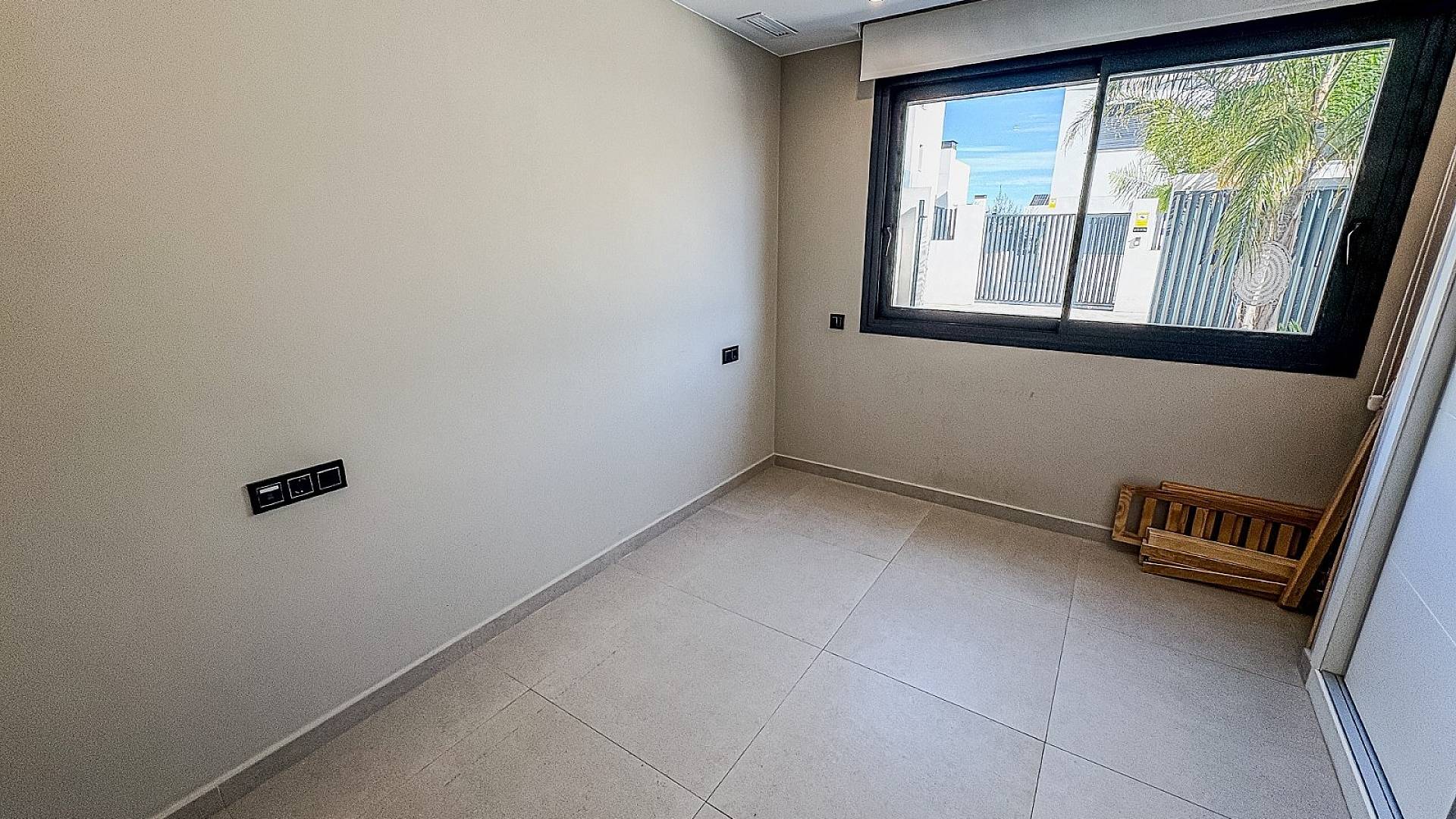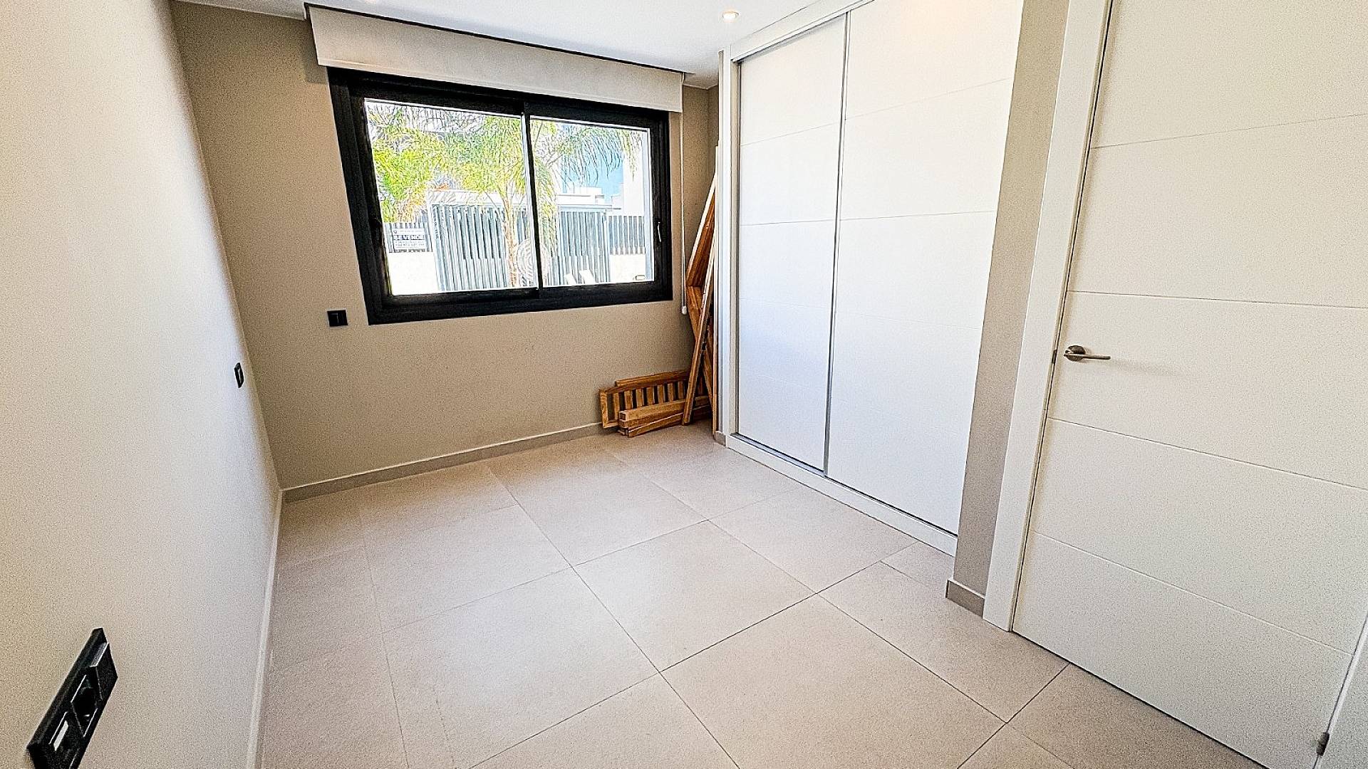 Rez-de-chaussée : Une chambre confortable, une salle de bains luxueuse et des toilettes séparées pour les invités. Salon et salle à manger lumineux et ouverts donnant sur le jardin et la piscine. Il y a également une buanderie séparée avec espace de rangement supplémentaire.