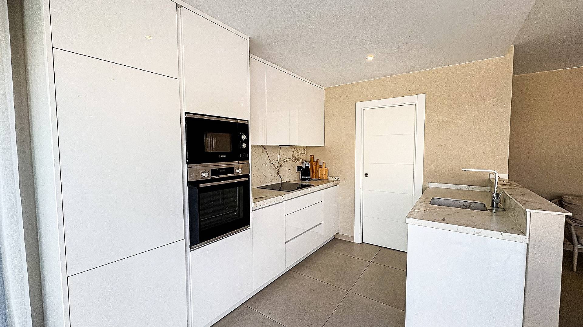 Cuisine de luxe équipée d’appareils Bosch, lave-vaisselle, réfrigérateur-congélateur et plans de travail haut de gamme