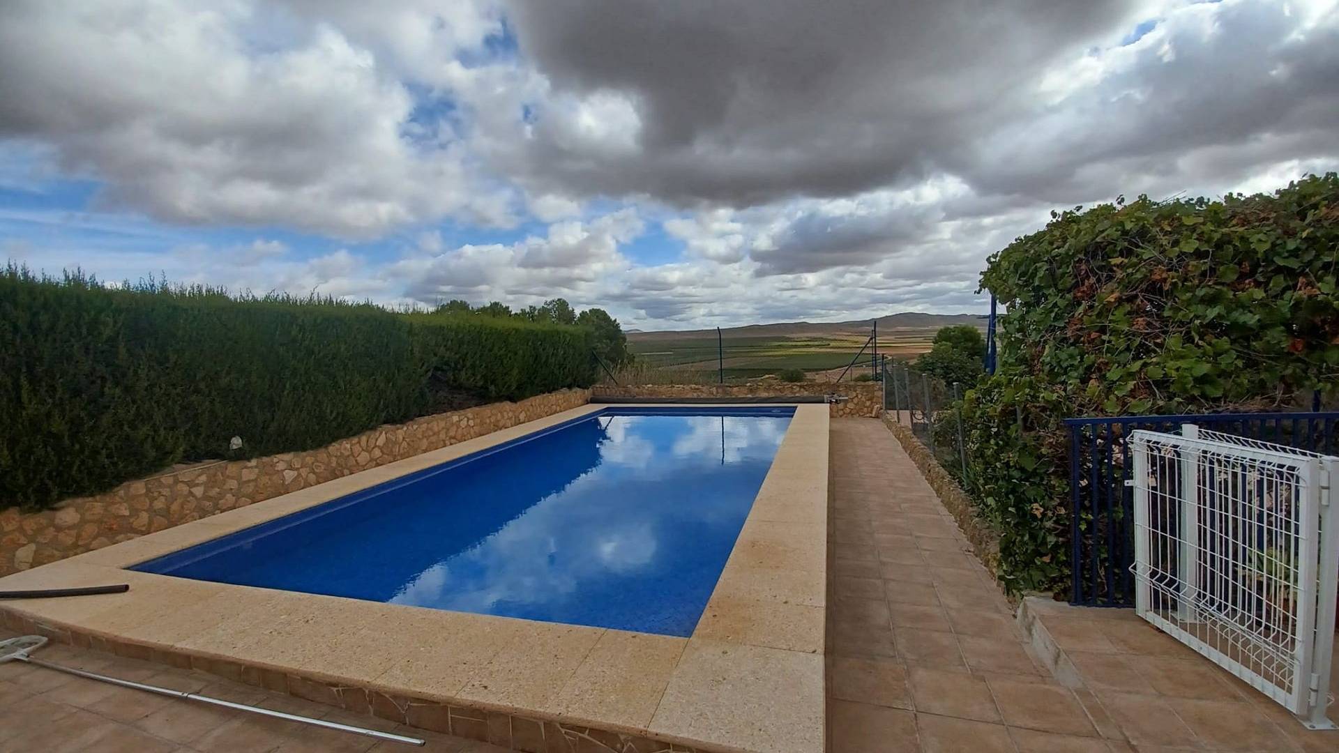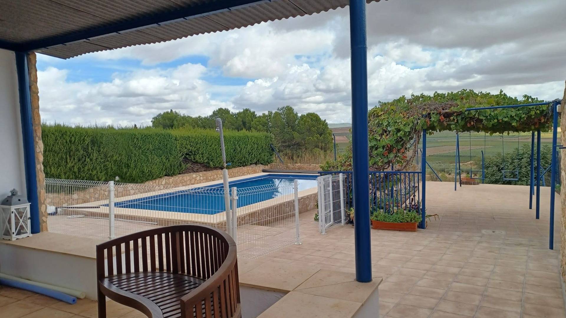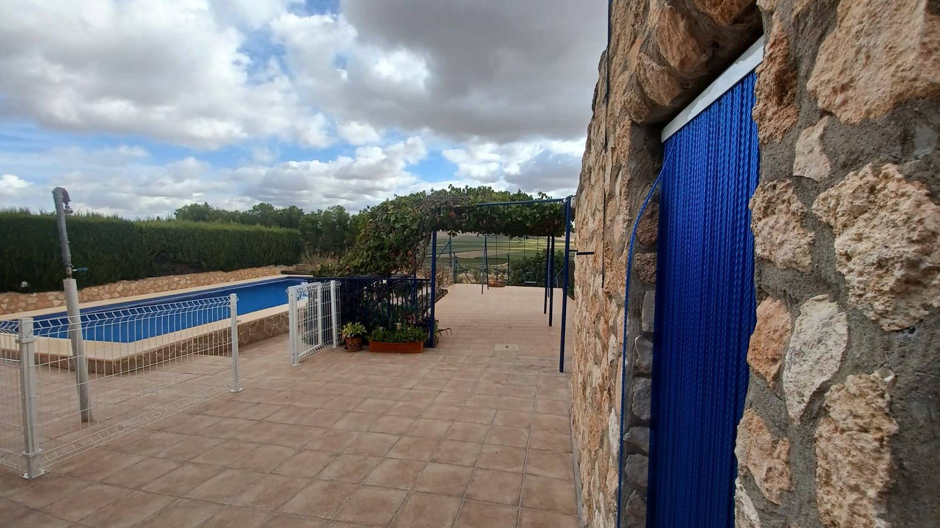 L’entrée principale se fait par un double portail. Une agréable terrasse couverte de vigne vous accueille et vous permet de profiter du soleil matinal. Une grande terrasse mène à la piscine de 9 m x 5 m, rénovée en 2023. L’ensemble de la piscine est clôturé (pour plus de sécurité) et comprend un petit local de rangement de 8 m² où vous pourrez ranger votre mobilier de jardin et où se trouve également le lave-linge. L’eau et l’électricité y sont donc disponibles.